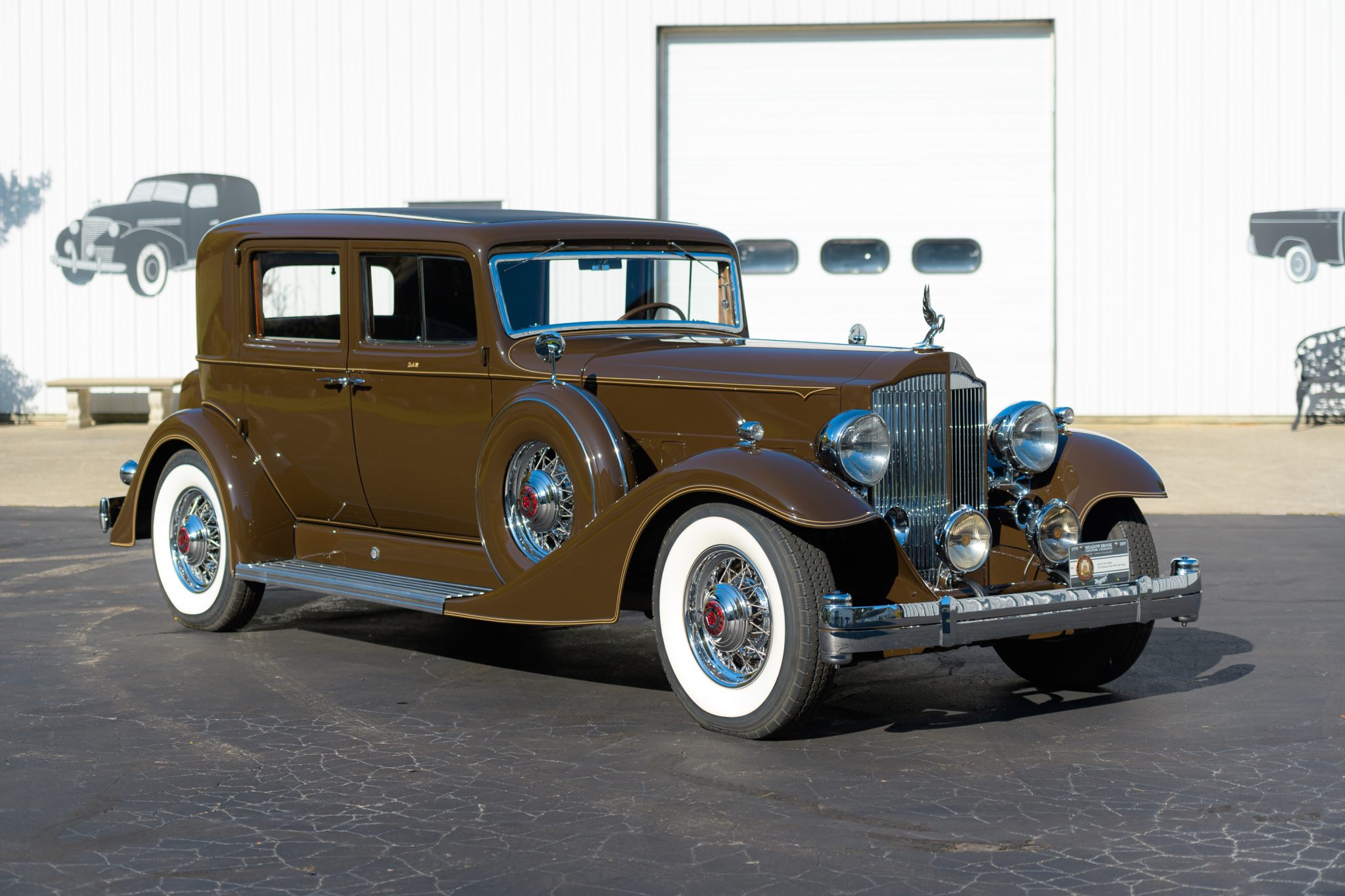 The body is said to have been repainted in black under previous ownership, and was returned to its current shade of brown with cream pinstriping during the refurbishment performed approximately 20 years ago. Features include doors latching at the B pillars, counterweighted bumpers, V-shaped headlight lenses, Trippe driving lights, a body-color radiator shell, thermostatically controlled radiator shutters, a fabric roof panel, and a fold-down rear luggage rack. One of the driving lamps is said to have a burned-out bulb.