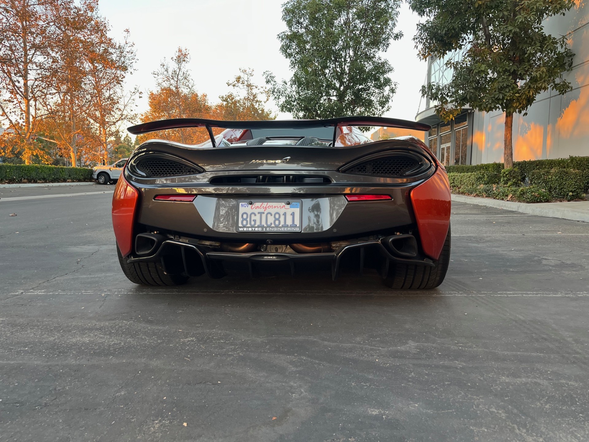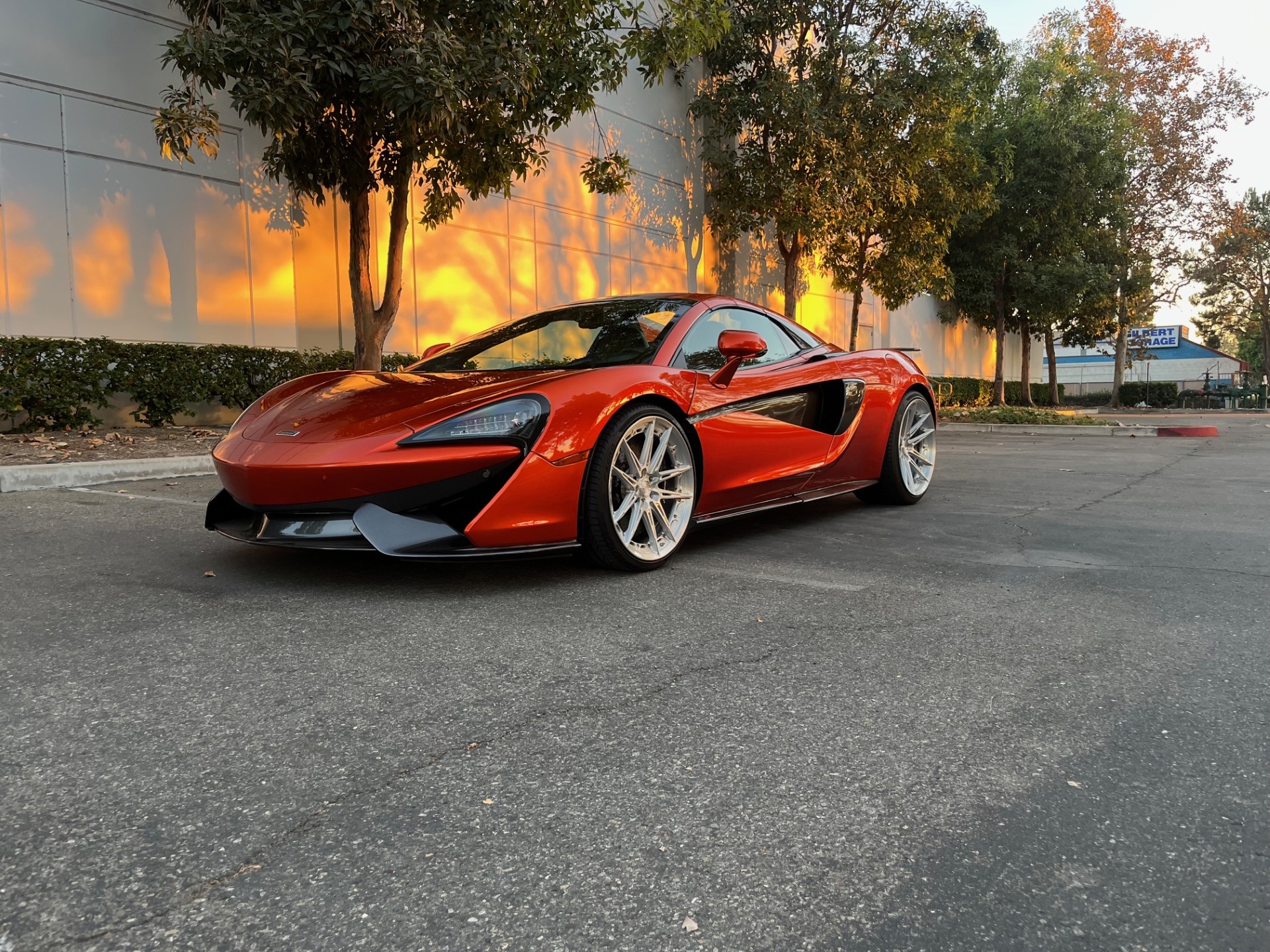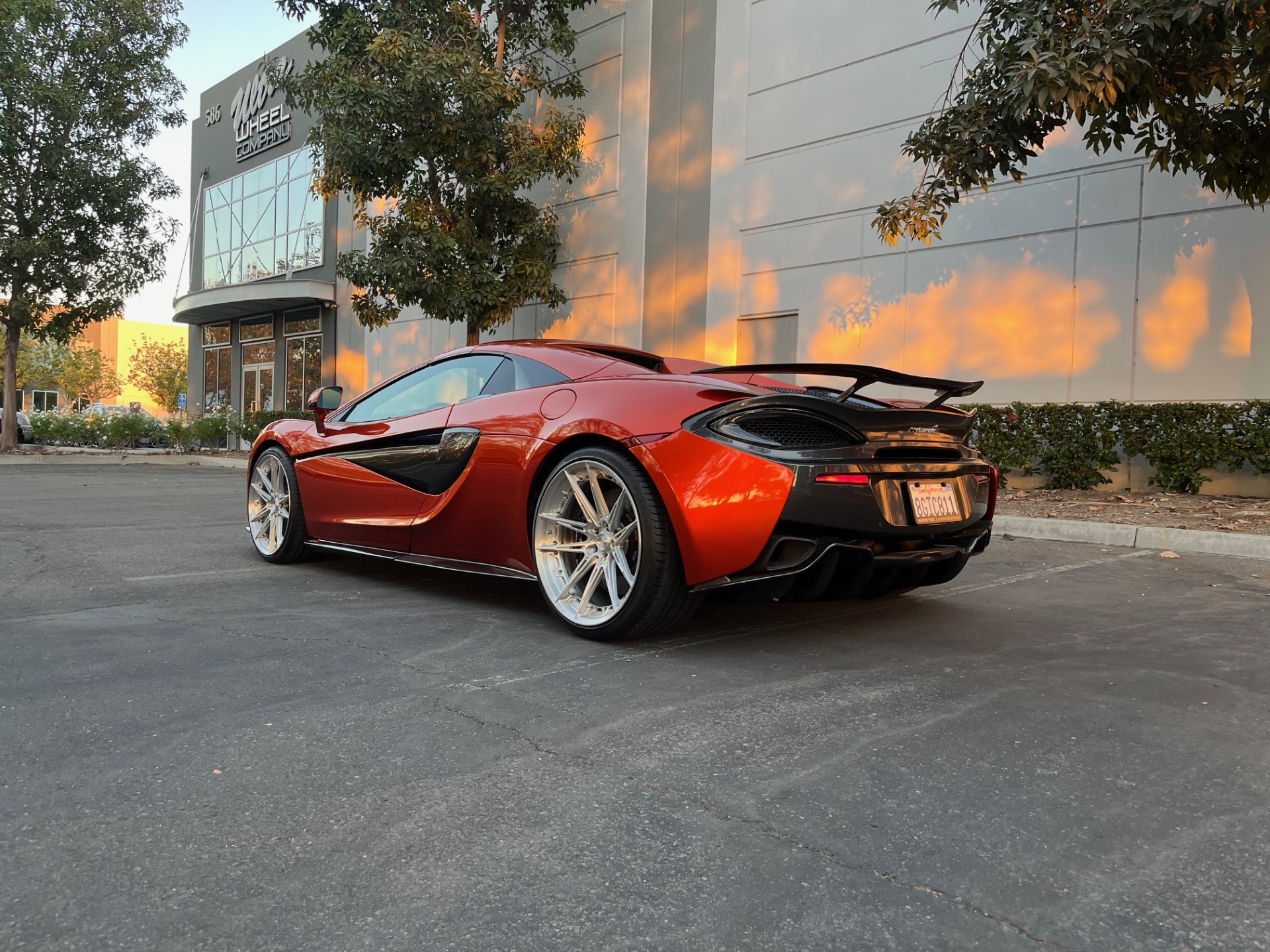 Aftermarket 20″ and 21″ multi-spoke wheels are mounted with Pirelli P Zero tires, and a spare set of wheels and tires is included in the sale. The vehicle is equipped with an active damping suspension, and stopping power is provided by black-finished McLaren-branded calipers over carbon-ceramic rotors at each corner.