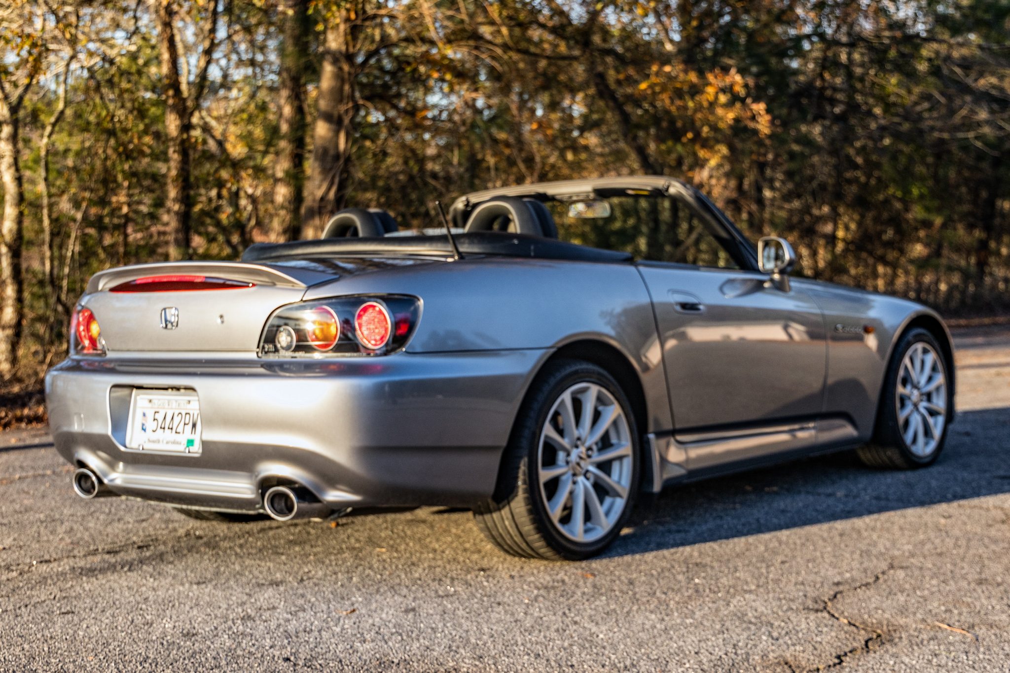 The 17″ 10-spoke wheels have curb damage and are mounted with Velozza tires. The car features double-wishbone suspension and four-wheel disc brakes.