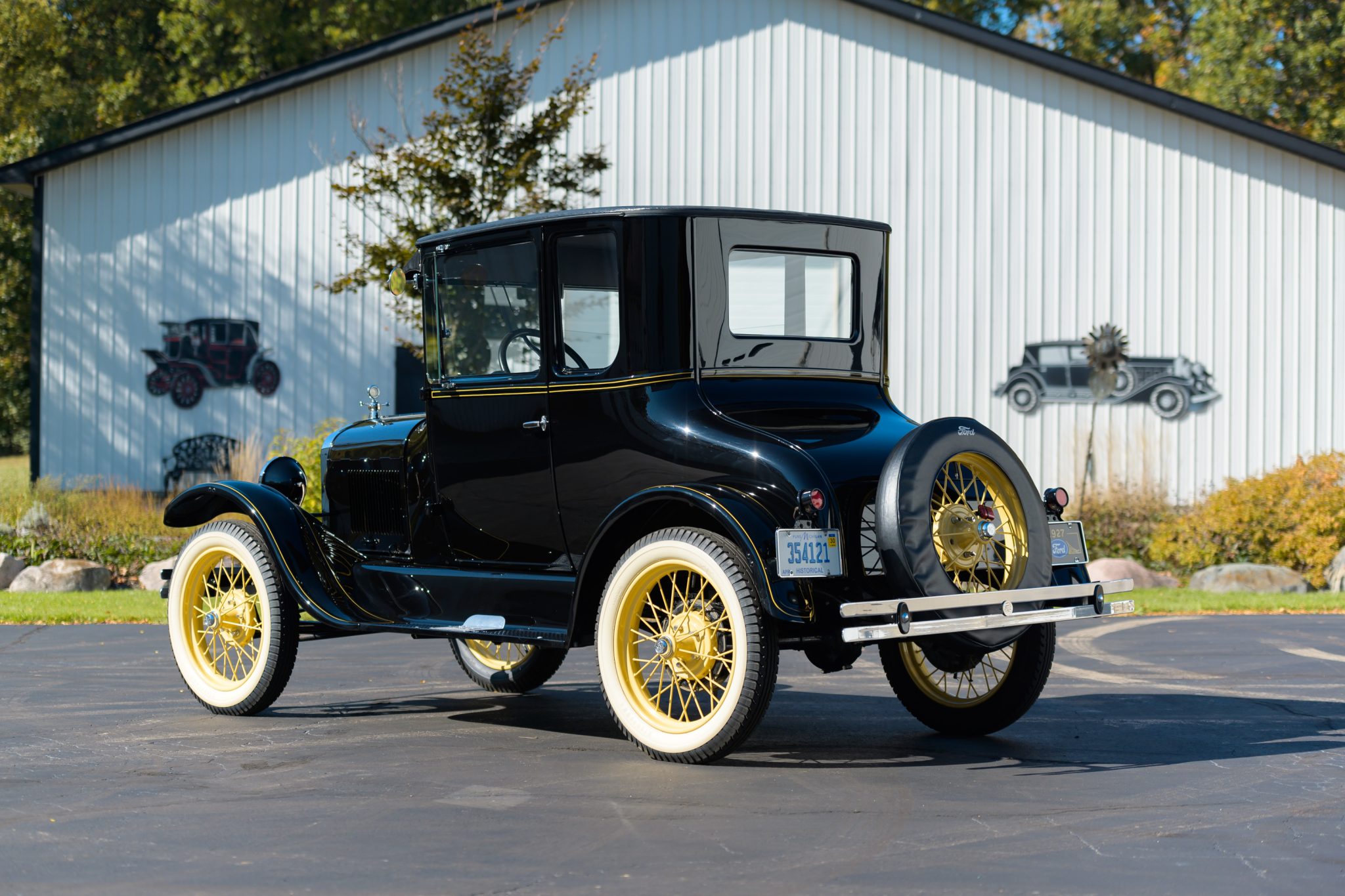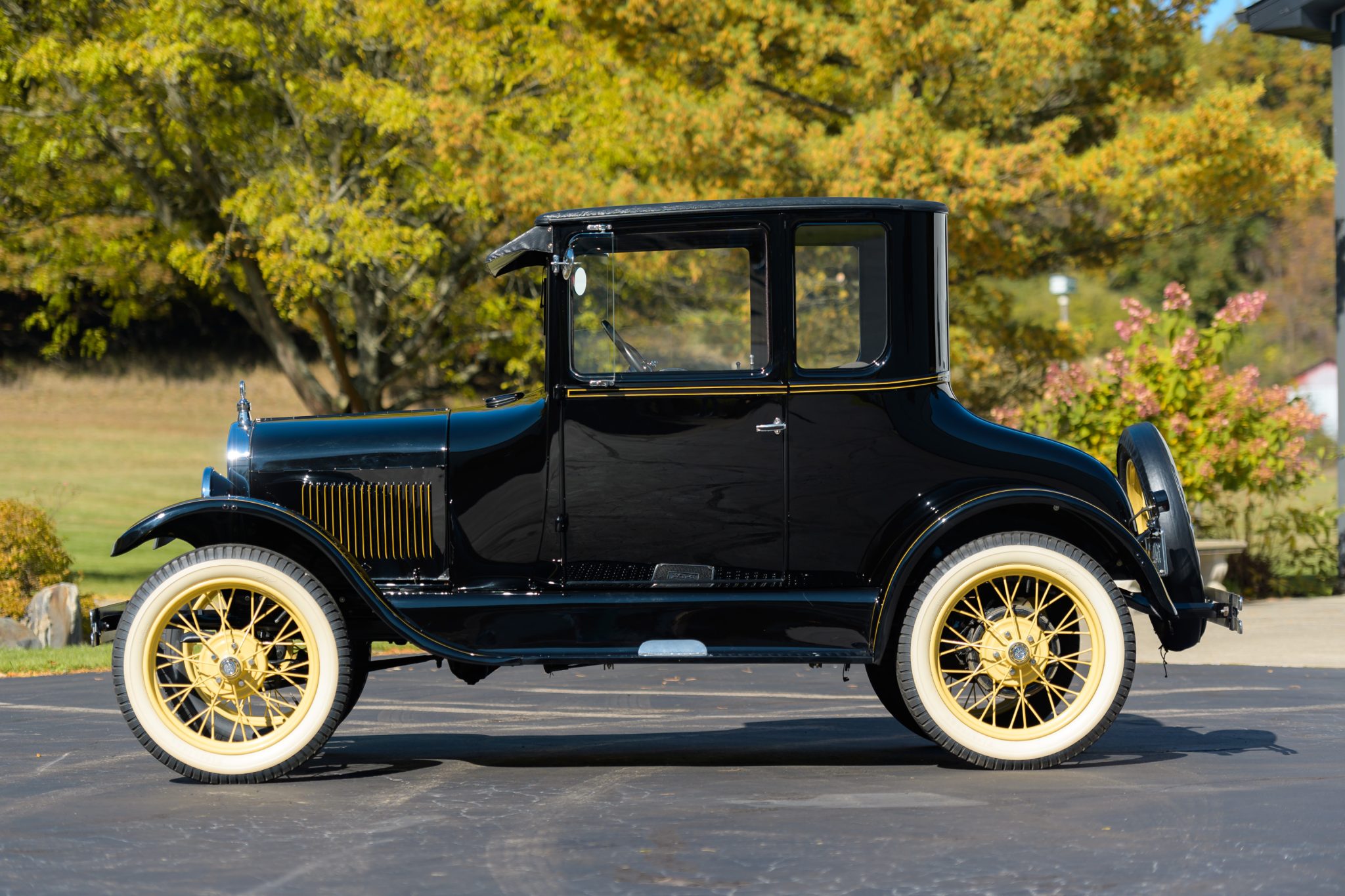 Yellow-painted 21″ wire wheels are mounted with Firestone Gum Dipped wide-whitewall tires measuring 4.40/4.50-21. A matching, covered spare is mounted out back. The car has rear drum brakes.