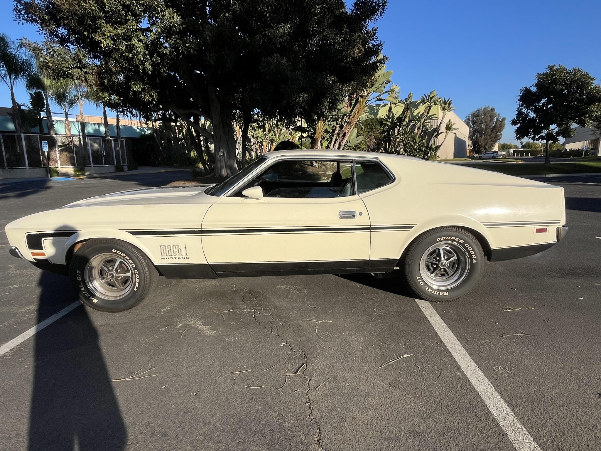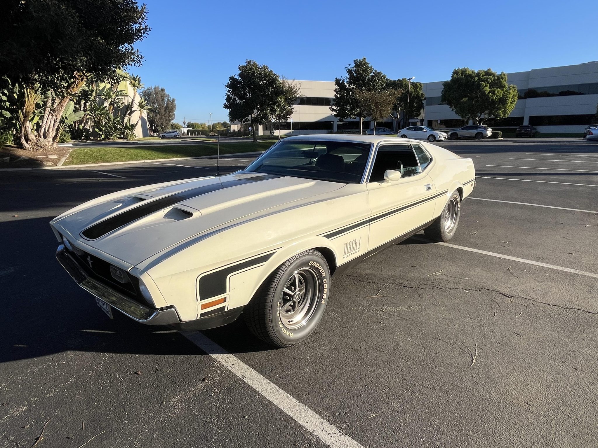 The 14″ Magnum 500–style wheels are mounted with Cooper Cobra white-letter tires. Braking is handled by power-assisted front discs paired with rear drums, and the brake master cylinder is said to have been replaced in 2024.