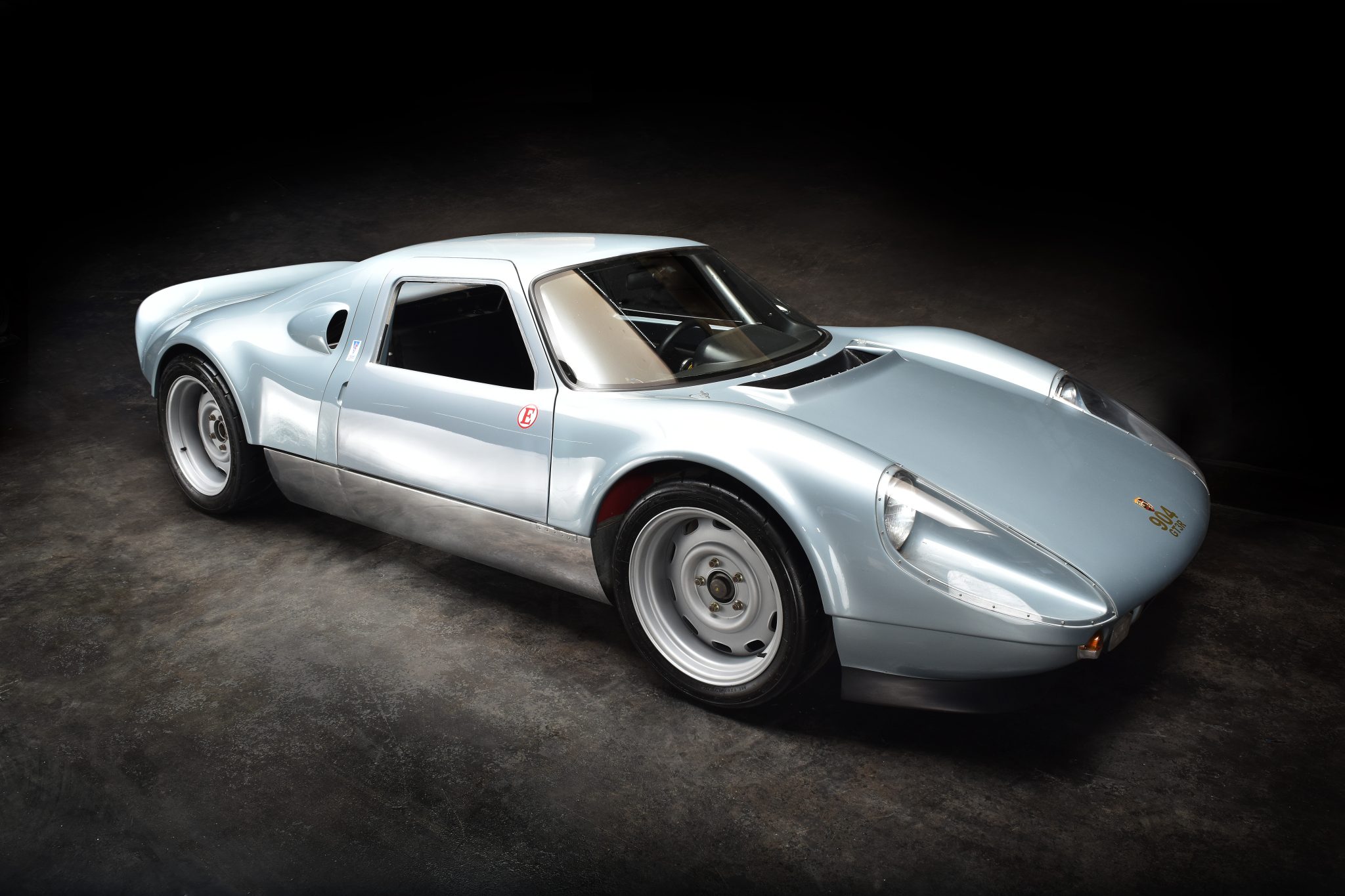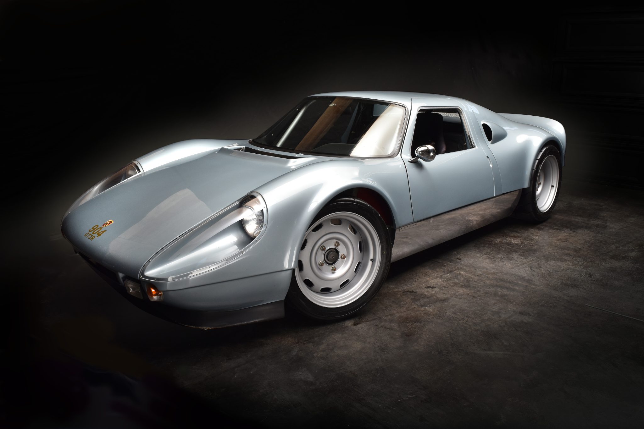 The car is finished in blue, and details include covered headlights, fog lights, a bullet-style side mirror, and dual exhaust outlets. Gold “904 GT3R” decals have been applied to the nose and right-rear corner. The driver-side door does not have a window, and paint chips on the left fender and spoiler are shown up close in the gallery.