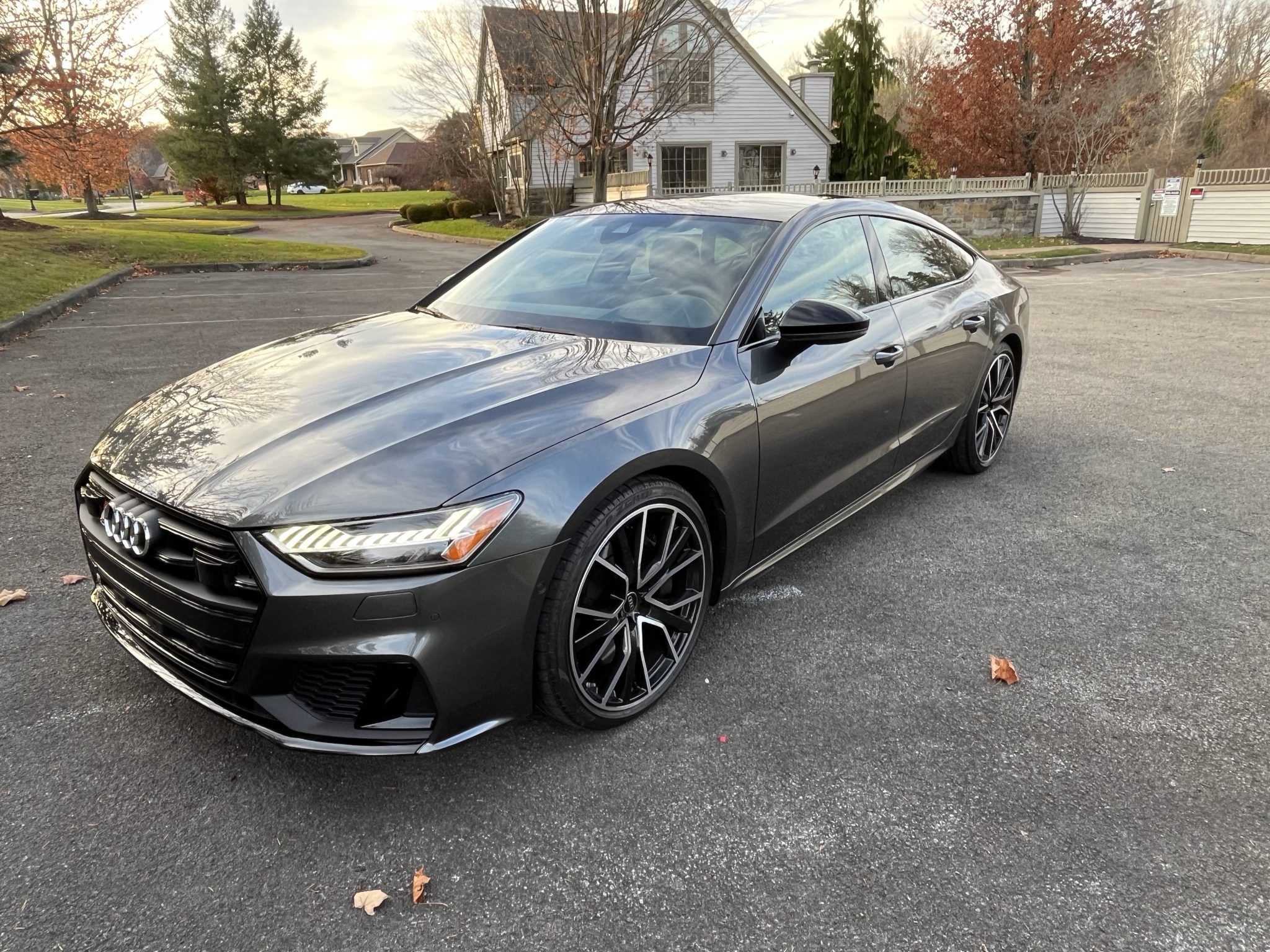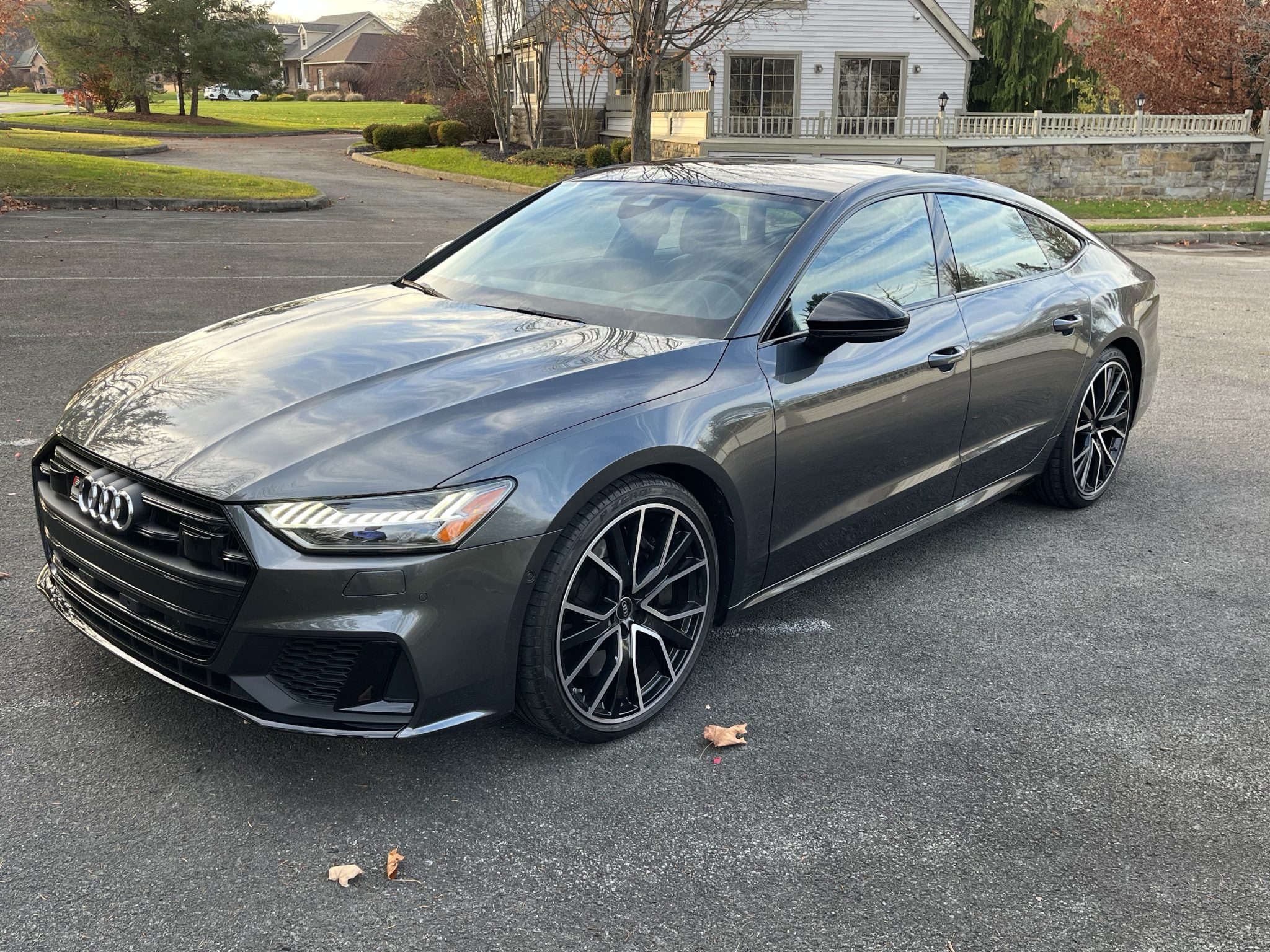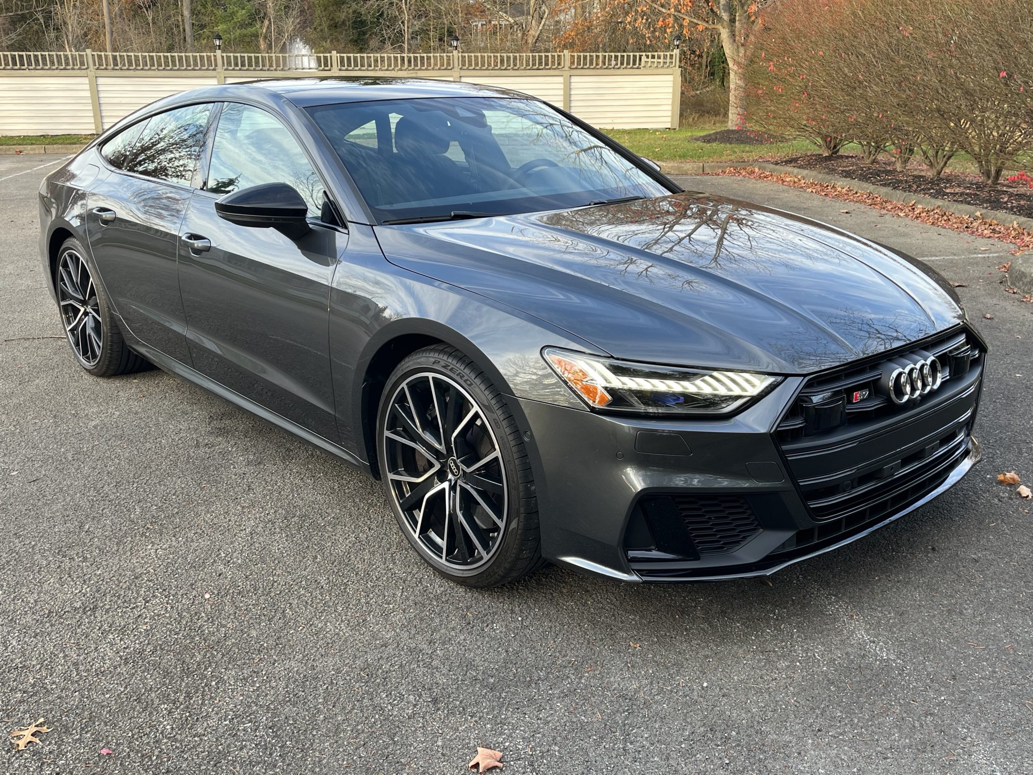The 21″ V-spoke wheels are wrapped in 255/35 Pirelli P Zero tires. The car rides on a sport-tuned adaptive air suspension, and braking is handled by four-wheel vented discs with six-piston front calipers.