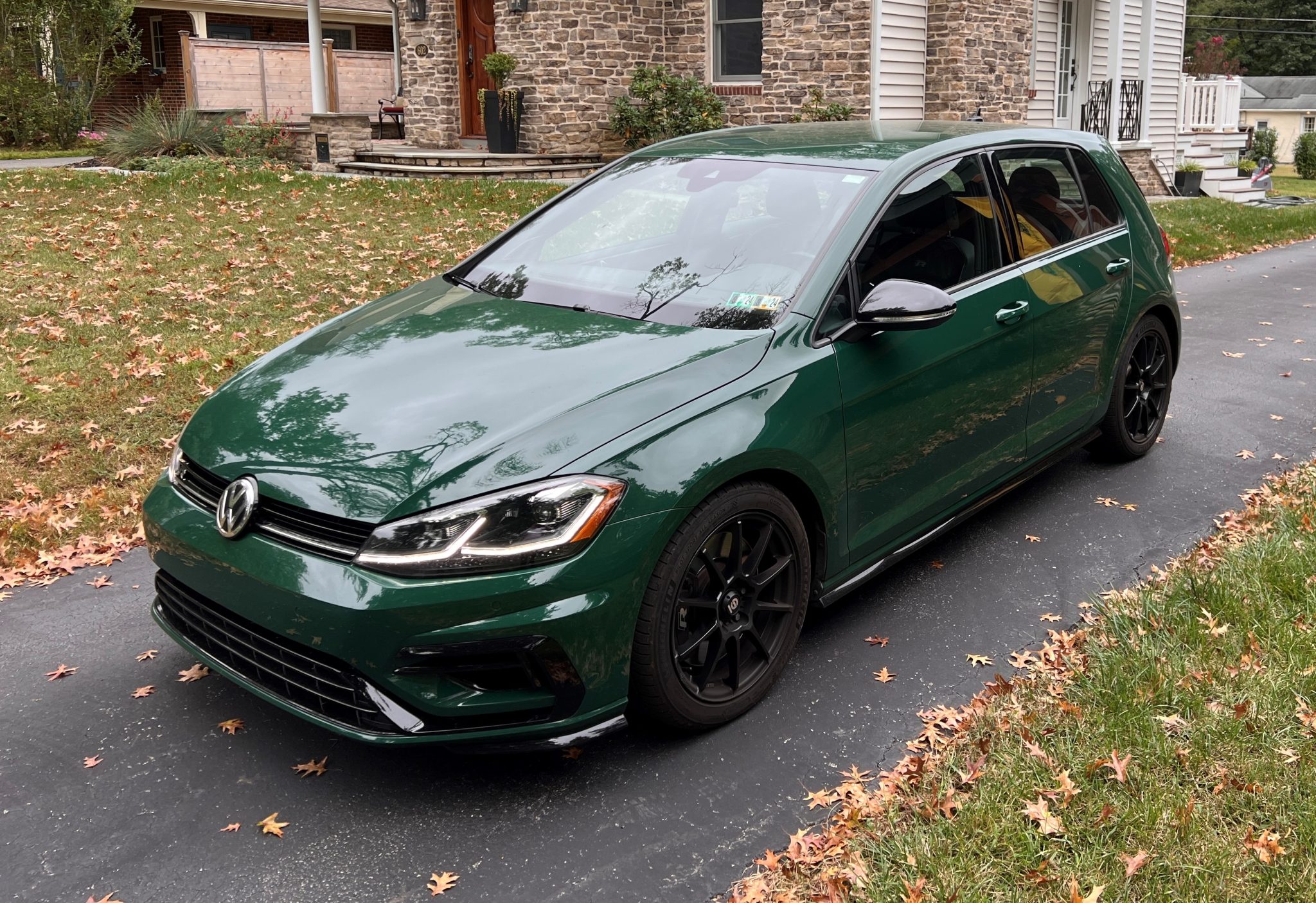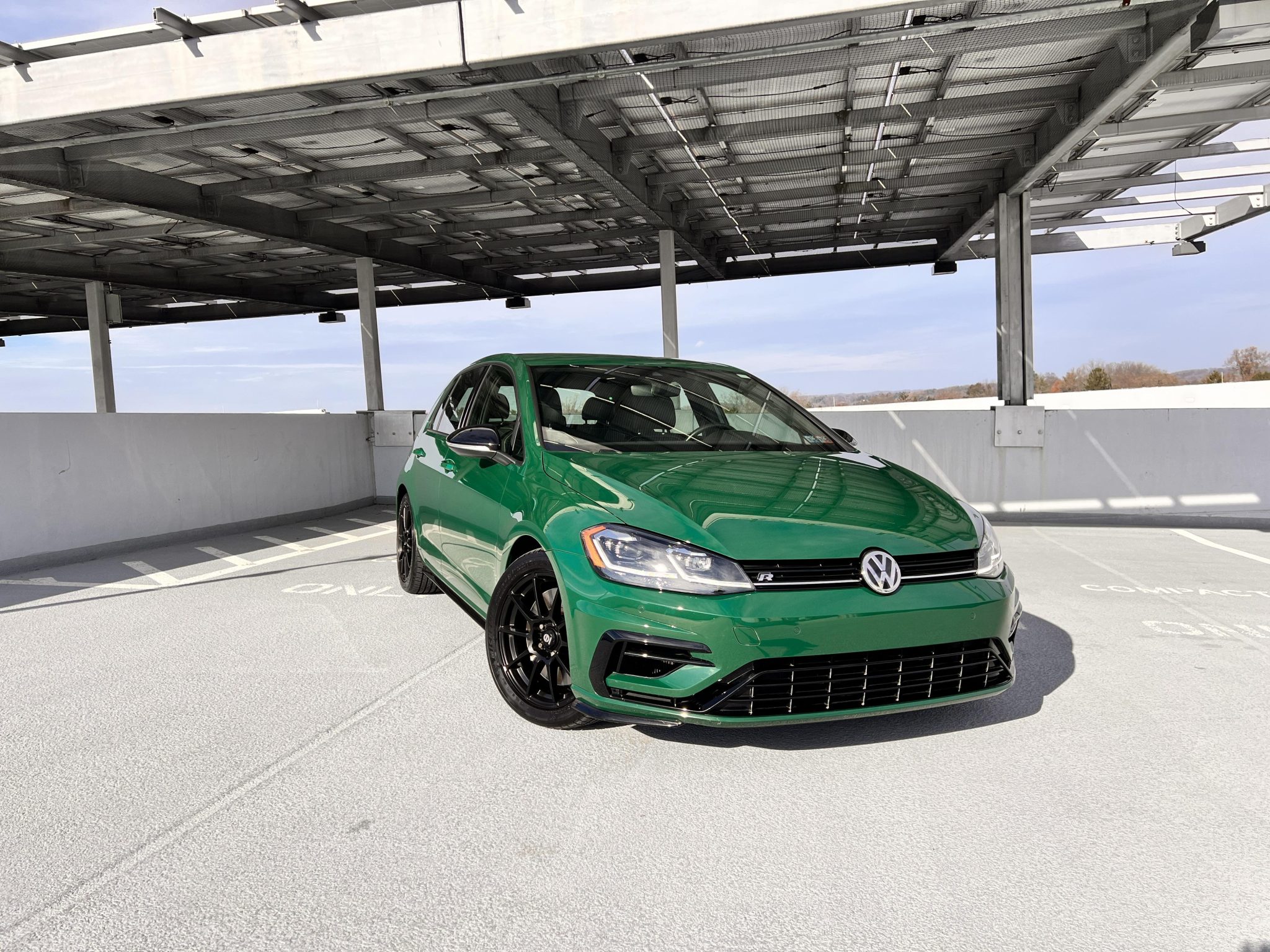 Black 17″ Sparco alloy wheels are mounted with 225/45 Michelin Pilot Sport All Season 4 tires. The car is equipped with four-mode Dynamic Chassis Control (DCC) adaptive dampers, and stopping power is provided by ventilated disc brakes with Golf R-branded front calipers.