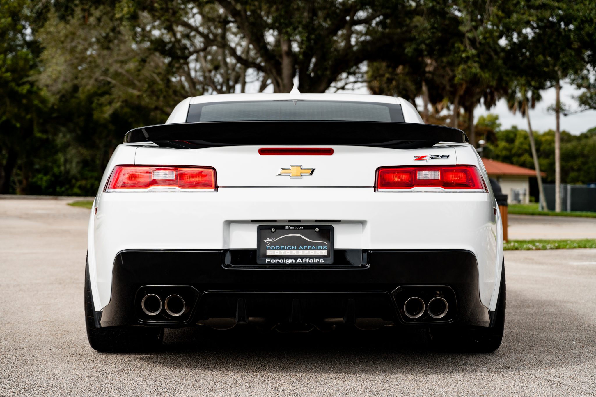 Black-finished 19″ Y-spoke forged alloy wheels are mounted with 305/30 Pirelli P Zero Trofeo R tires. The car is equipped with a fully independent suspension, spool-valve dampers, Performance Traction Management, and Z/28-branded Brembo calipers over carbon-ceramic rotors.