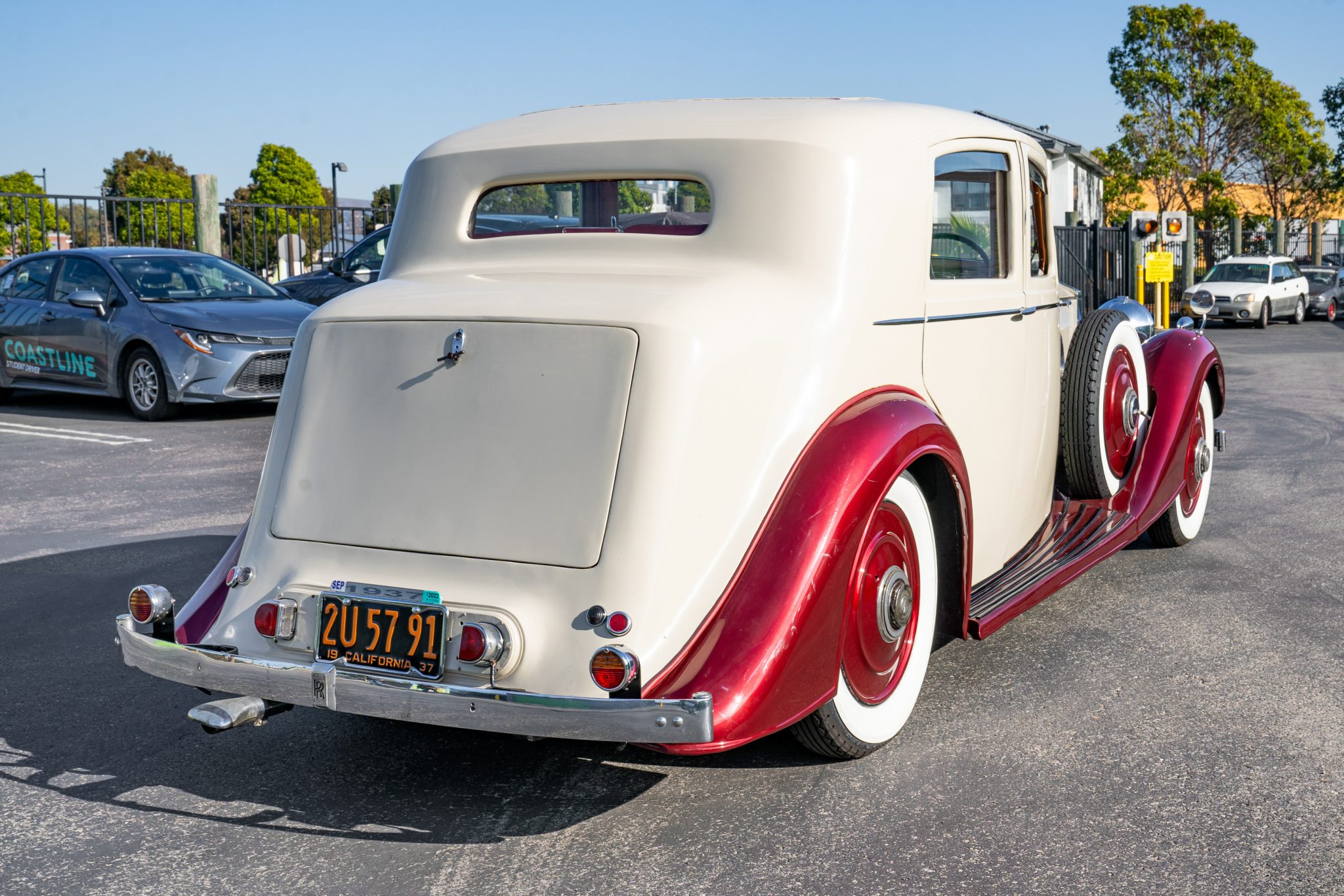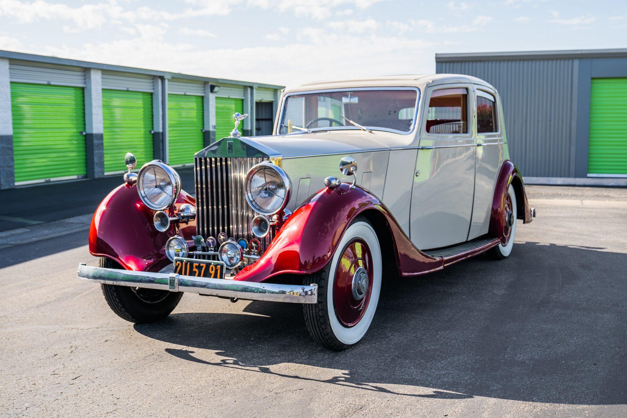 Disc wheels wear metallic red paint and Rolls-Royce-branded center caps, and they are mounted with 6.00/6.50–19 BFGoodrich Silvertown bias-ply whitewall tires. A matching spare wheel is stowed in the right-front fender. Suspension incorporates semi-elliptical leaf springs and hydraulic shock absorbers, the latter of which are designed to allow adjustment to preferred firmness via a manette on the steering wheel hub. Stopping power is provided by servo-assisted mechanical drums.
