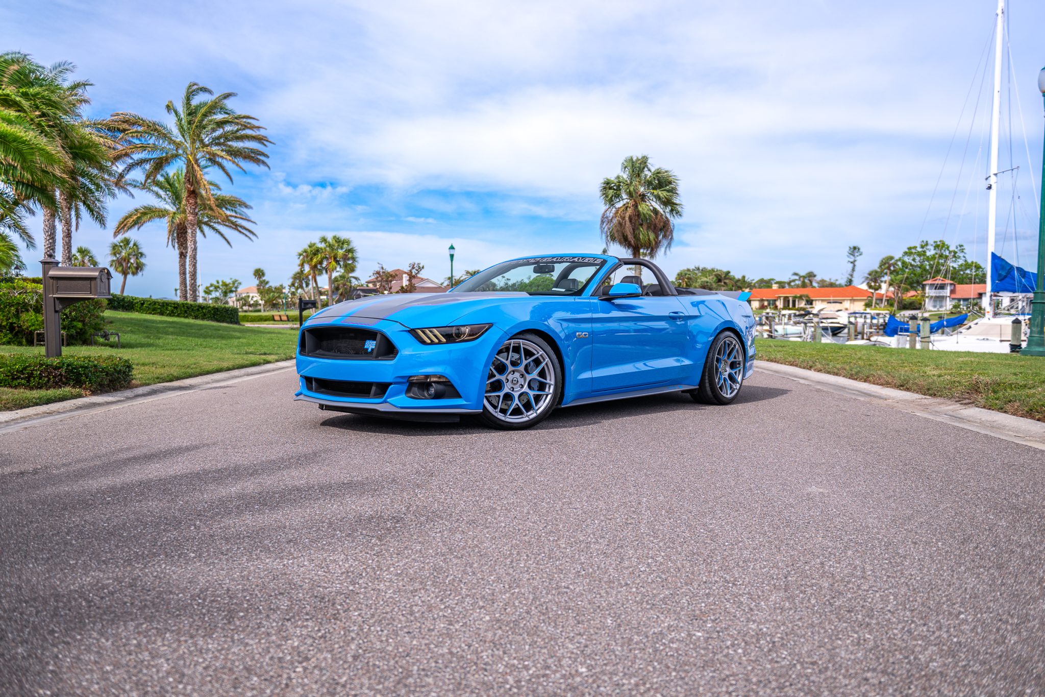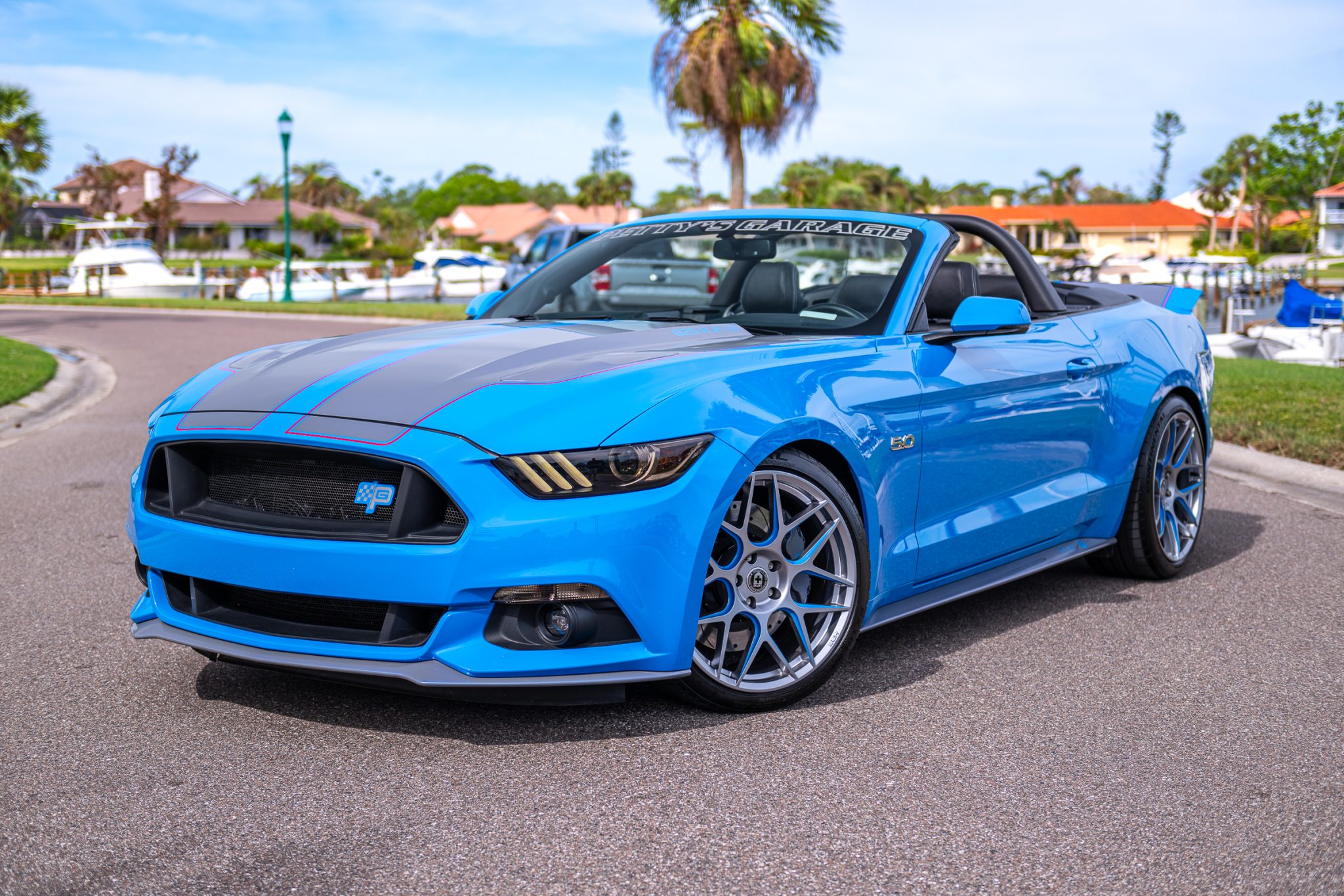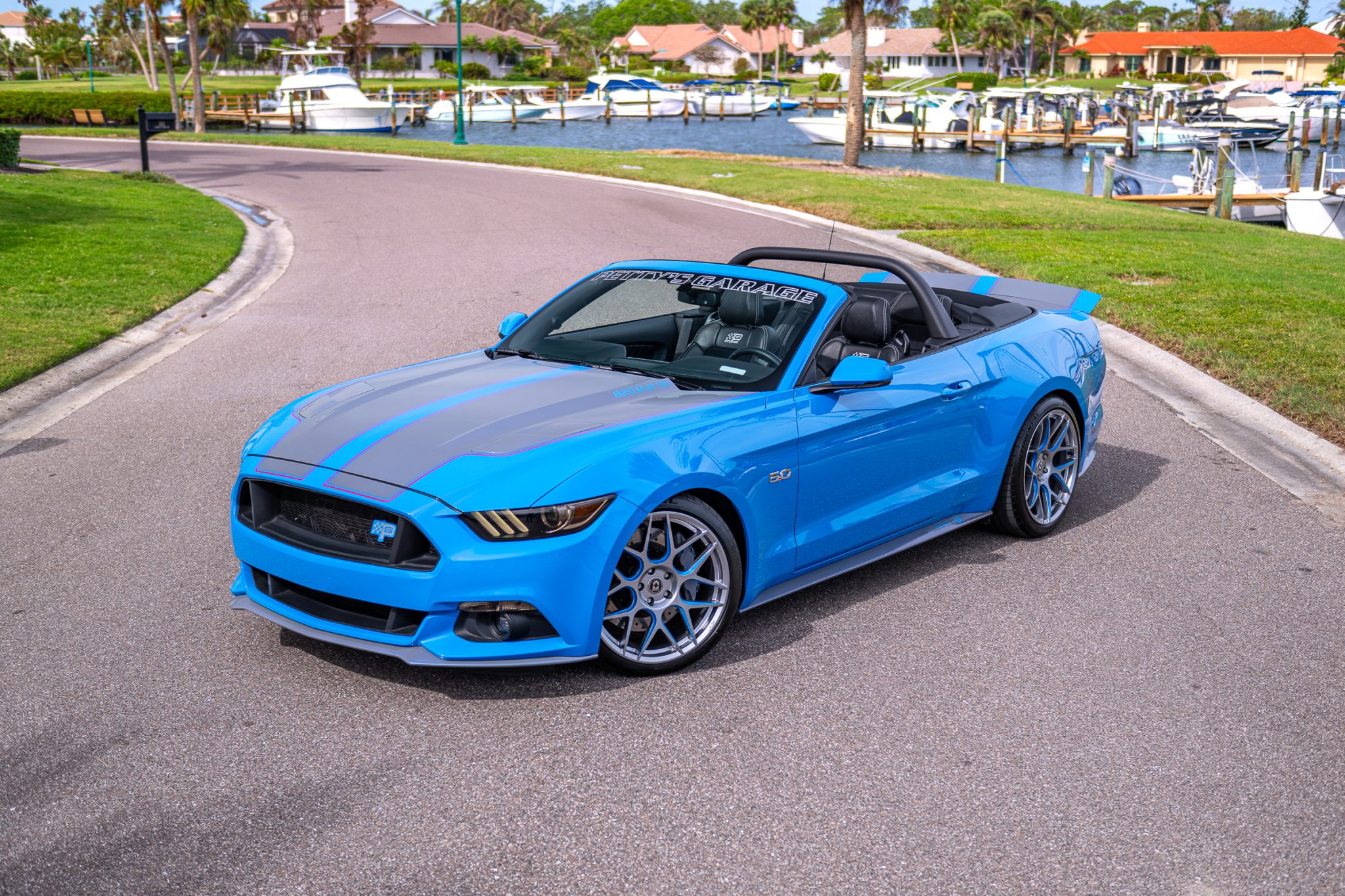 The 20″ HRE wheels are mounted with Continental ExtremeContact tires measuring 255/35 up front and 275/35 out back. The car features Petty’s Garage lowerings springs, adjustable sway bars, and a wheel hop reduction kit, and stopping power is provided by Wilwood calipers and drilled disc brakes fitted at each corner.