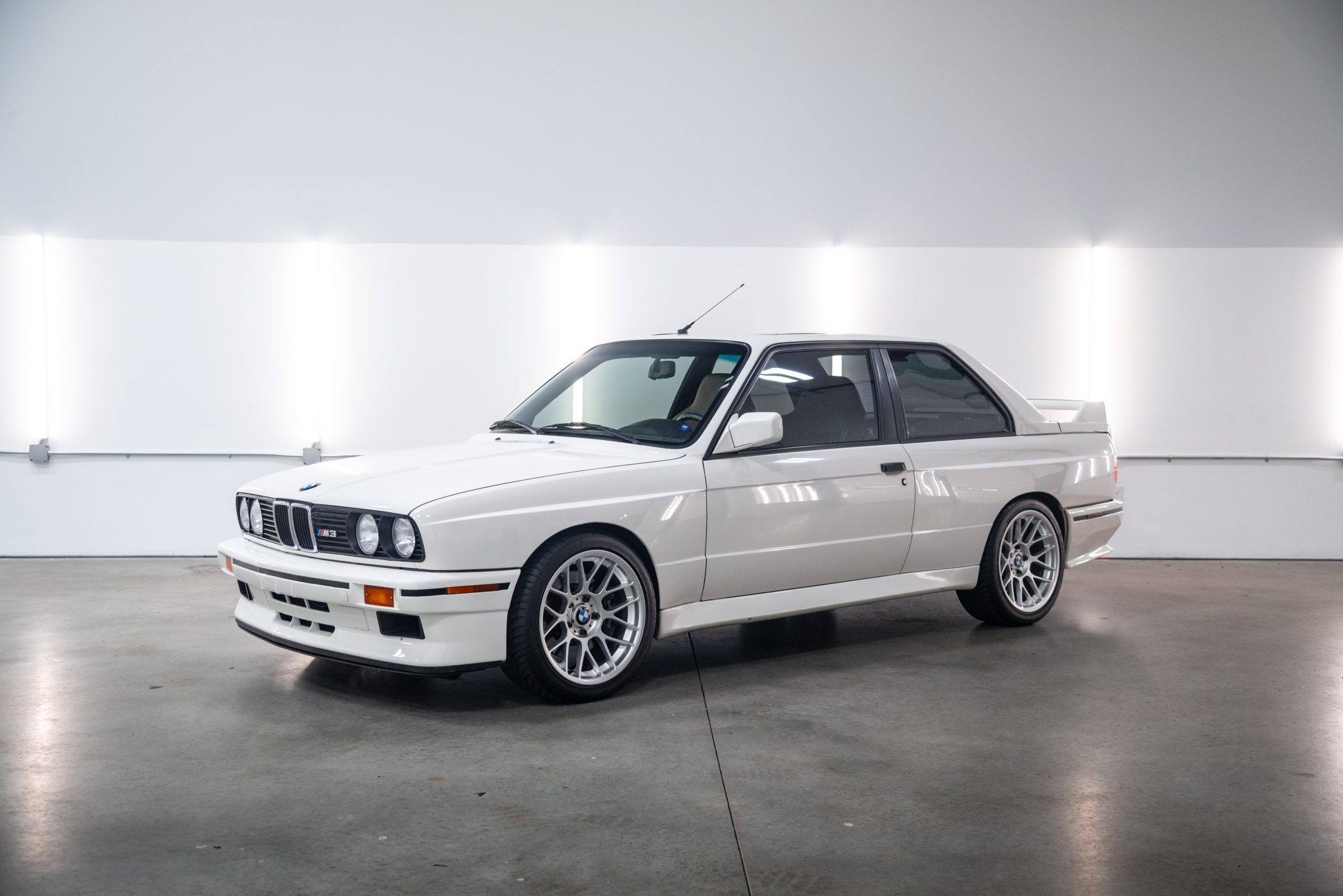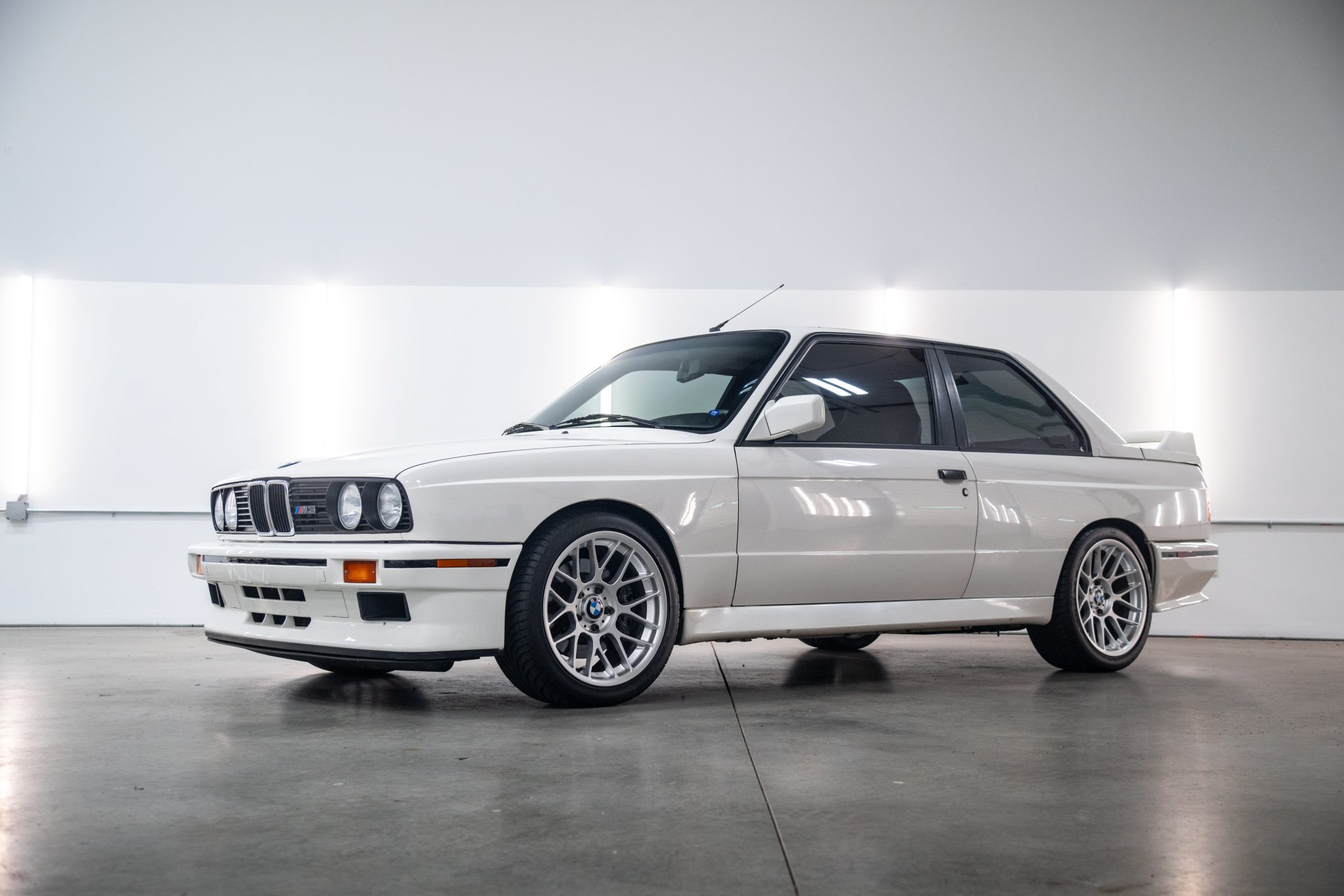 Silver-finished 17″ multi-spoke wheels are mounted with 235/40 Sumitomo HTR ZIII tires. Wilwood brake calipers are fitted over slotted front and cross-drilled rear discs, and a Dinan front sway bar is noted.