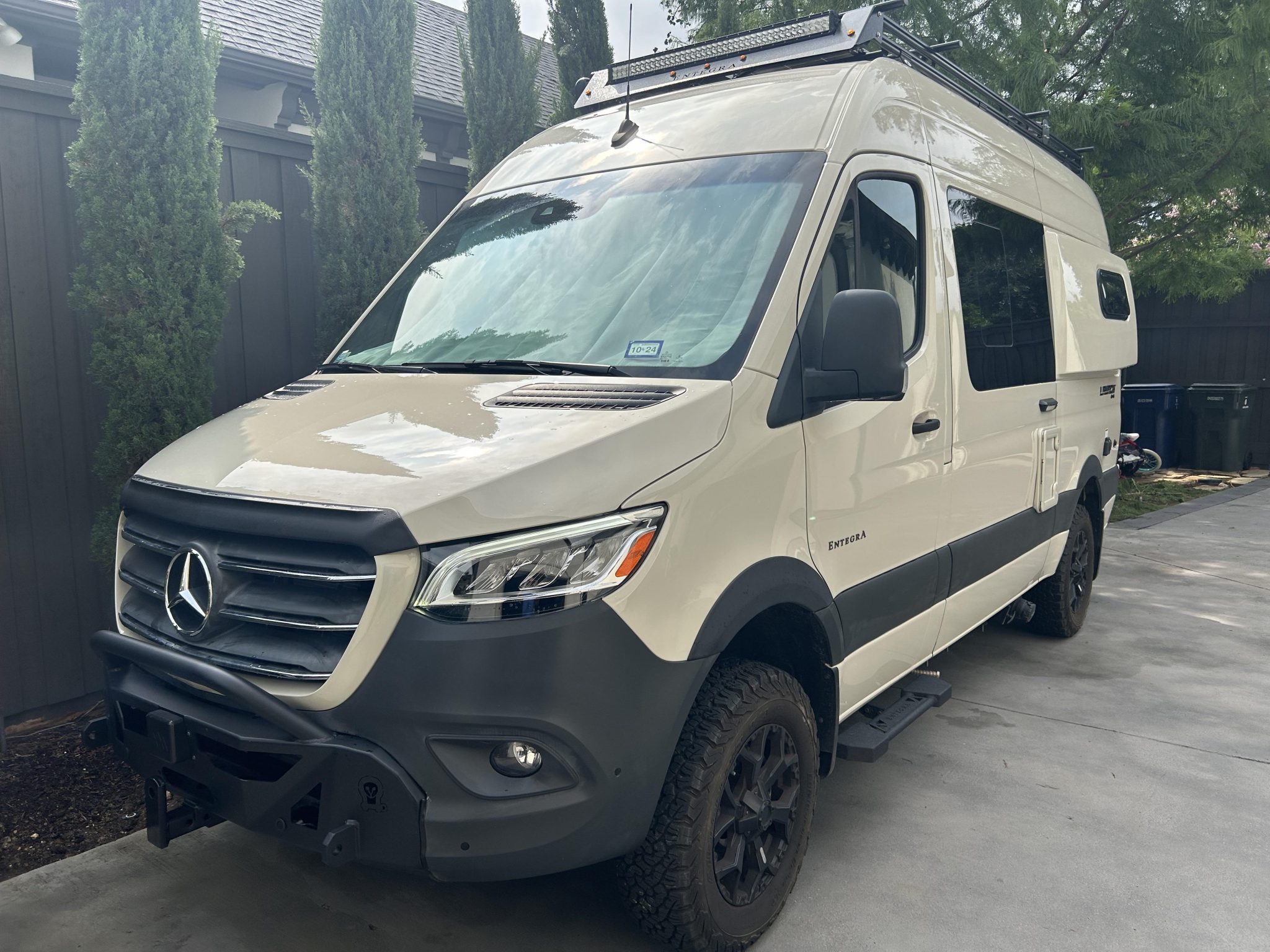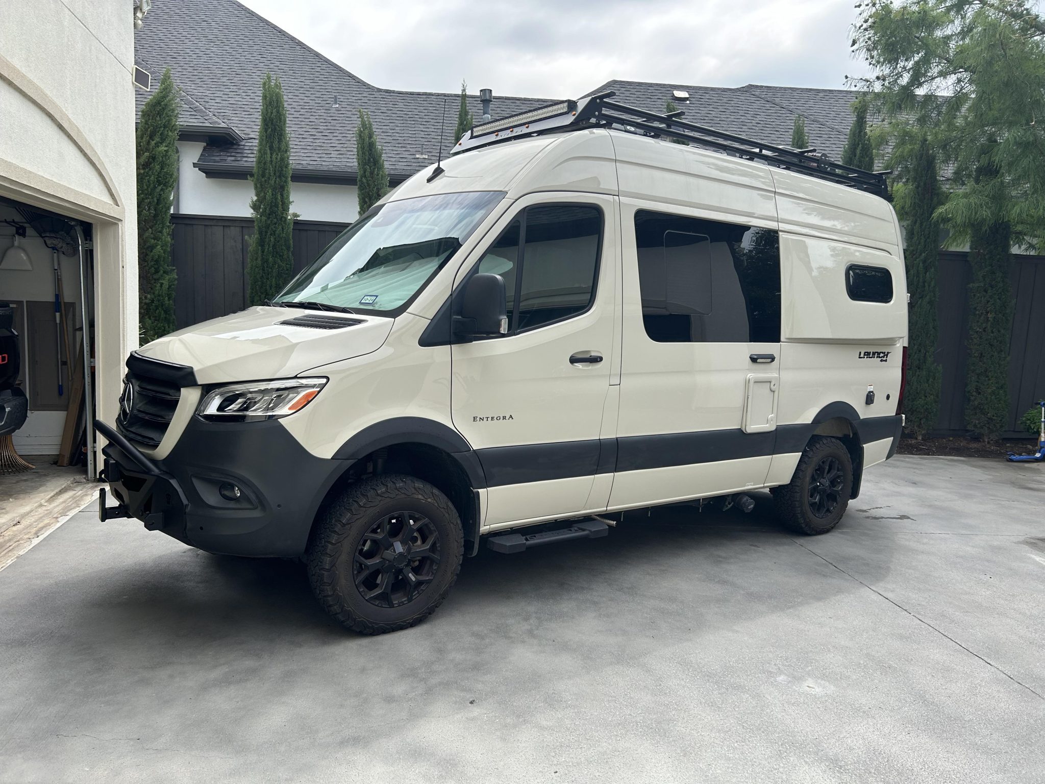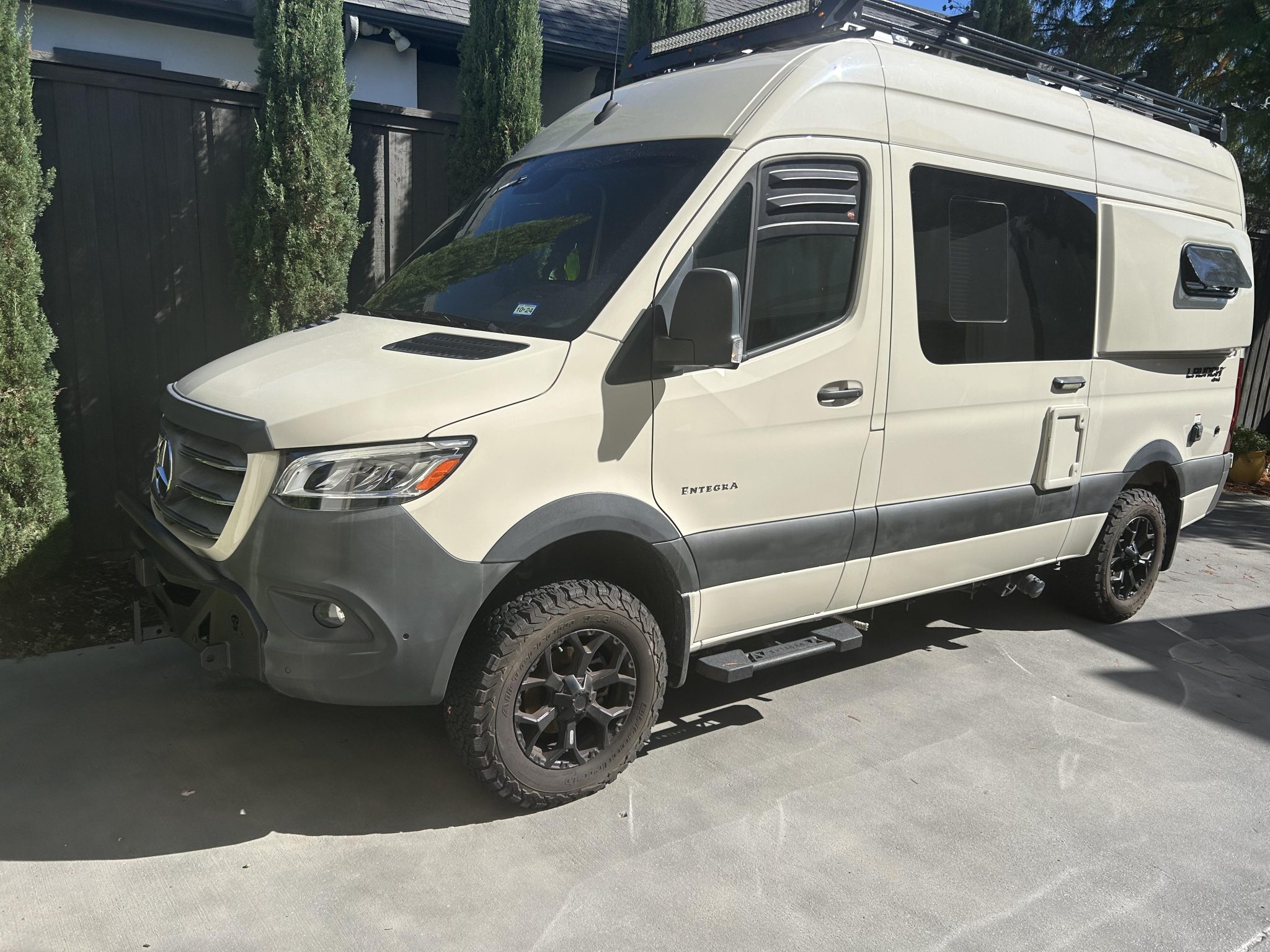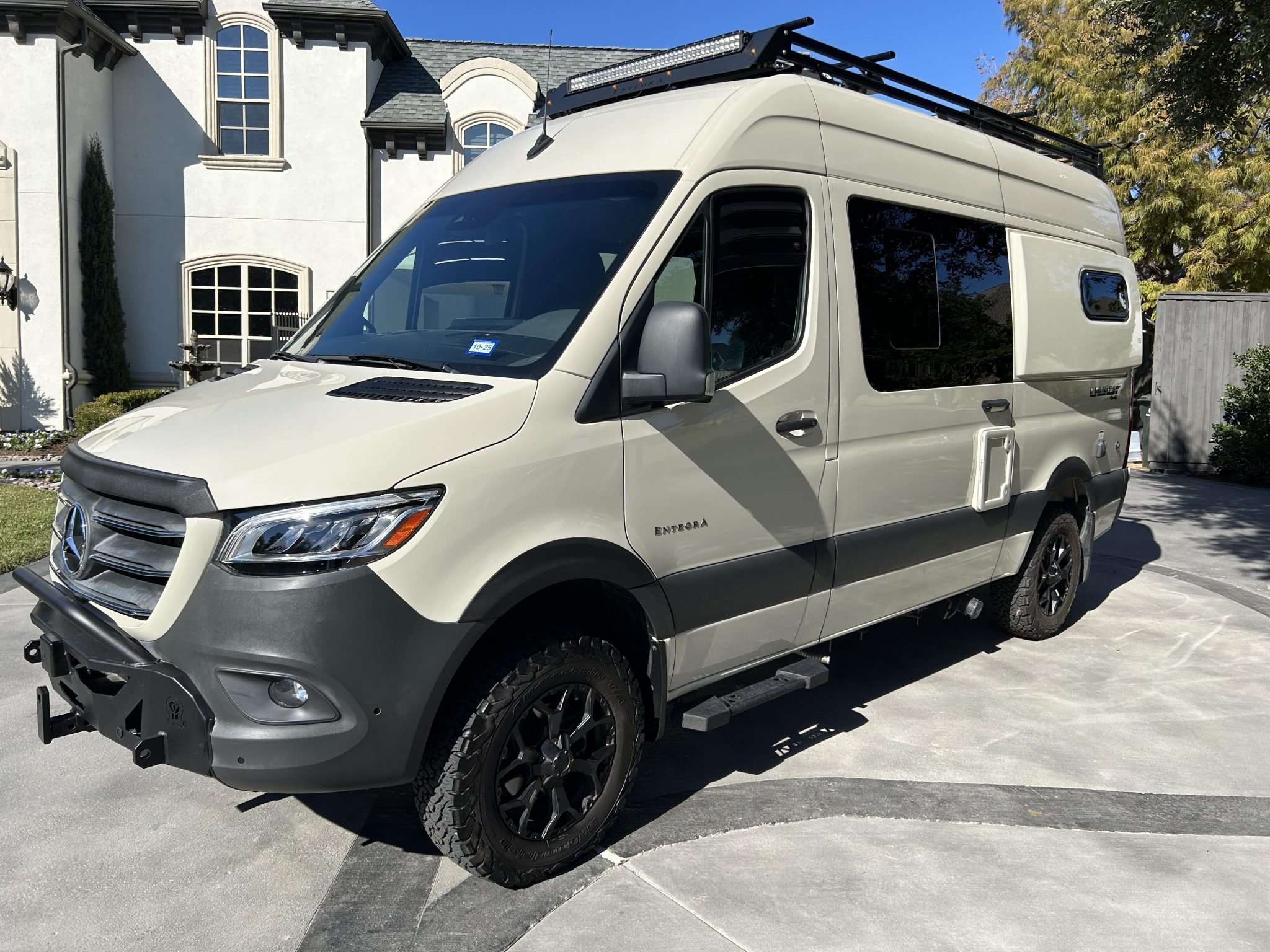 Black-finished 17″ wheels are mounted with BFGoodrich All-Terrain T/A KO2 tires, and a matching spare is housed under the van. The Customer Value Package specified Koni shocks and a heavy-duty rear stabilizer bar, and the van rides on independent front suspension and a solid rear axle. The chassis is equipped with an Electronic Stability Program (ESP).
