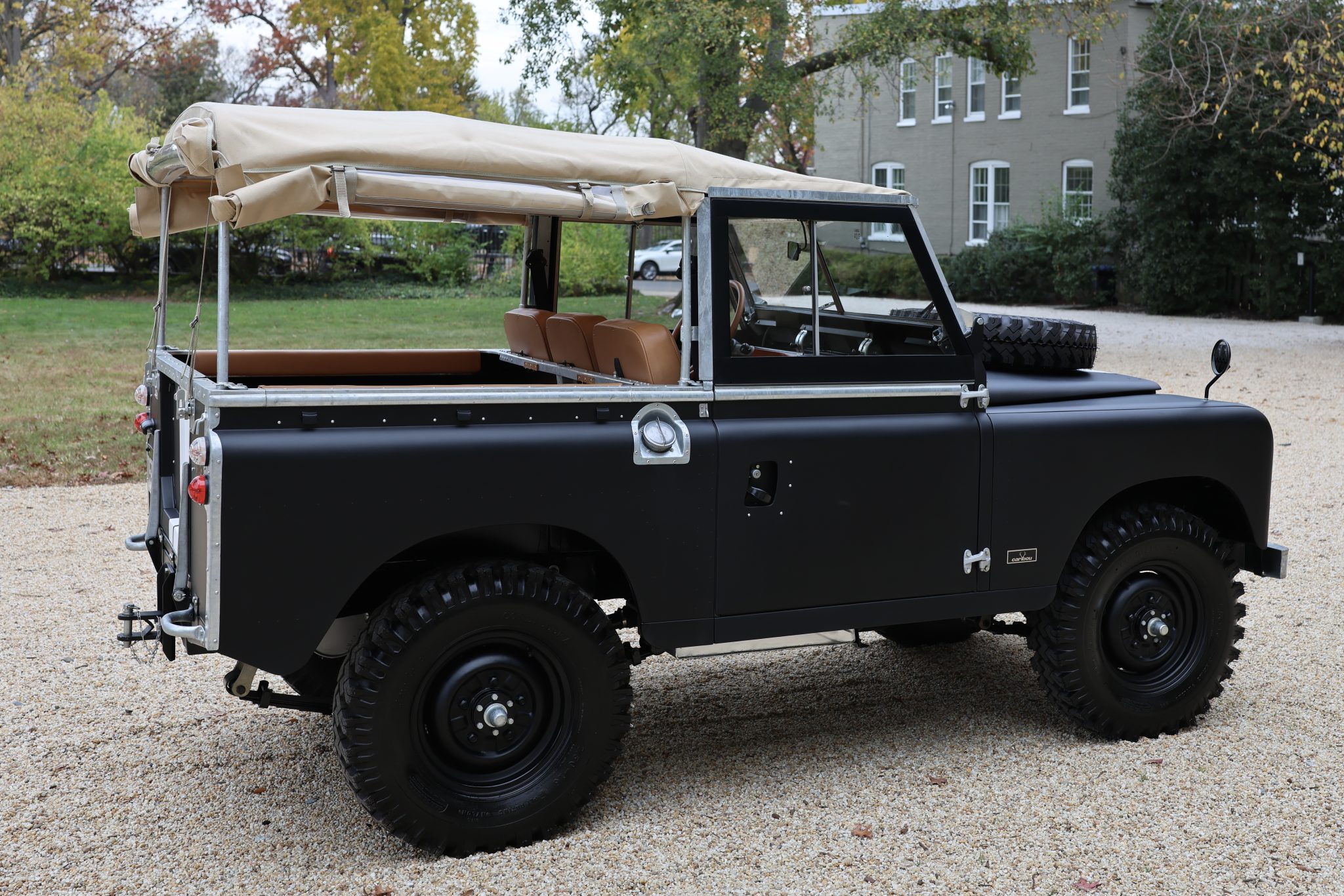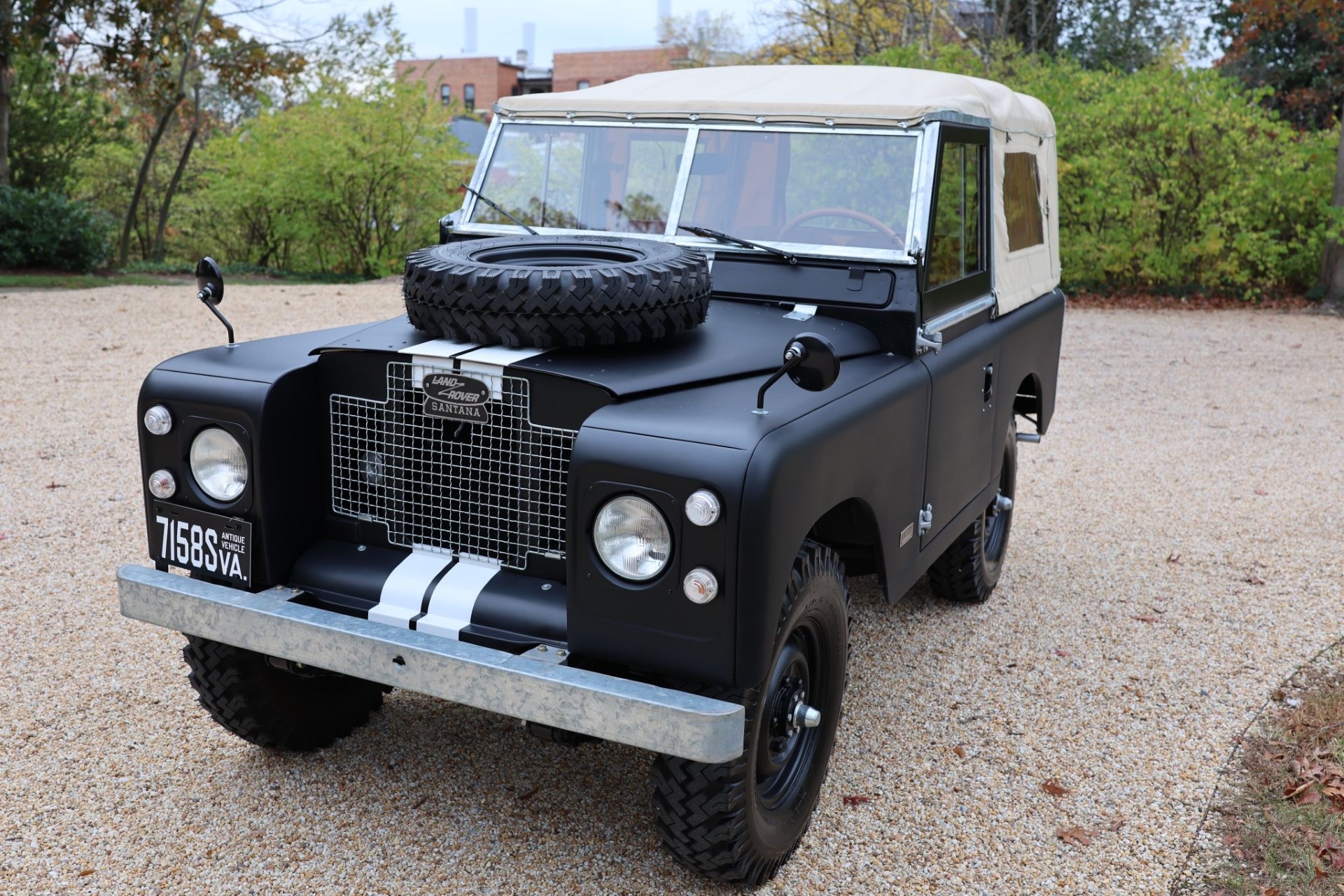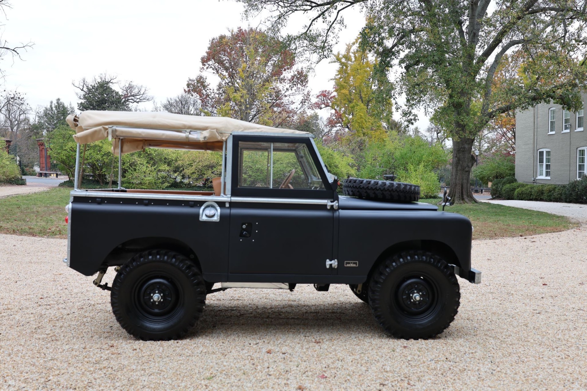 Black-finished 16″ steel wheels are mounted with 7.5-series Lima Caucho tires, and a spare is mounted to the hood. The suspension and four-wheel drum brakes were overhauled as part of the refurbishment.