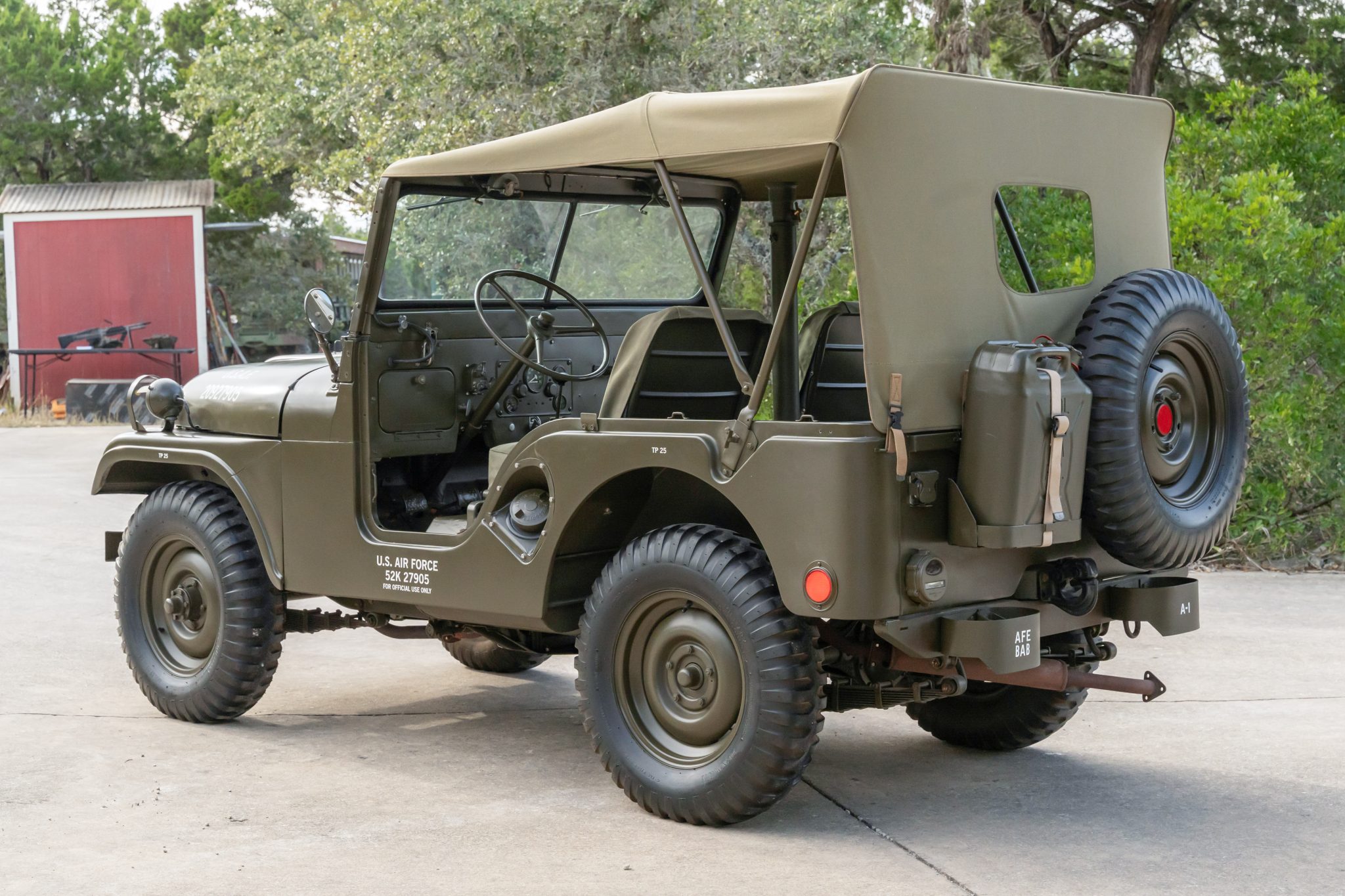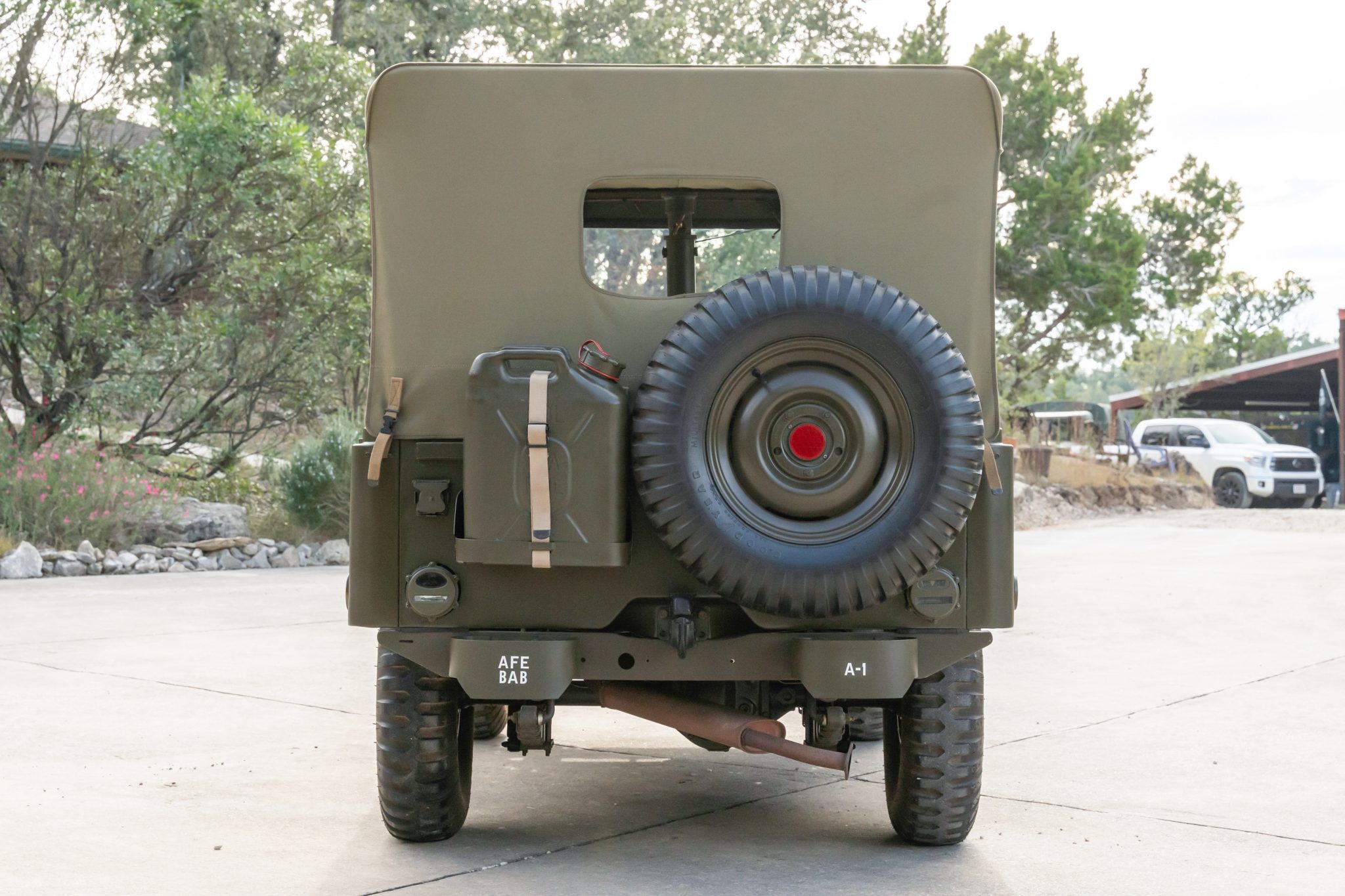 The body-color 16″ steel wheels are mounted with Denman Military tires. Braking is handled by drums at each corner.