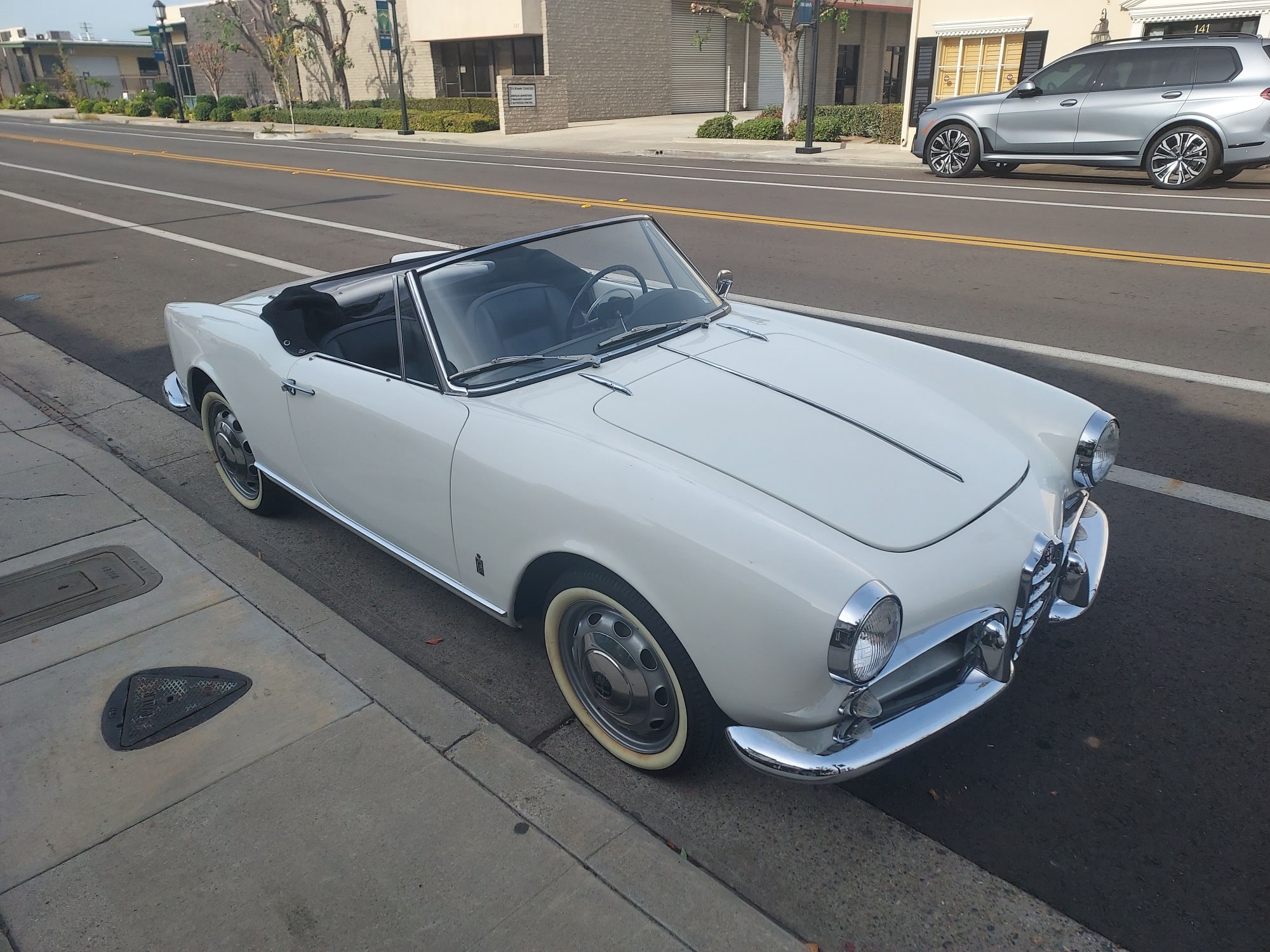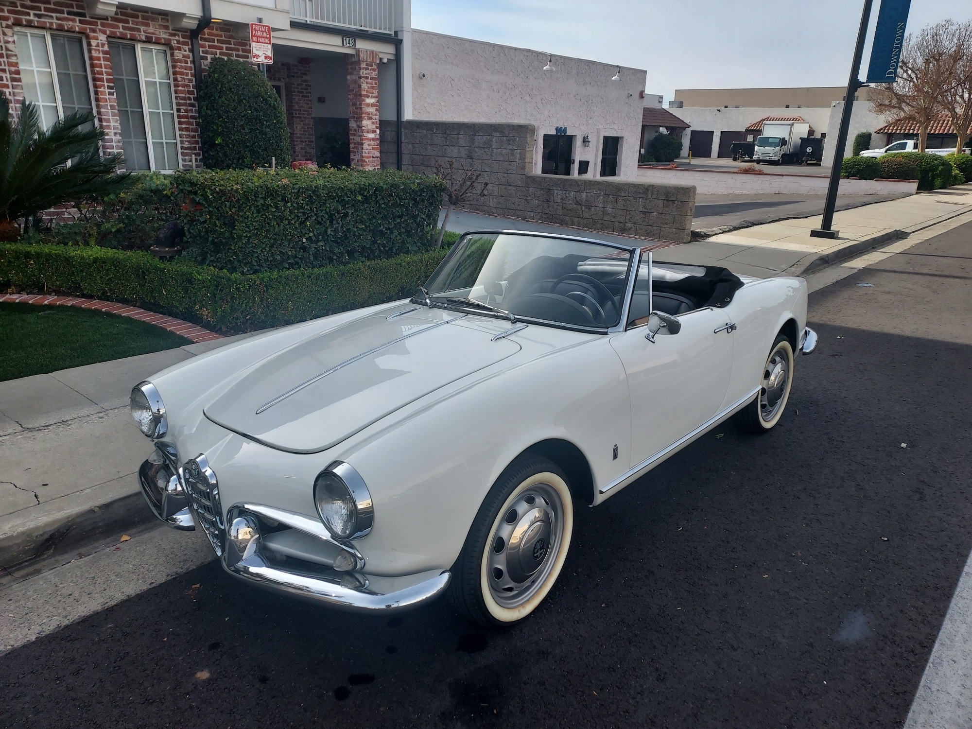 Silver 15” Fergat-style wheels feature Alfa Romeo–branded hubcaps and are mounted with radial tires wearing Atlas Portawall whitewall inserts. Stopping power is provided by four-wheel drum brakes with finned front units. Corrosion is visible on the wheels. The rear brake hose and both wheel cylinders were replaced in preparation for the sale.