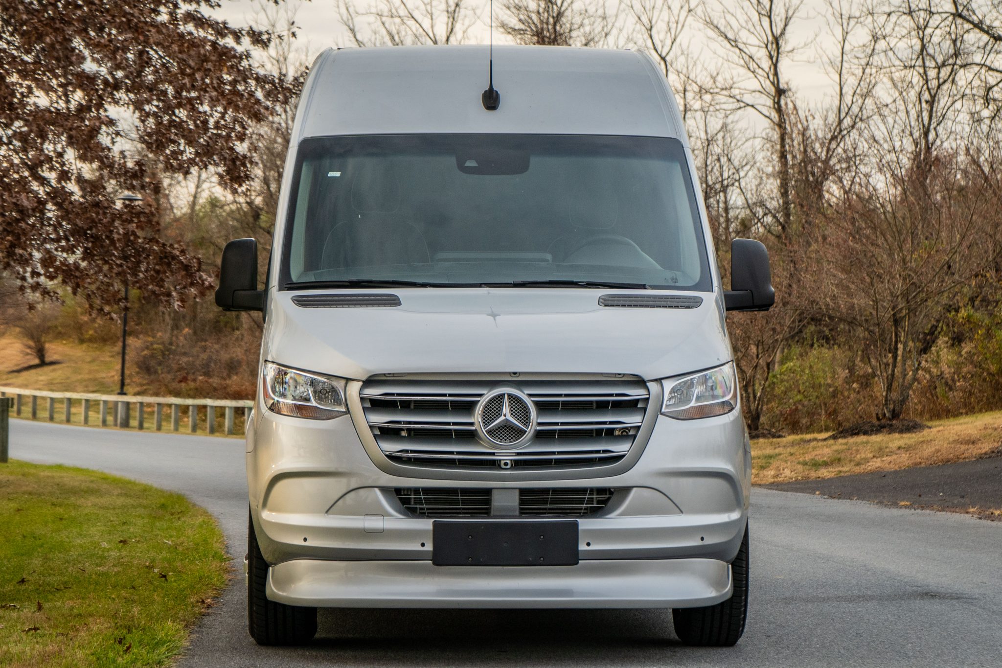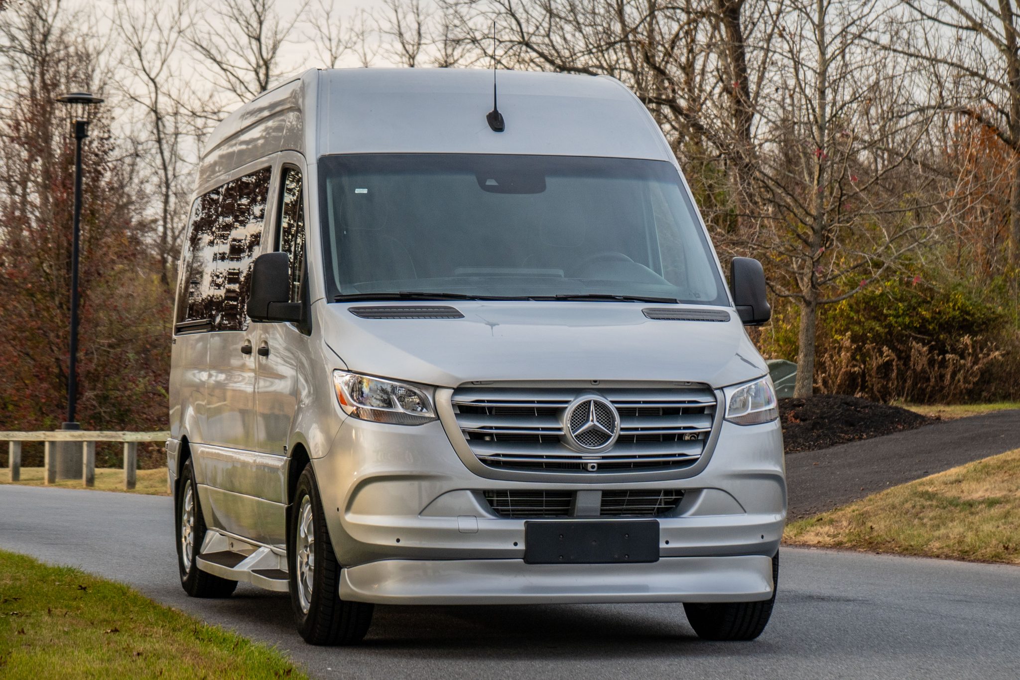 Brabus 18″ wheels are mounted with Michelin Defender LTX M/S tires. The van rides on independent front suspension and a solid rear axle, and braking is handled by discs at all four corners. The chassis is equipped with an Electronic Stability Program (ESP).
