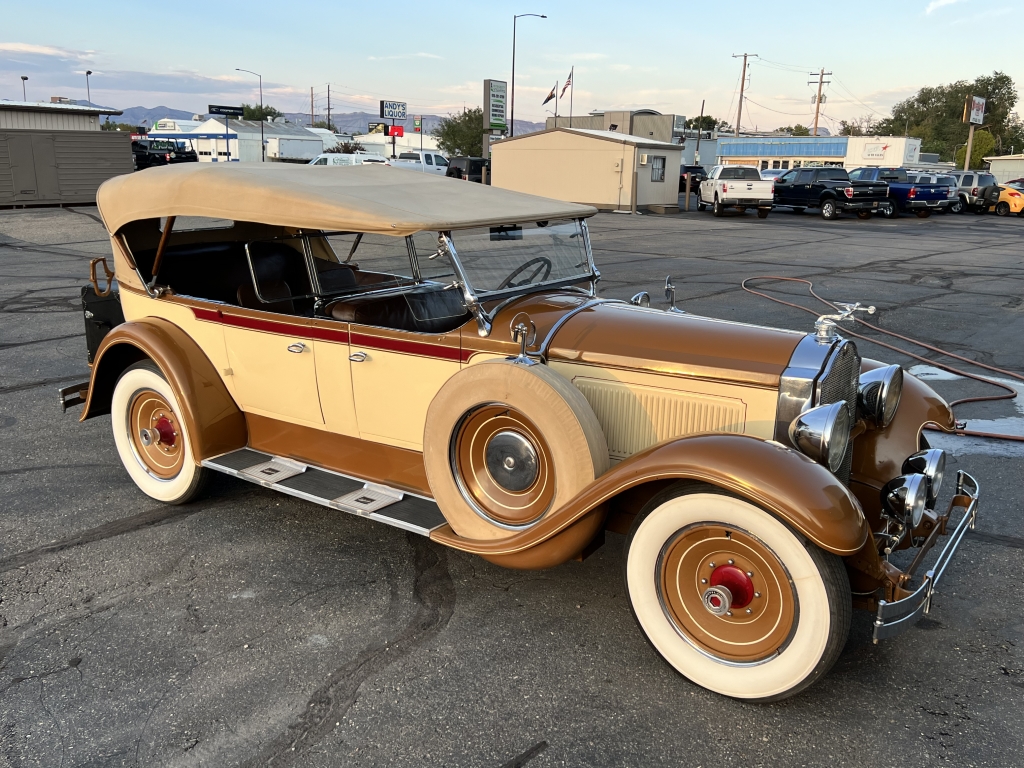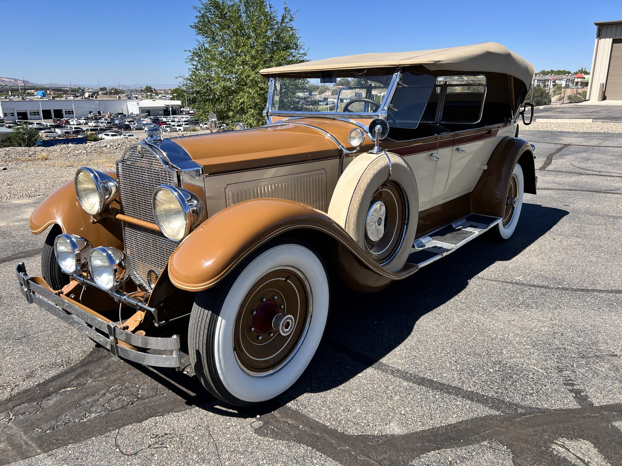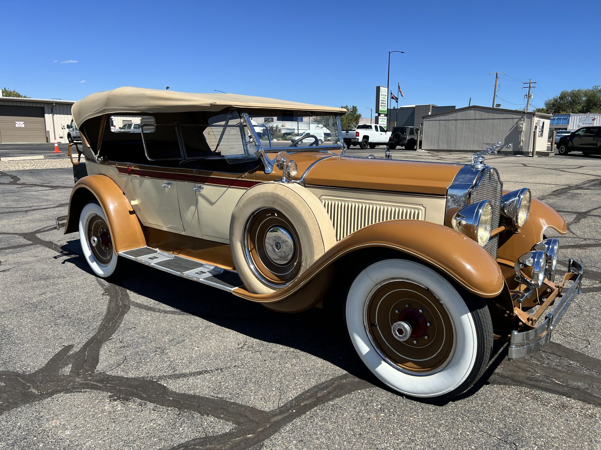 The car is said to have undergone a refurbishment in the early 1980s and is finished in tan and cream with red shoulder-line moldings. Various scuffs and touched-up chips are noted in the finish. Features include four doors latching at the B pillars, CM Hall headlights with conical housings, Pilot-Ray swiveling driving lights, a mesh grille guard over brown-painted thermostatically controlled radiator shutters, cowl lamps, wind wings, a removable three-piece central windshield, a fold-down rear luggage rack hosting a Pickard trunk upholstered in black, and a beige convertible top.