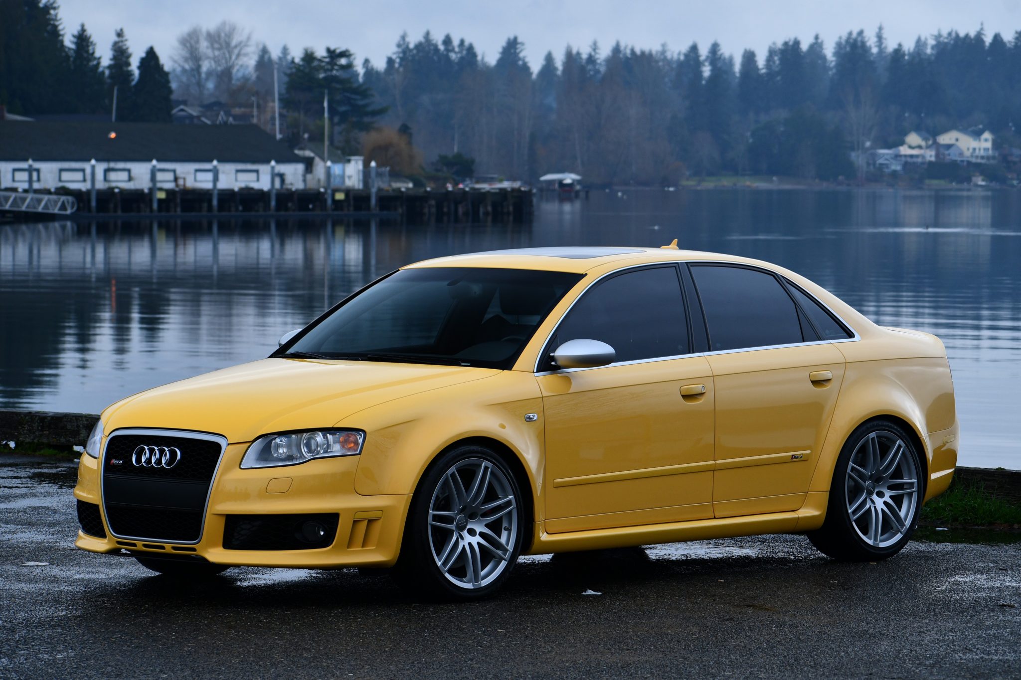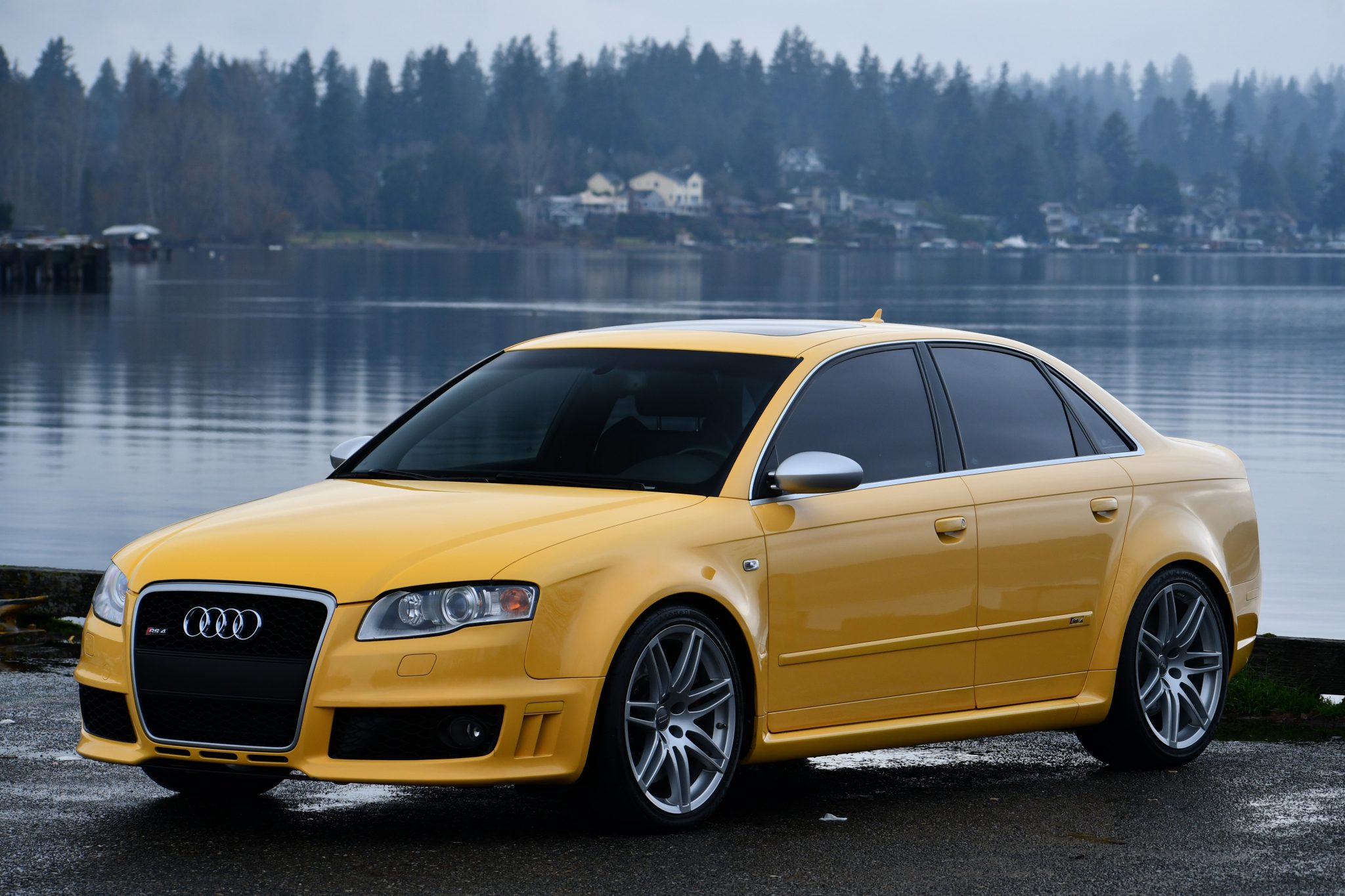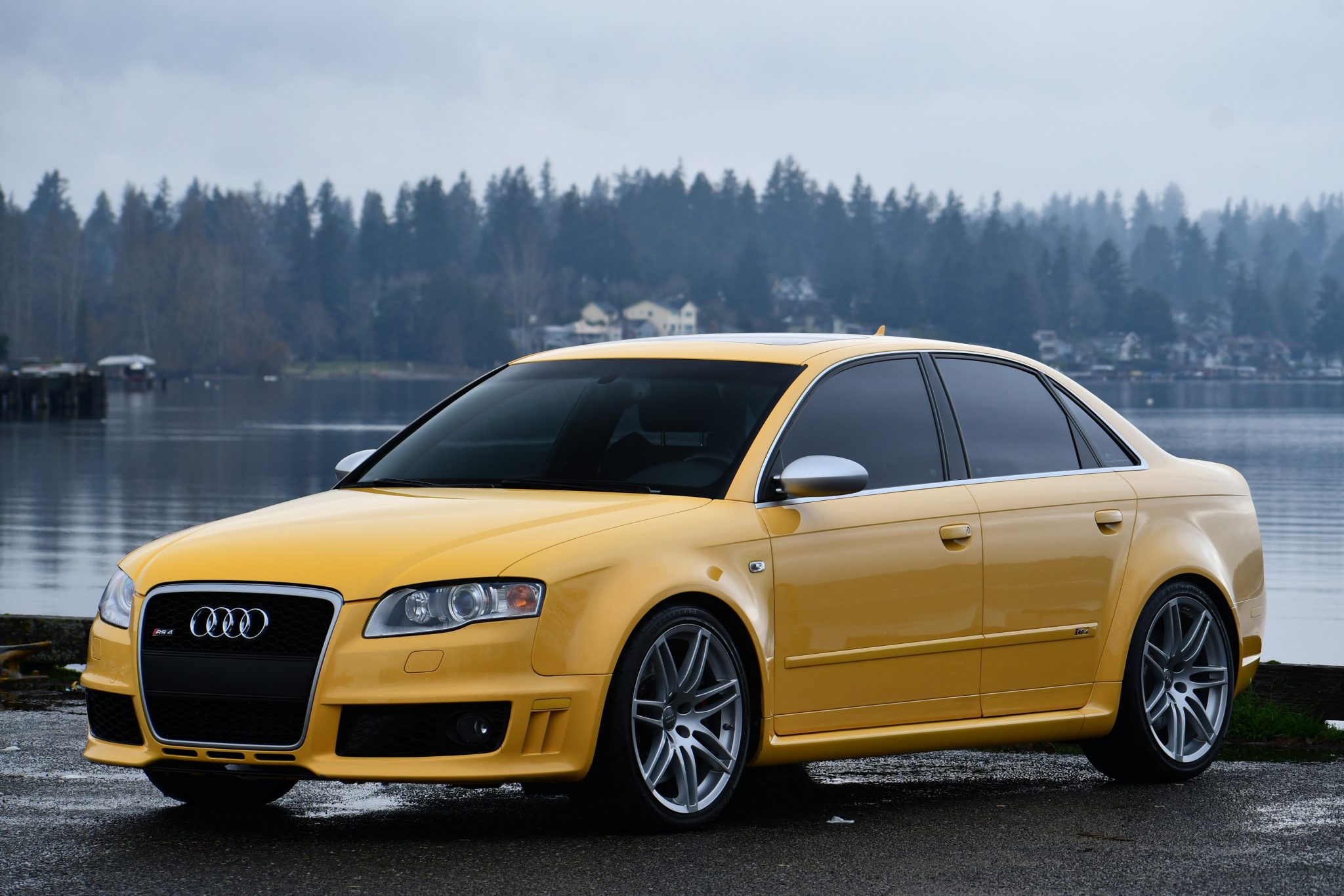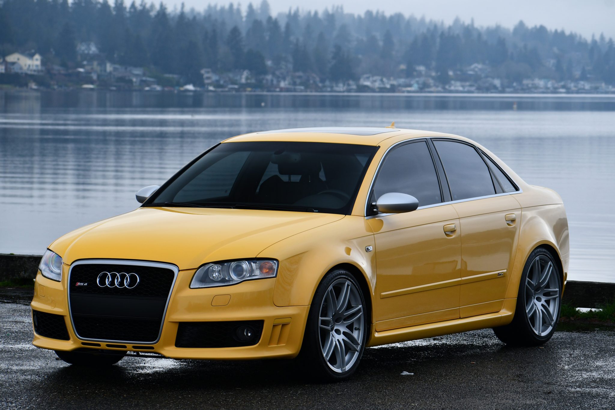 Silver-finished 19″ split-spoke wheels are mounted with Firestone tires. The car is equipped with Bilstein coilovers, and stopping power is provided by drilled discs at all four corners, with RS-logo eight-piston calipers over 14.4″ rotors up front. Replacement front brake pads and rotors were recently installed, according to the seller.