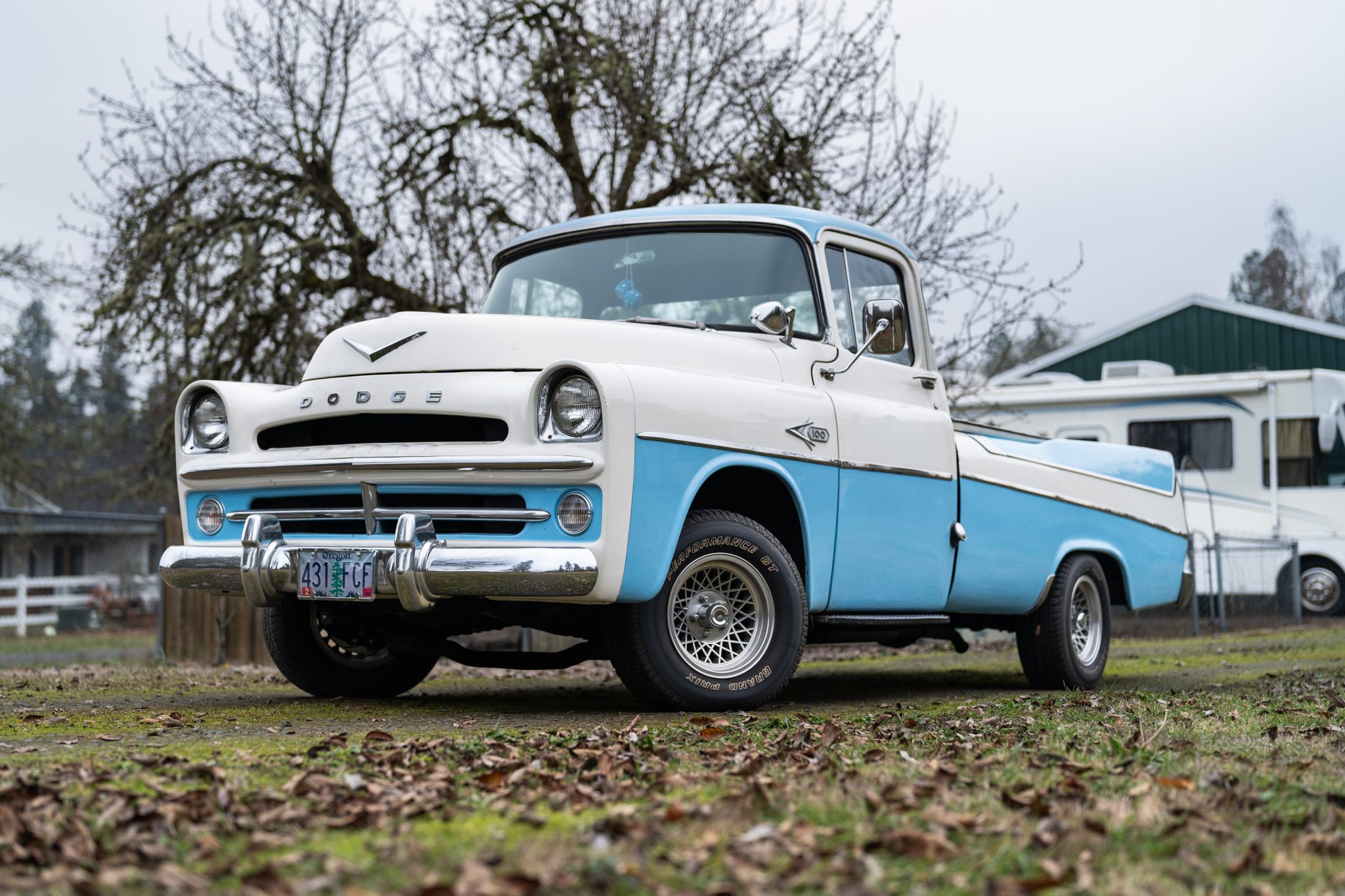 This truck was repainted in two-tone blue and white under prior ownership. Other features include a chrome front bumper and grille sections, A-pillar-mounted spotlights, dual side mirrors, quarter-panel stone guards, a black tonneau cover, and wood-slat bed flooring with bright trim strips. The seller notes pitted chrome as well as chips, scratches, and cracks in the paint.