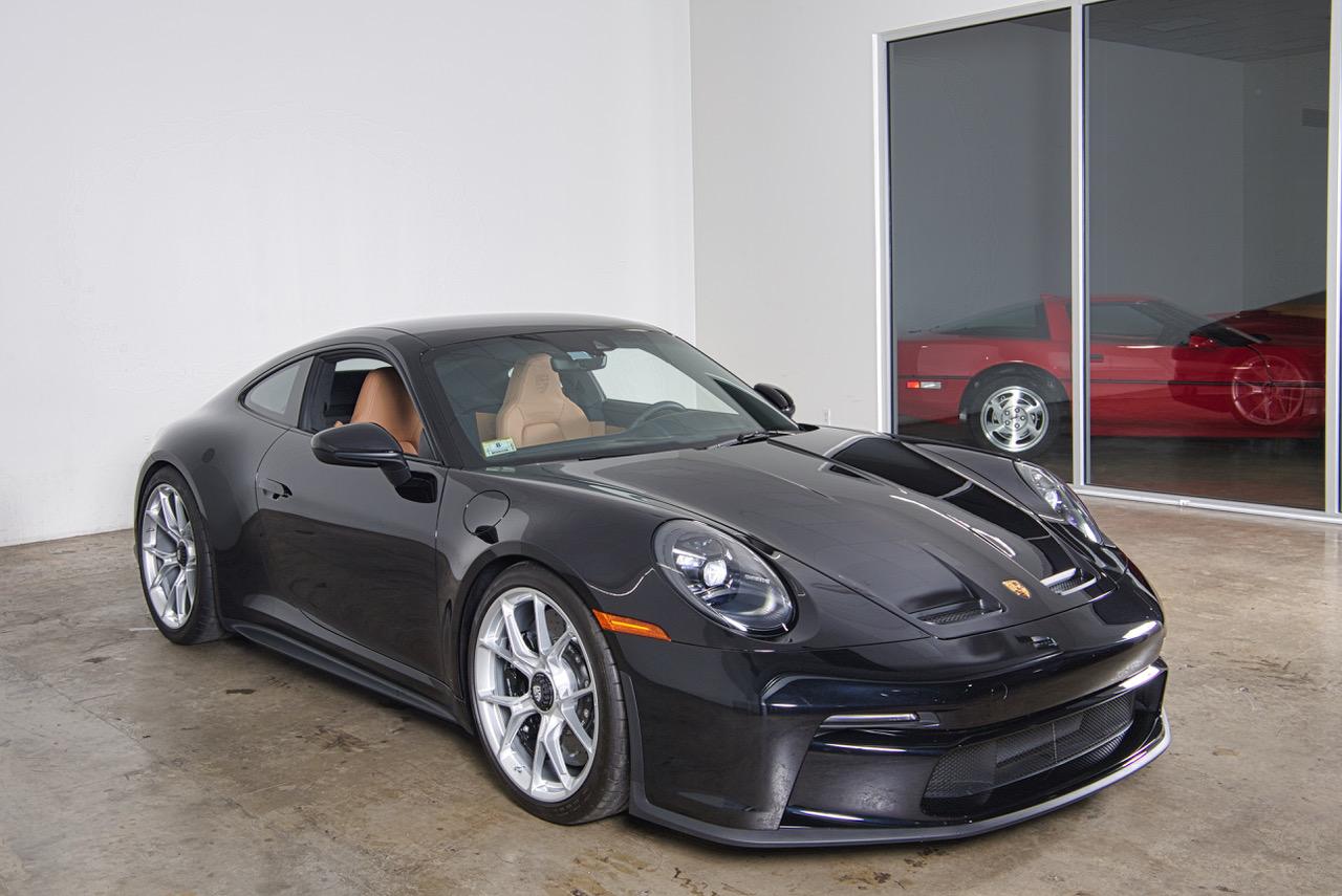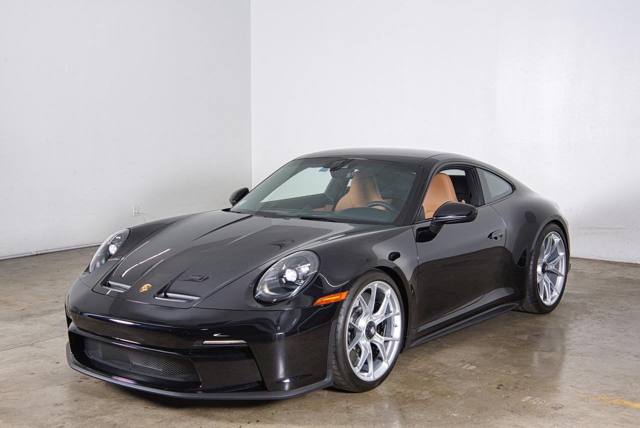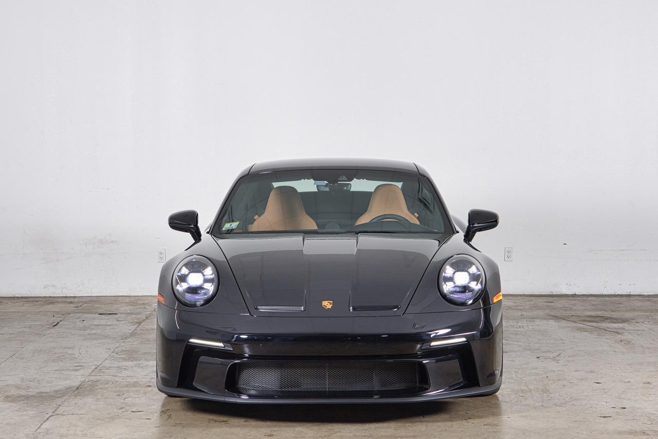 The 20″ front and 21″ rear GT3 center-lock wheels are mounted with Goodyear tires. Stopping power is provided by Porsche Ceramic Composite Brakes (PCCB) with cross-drilled and ventilated discs at each corner. The car is equipped with rear-axle steering and a front-axle lift system,.