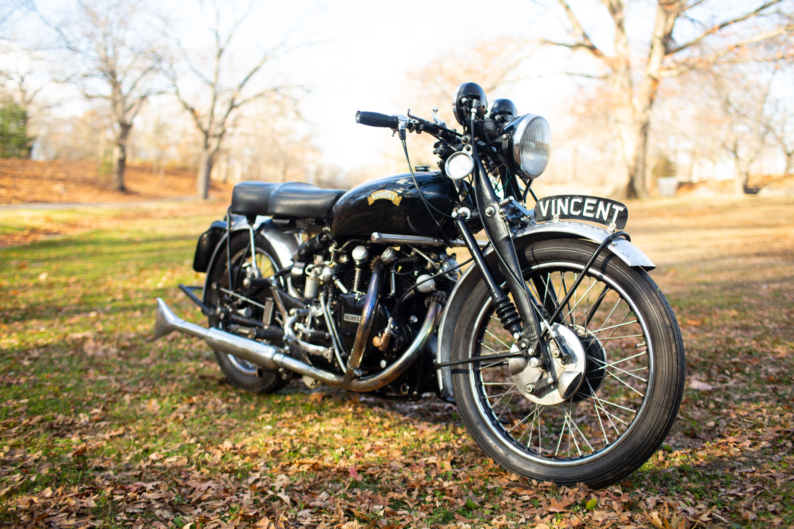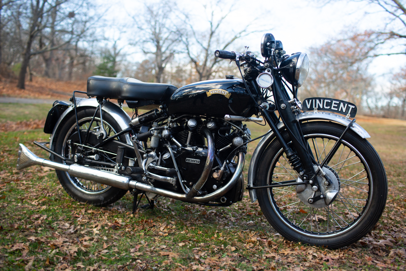 Equipment includes a stepped two-up seat and polished aluminum fenders, the rear of which is hinged, as well as a pedestrian-slicer front number plate, a front guard bar, a Lucas Altette horn, folding passenger foot pegs, a rear lift handle, and four props consisting of dual side stands and both center and rear-wheel stands. Close-up photos that depict paint chips on the left side of the fuel tank and the frame can be viewed in the gallery.