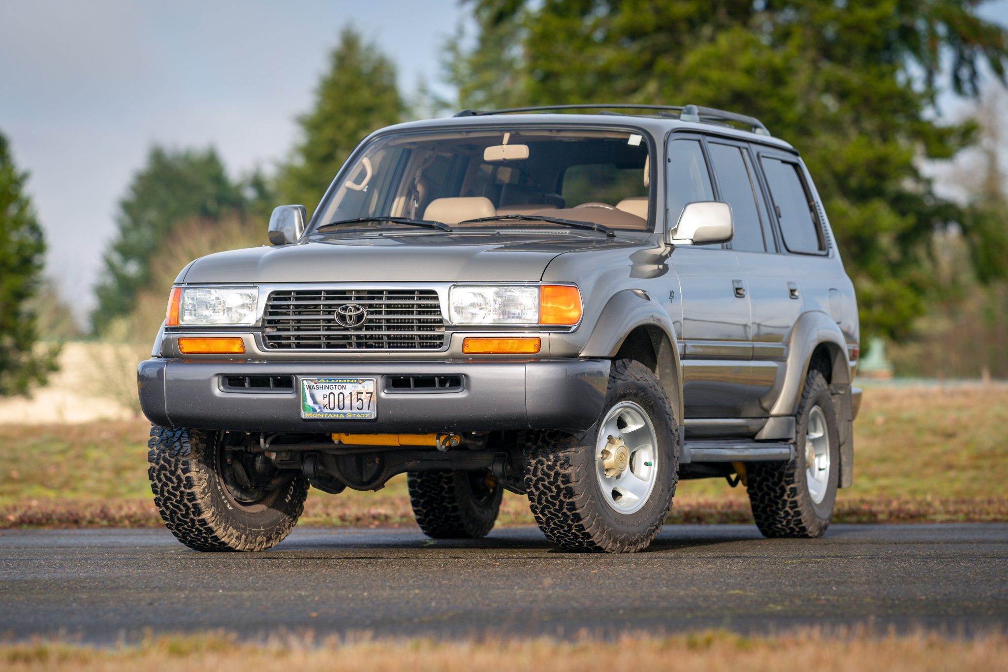 The 16″ alloy wheels are wrapped in BFGoodrich All-Terrain T/A KO2 tires said to have been mounted in May 2021. A 2.5″ Old Man Emu suspension lift, shocks, and steering stabilizer have been added, and braking is handled by four-wheel discs with ABS. The front stabilizer bushings are said to have been replaced in October 2023.