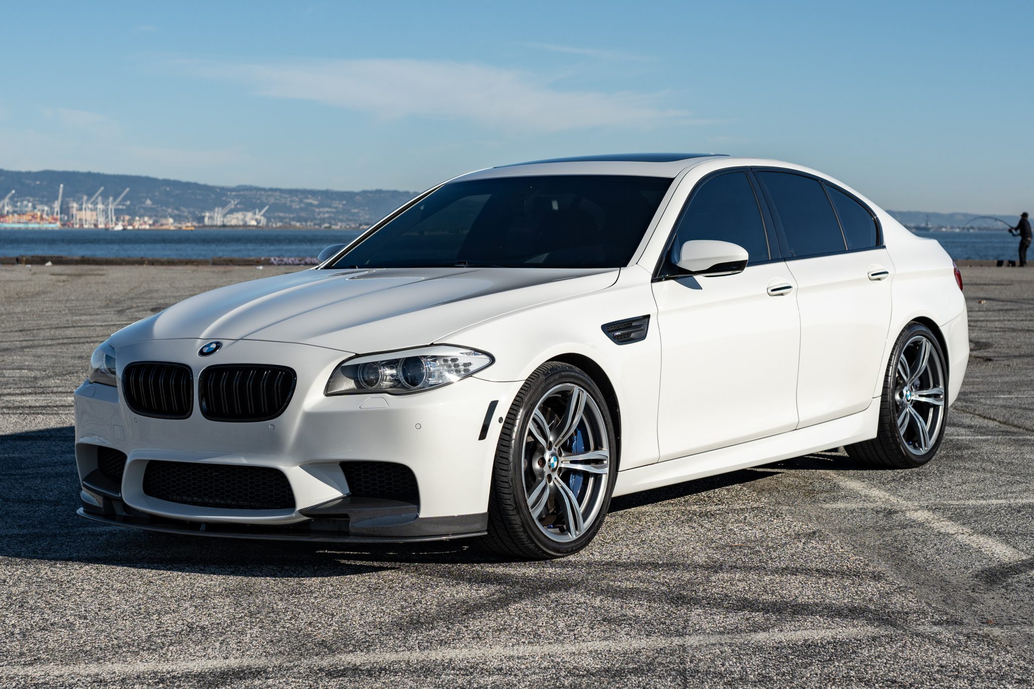 The 20″ Style 343M alloy wheels are mounted with Yokohama front and Toyo rear tires. Braking is handled by blue M-branded calipers over cross-drilled and ventilated rotors at each corner. Curb marks and blemishes are visible on the wheels.