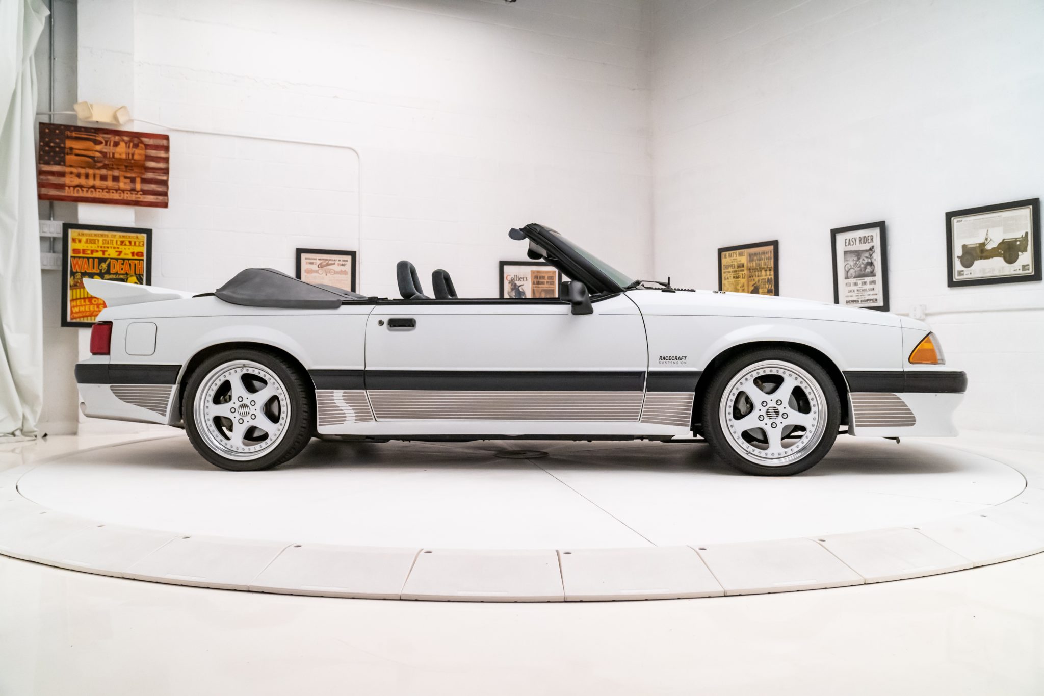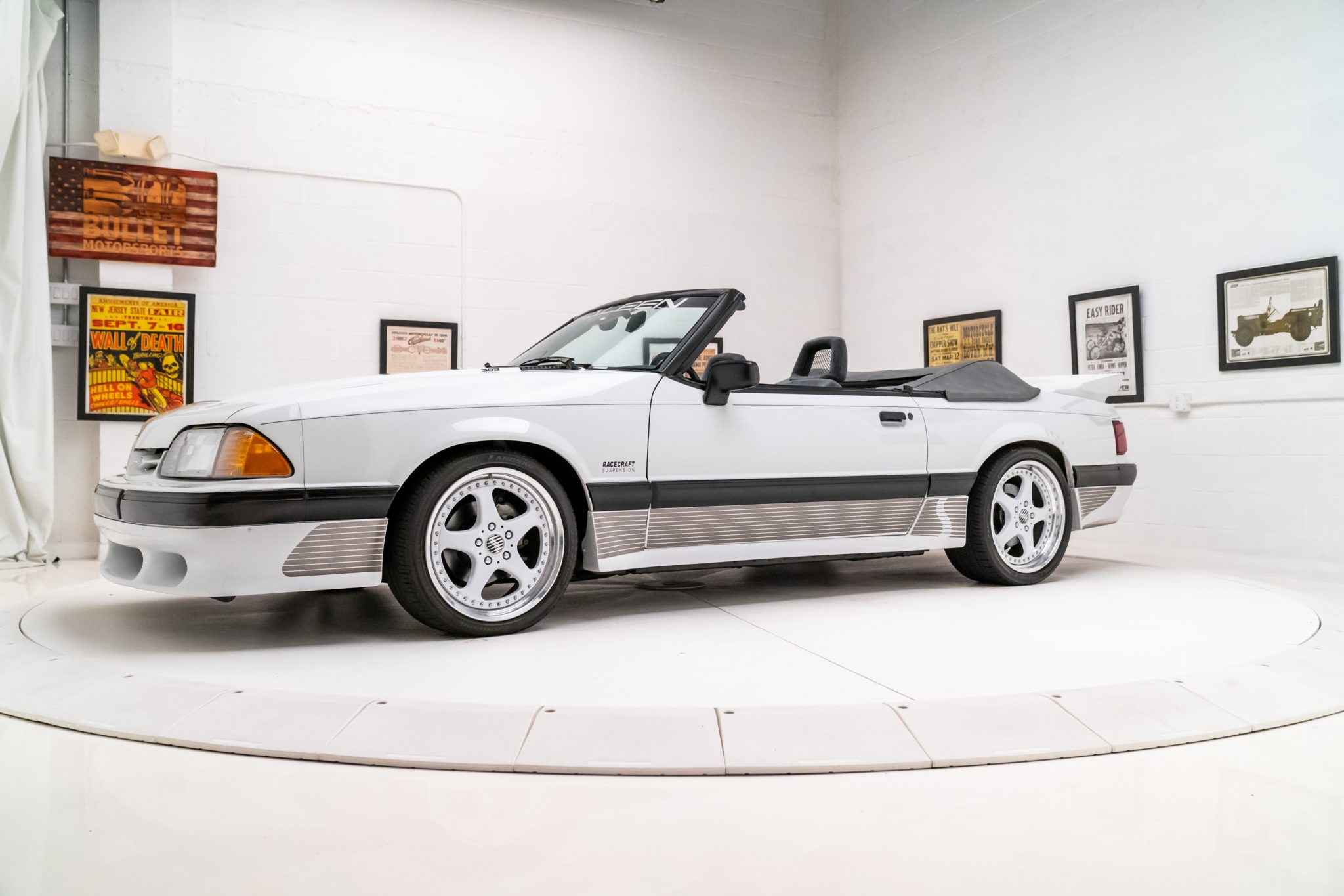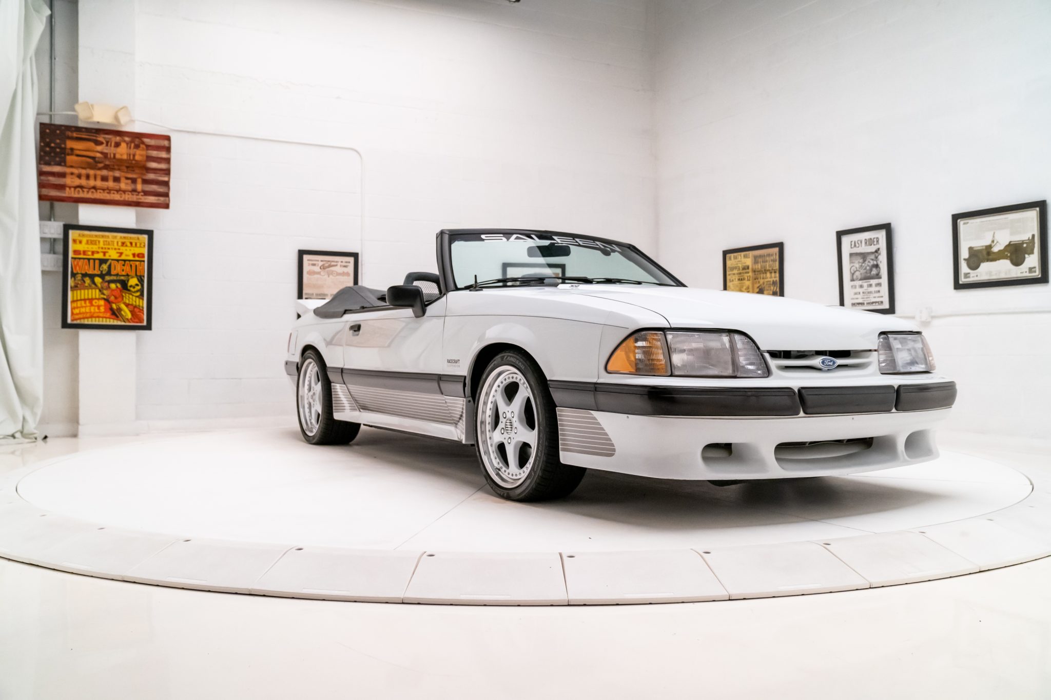 The 18” modular five-spoke wheels wear Saleen-logo center caps and are mounted with Landsail LS588 UHP tires measuring 225/40 up front and 265/35 at the rear. As part of the Saleen package, the car was outfitted with a Racecraft suspension that included gas-pressurized front struts and rear quad shocks. Stopping power is provided by four-wheel disc brakes.