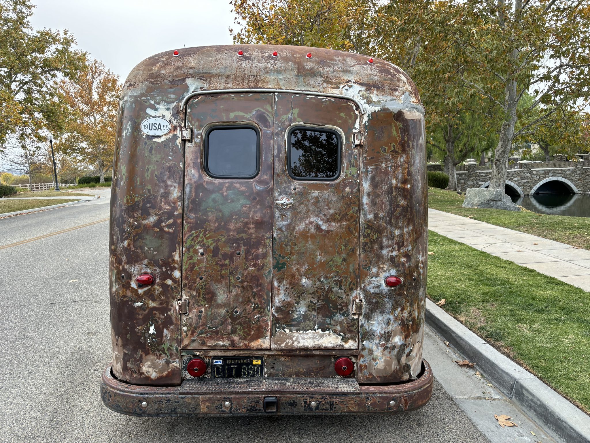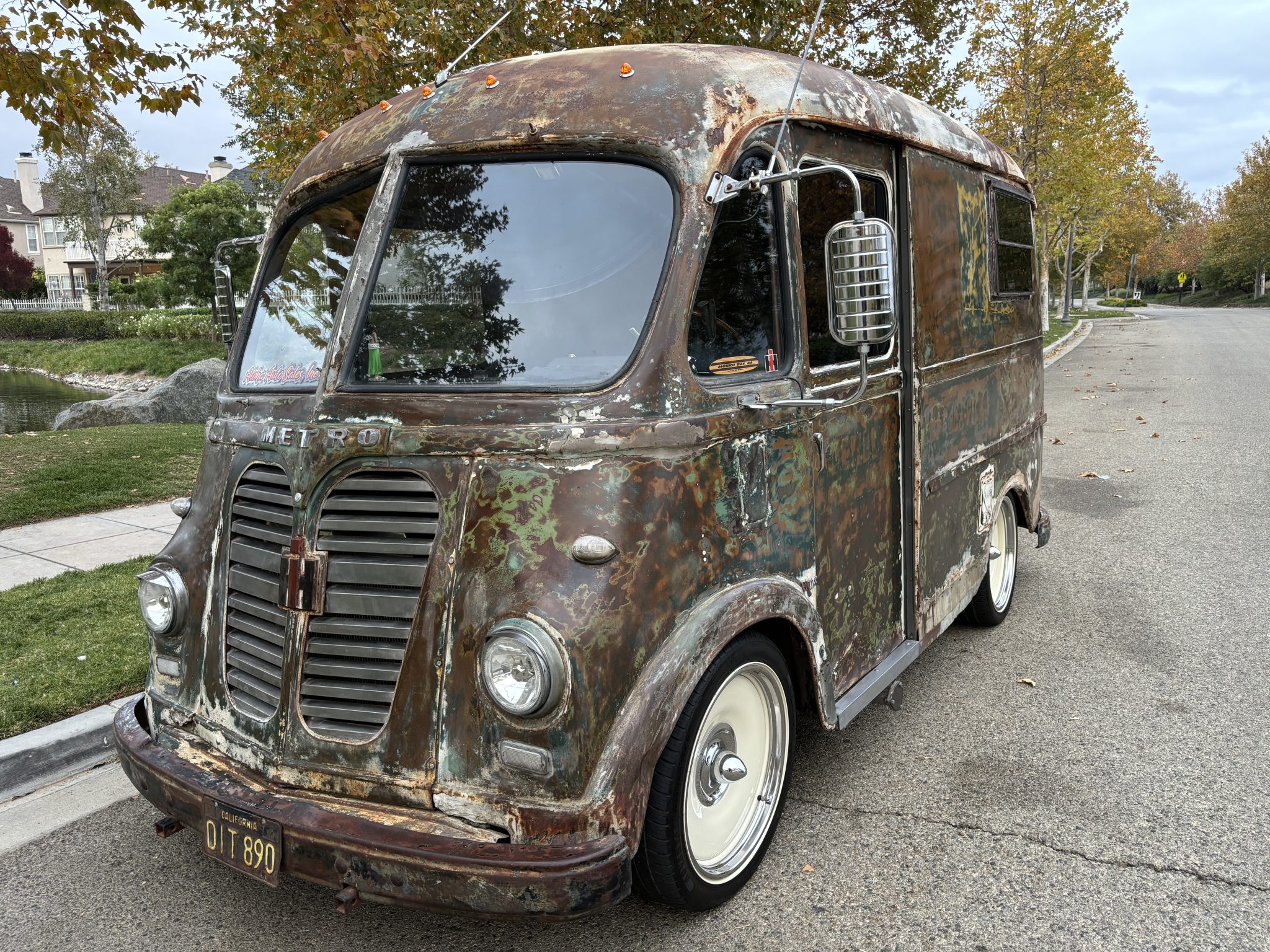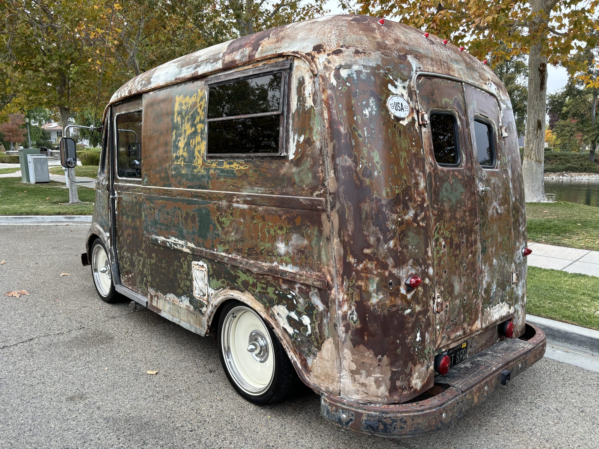 Staggered-width 20″ smoothie-style beige Detroit Steel wheels were installed under current ownership and wear polished trim rings and spear-style center caps. They are mounted with 245/50 front and 275-35 rear Advanta HPZ-02 tires that show 2024 production date codes. A Mustang II-style front subframe with rack-and-pinion steering was fitted under prior ownership. The brakes were recently serviced per the seller.