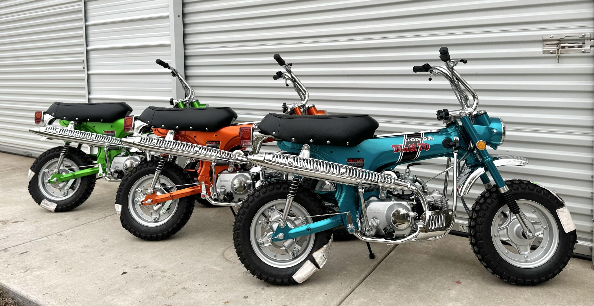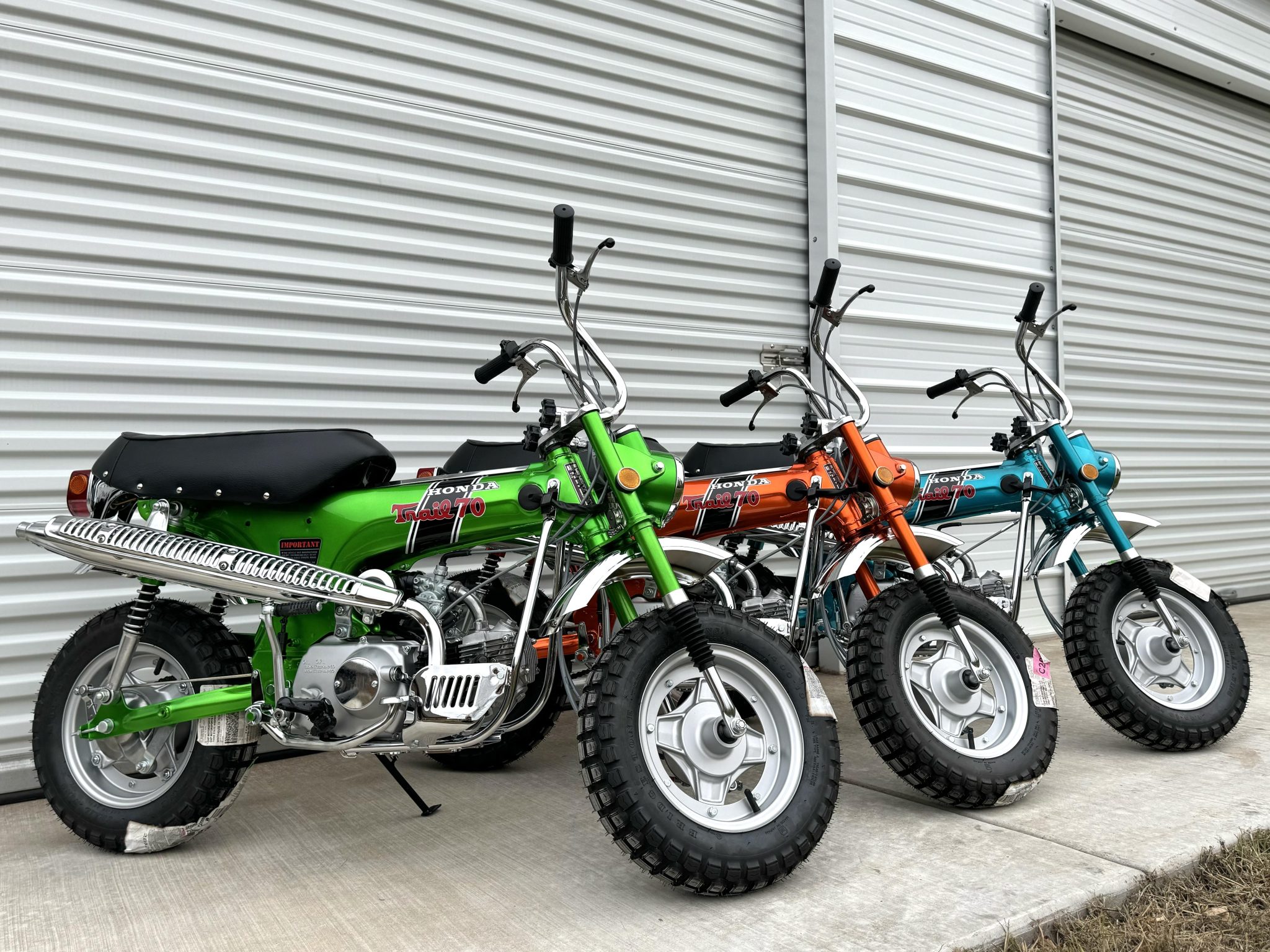 The silver-finished 10″ three-piece wheels are mounted with 4.00″ Bridgestone Trail Wing tires, and the wheel hubs and rims were refurbished and the axles replaced. Suspension on each machine consists of a rebuilt inverted fork with rubber gaiters as well as dual shocks mounted to the swingarm, and braking is handled by drums at both ends. The rear brake rods were replaced.