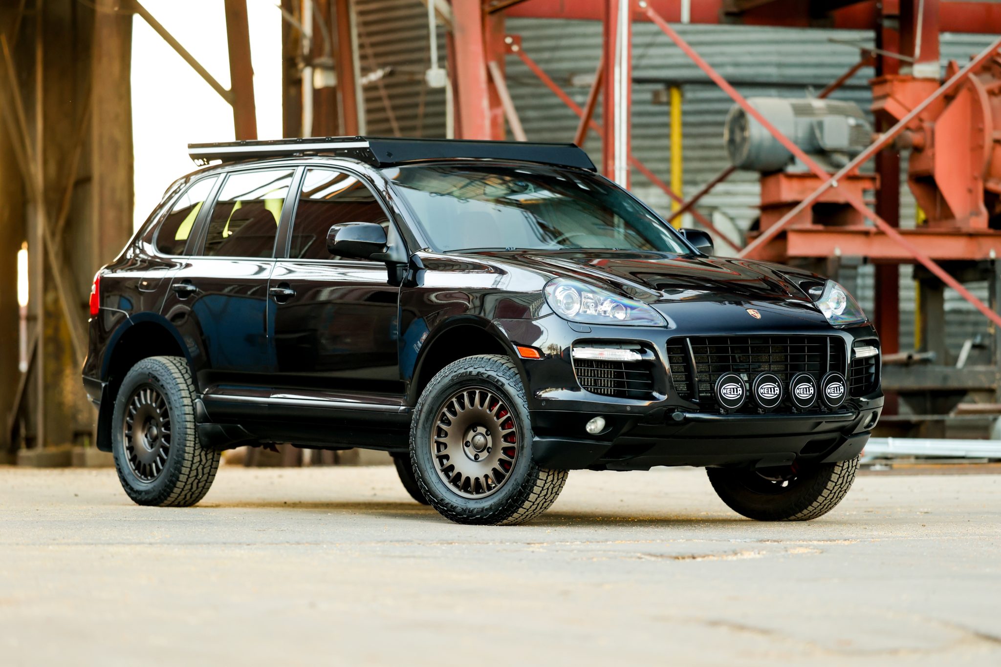 Bronze-finished 18″ Nomad Sahara wheels are mounted with 265/60 Falken Wildpeak AT3W tires. The vehicle is equipped with an air suspension, Porsche Active Suspension Management (PASM), optional Porsche Dynamic Chassis Control (PDCC), and an aftermarket 2″ lift kit.