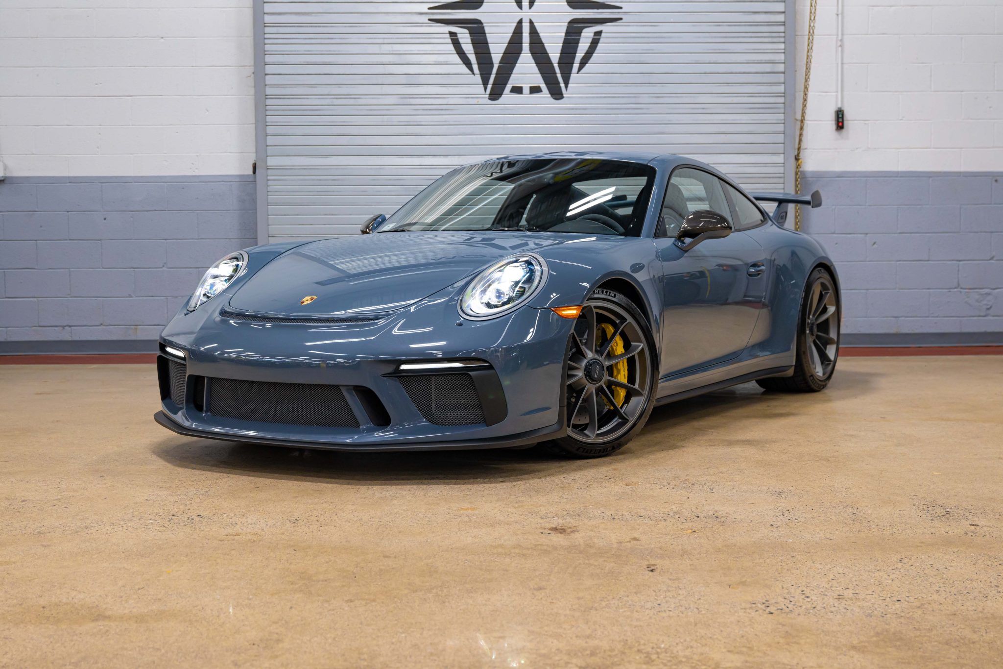 Platinum Satin-finished 20″ center-lock alloy wheels are mounted with Michelin tires. Braking is handled by yellow Porsche-branded calipers over ceramic-composite rotors. The car is equipped with a front-axle lift system and Porsche Active Suspension Management.