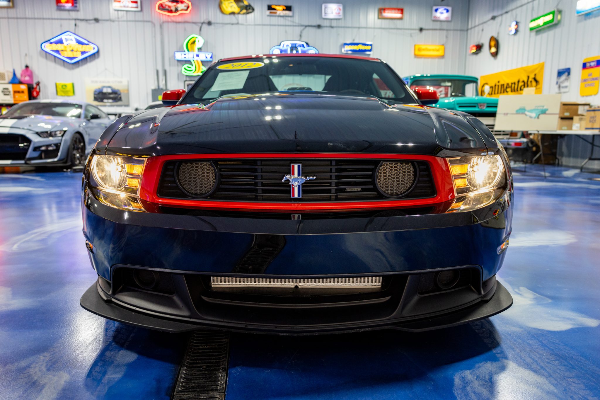 The 19″ 10-spoke alloy wheels are mounted with staggered-width Pirelli P Zero Corsa tires. The suspension has been modified with Warrior rear shocks, billet lower control arms, a sway bar-relocation kit, and double-adjustable upper control arms. Braking is handled by four-wheel discs with Brembo front calipers over ventilated rotors. A line lock was installed under prior ownership.