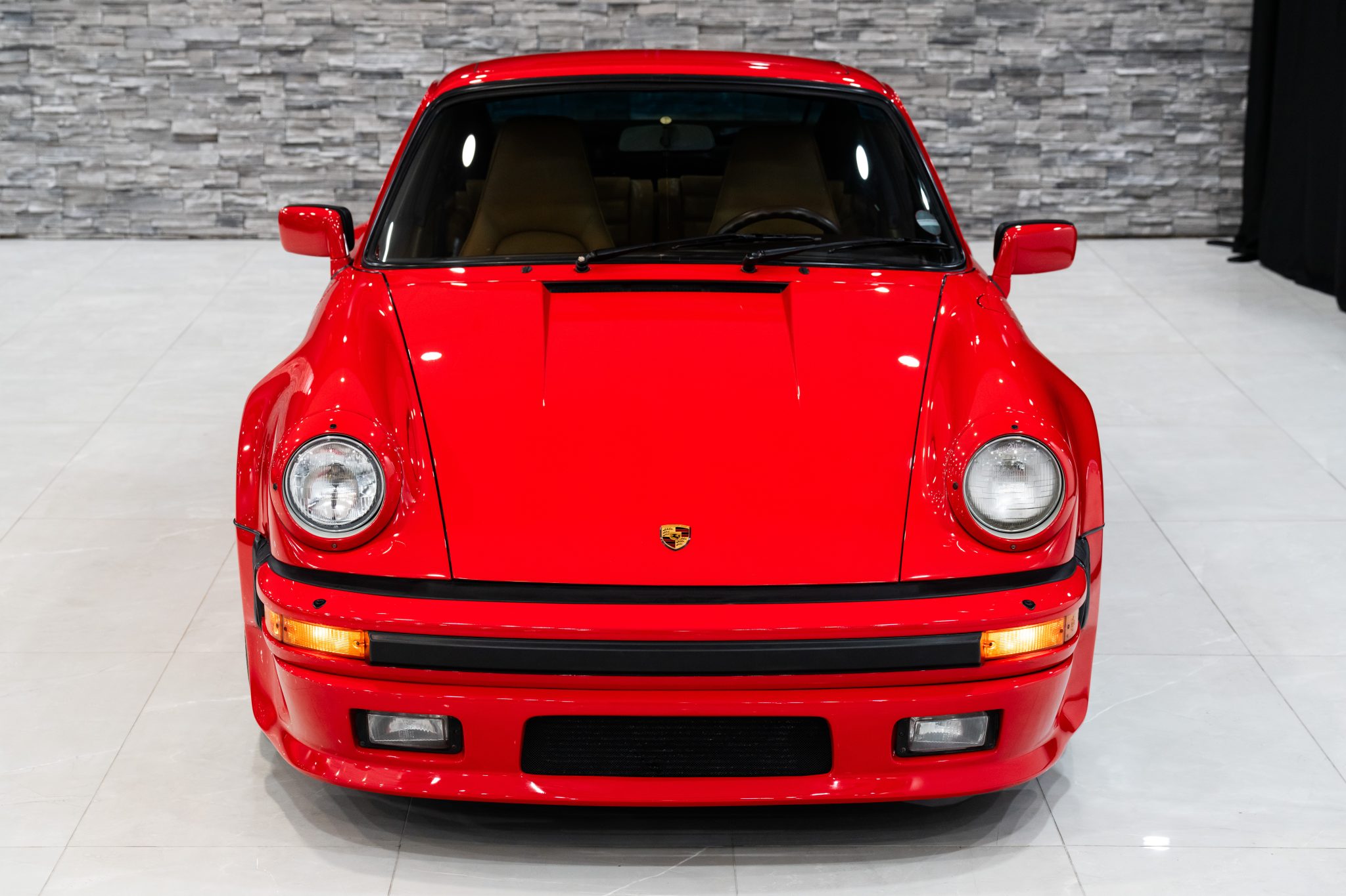 Staggered-width 16″ Fuchs alloy wheels are mounted with Bridgestone Potenza tires. Bilstein dampers, a front strut tower brace, and stainless steel brake lines have been installed. Braking is handled by four-wheel cross-drilled with yellow-finished calipers.