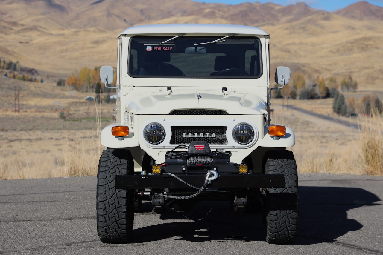 Gray 16″ steel wheels are mounted with 285/75 Toyo Open Country R/T tires, and a matching spare is affixed to the swing-away tire carrier. The truck is equipped with manually locking front hubs and power steering. Braking is handled by discs at all four corners, and a replacement master cylinder and booster were installed in September 2024 along with Bilstein shock absorbers.