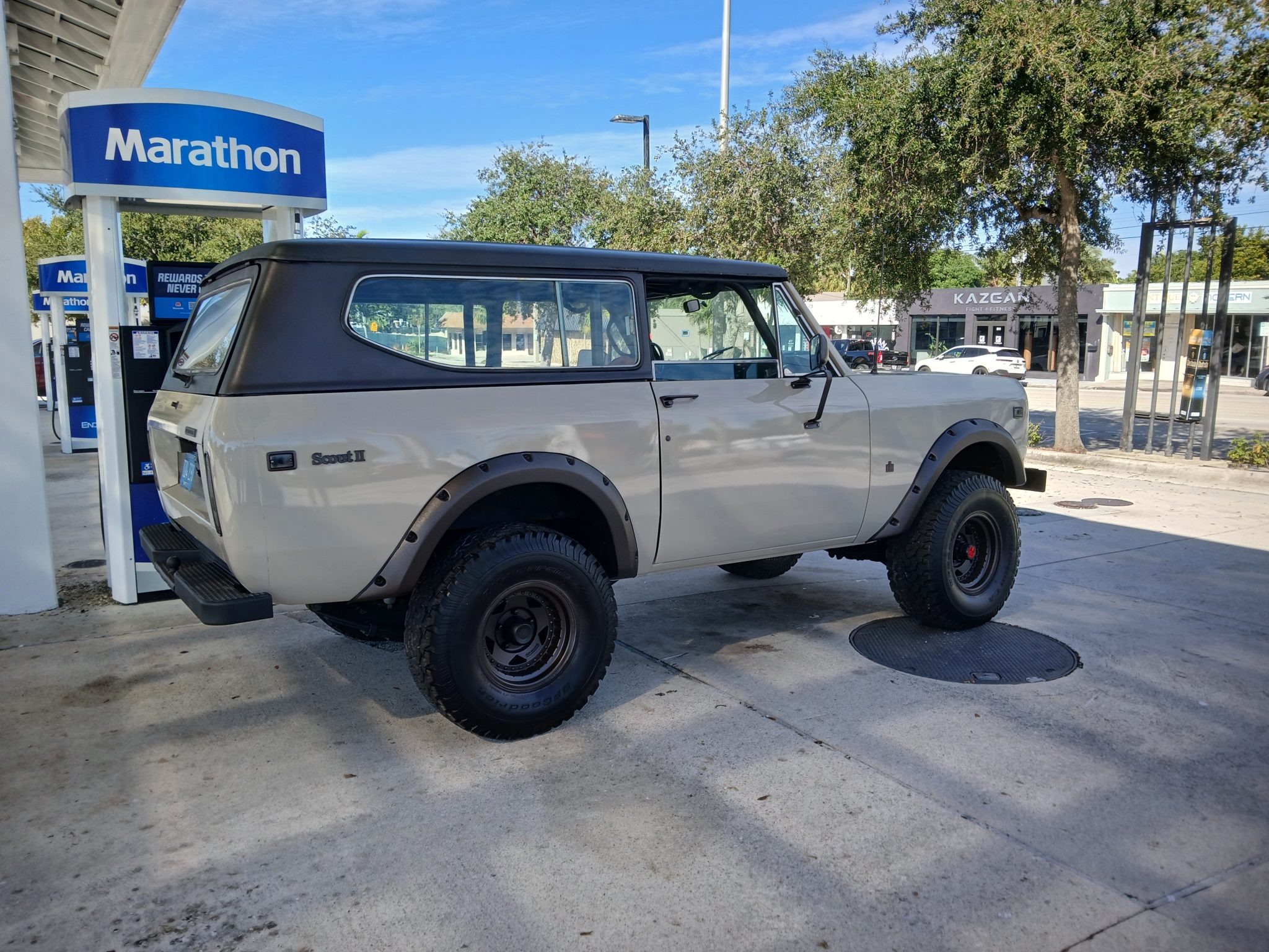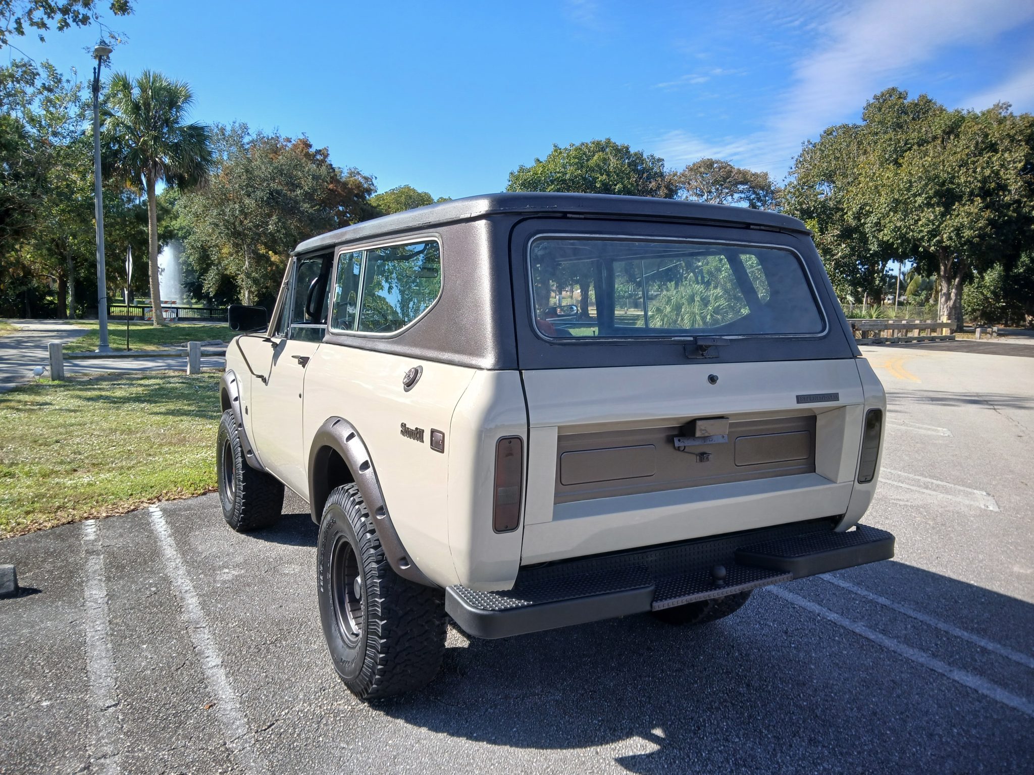 The 15″ Centerline wheels are mounted with 33×12.5″ BFGoodrich All-Terrain T/A tires. Paint overspray is noted on the tires. The truck is equipped with manually locking front hubs, power steering, and a 4″ suspension lift has been fitted. Braking is handled by power-assisted front discs and rear drums. The front disc brakes were serviced, the steering gear was rebuilt, and the power steering pump was replaced recently, according to the seller.
