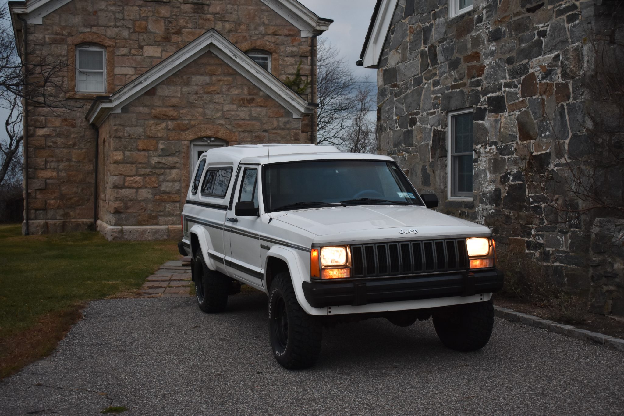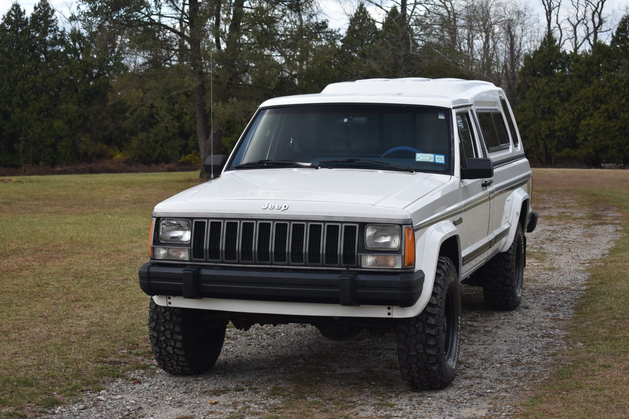 Black 15″ steel wheels are mounted with BFGoodrich Mud-Terrain T/A tires. The truck is equipped with a 2″ suspension lift, power steering, and front disc brakes.