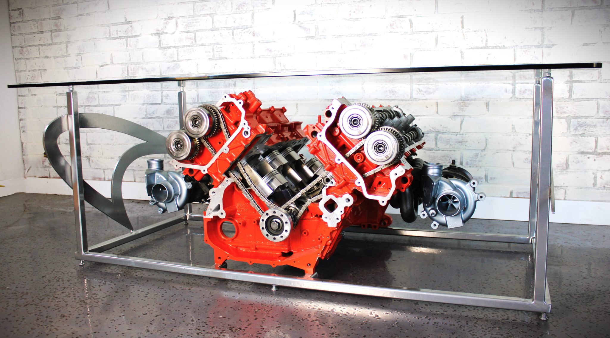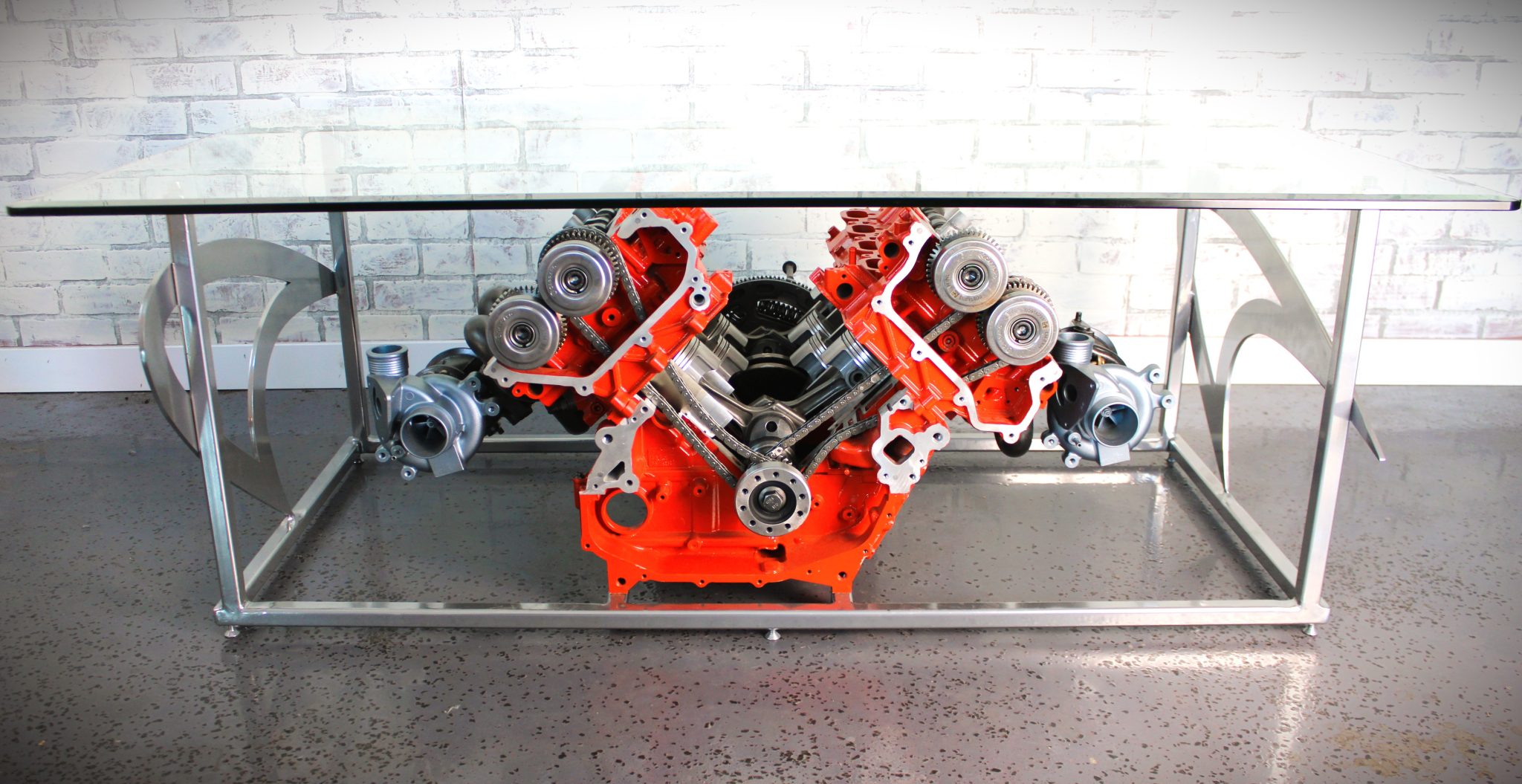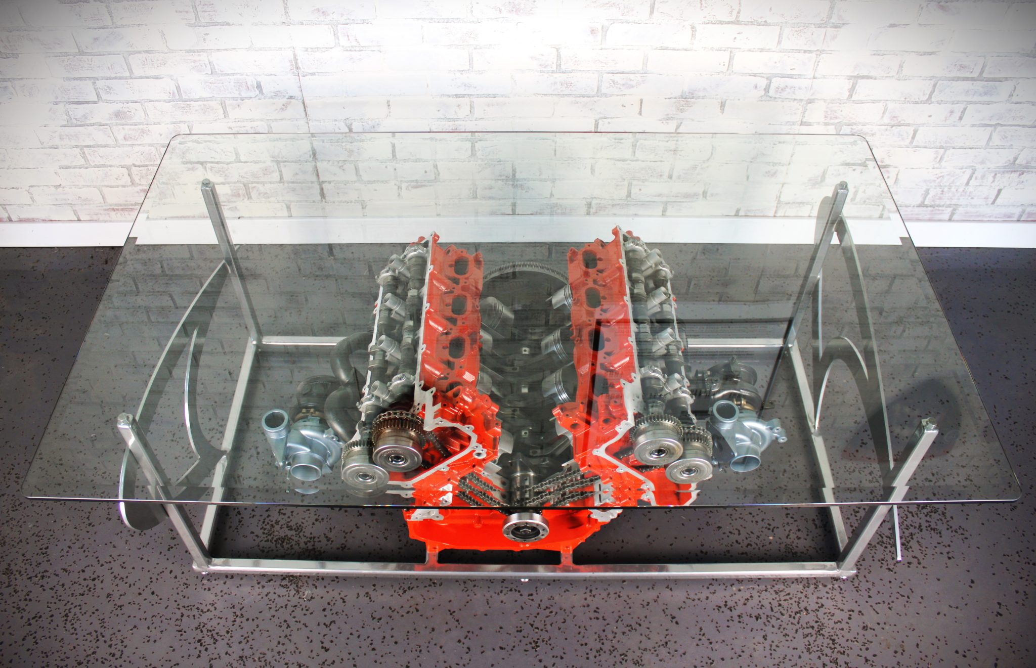 The rectangular glass tabletop measures approximately 60″ long by 36″ wide, and the table is 22″ high and incorporates a McLaren logo at each end. A chrome powder-coating finish has been applied to the frame and McLaren logos.