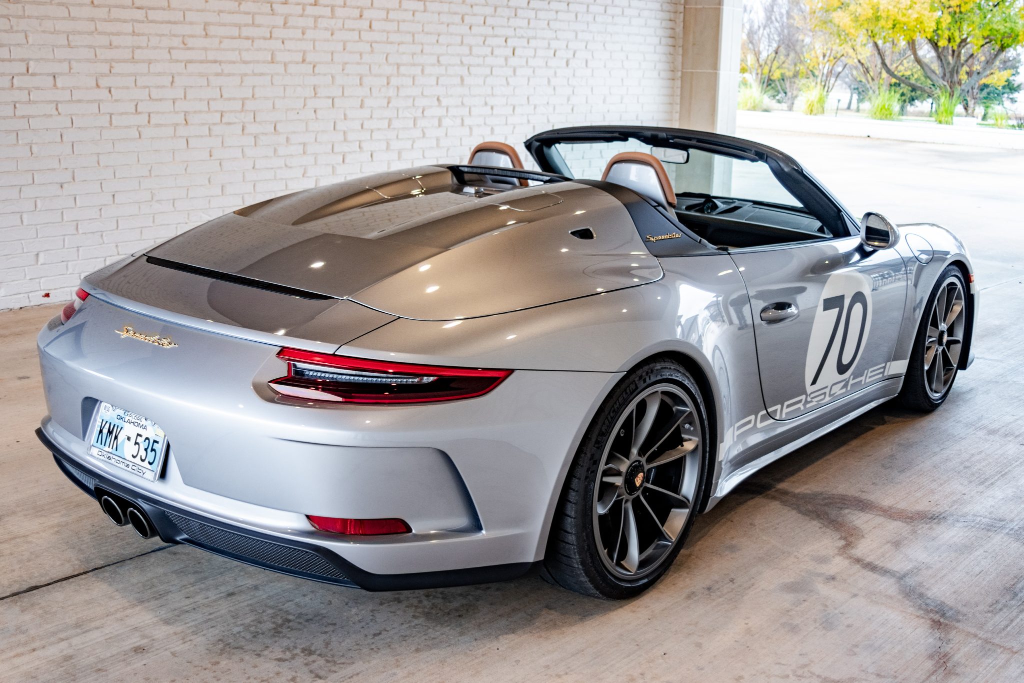 Satin Platinum-finished center-locking 20″ forged alloy wheels are mounted with Michelin Pilot Sport Cup 2 tires. Braking is handled by four-wheel cross-drilled Porsche Ceramic Composite Brakes with Porsche-branded calipers. Porsche Active Suspension Management (PASM), Porsche Stability Management (PSM), and rear-axle steering were standard on the Speedster, and this example was optioned with a front-axle lift system.