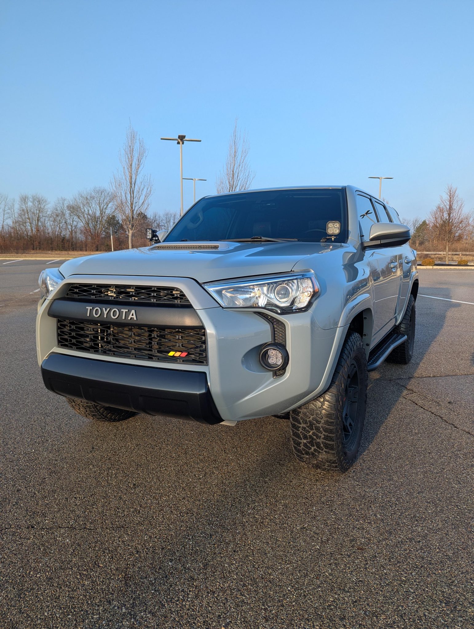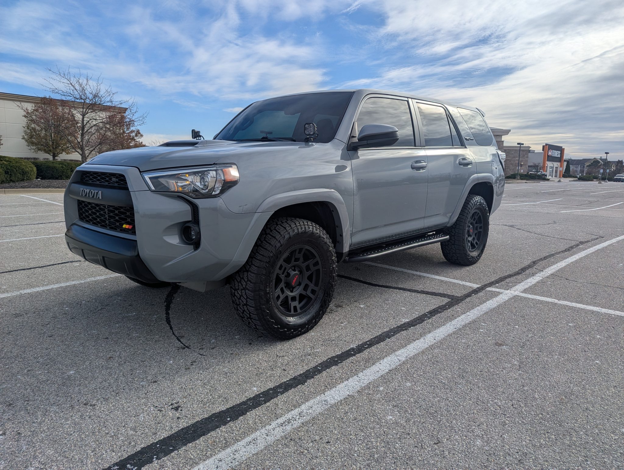 Matte black-finished 17″ wheels wearing TRD-branded center caps were mounted with 265/70 Falken Wildpeak A/T3W tires in March 2023. Braking is provided by anti-lock ventilated discs at each corner. The seller states that the suspension has been modified with 2023 4Runner TRD Pro-specification Fox dampers.