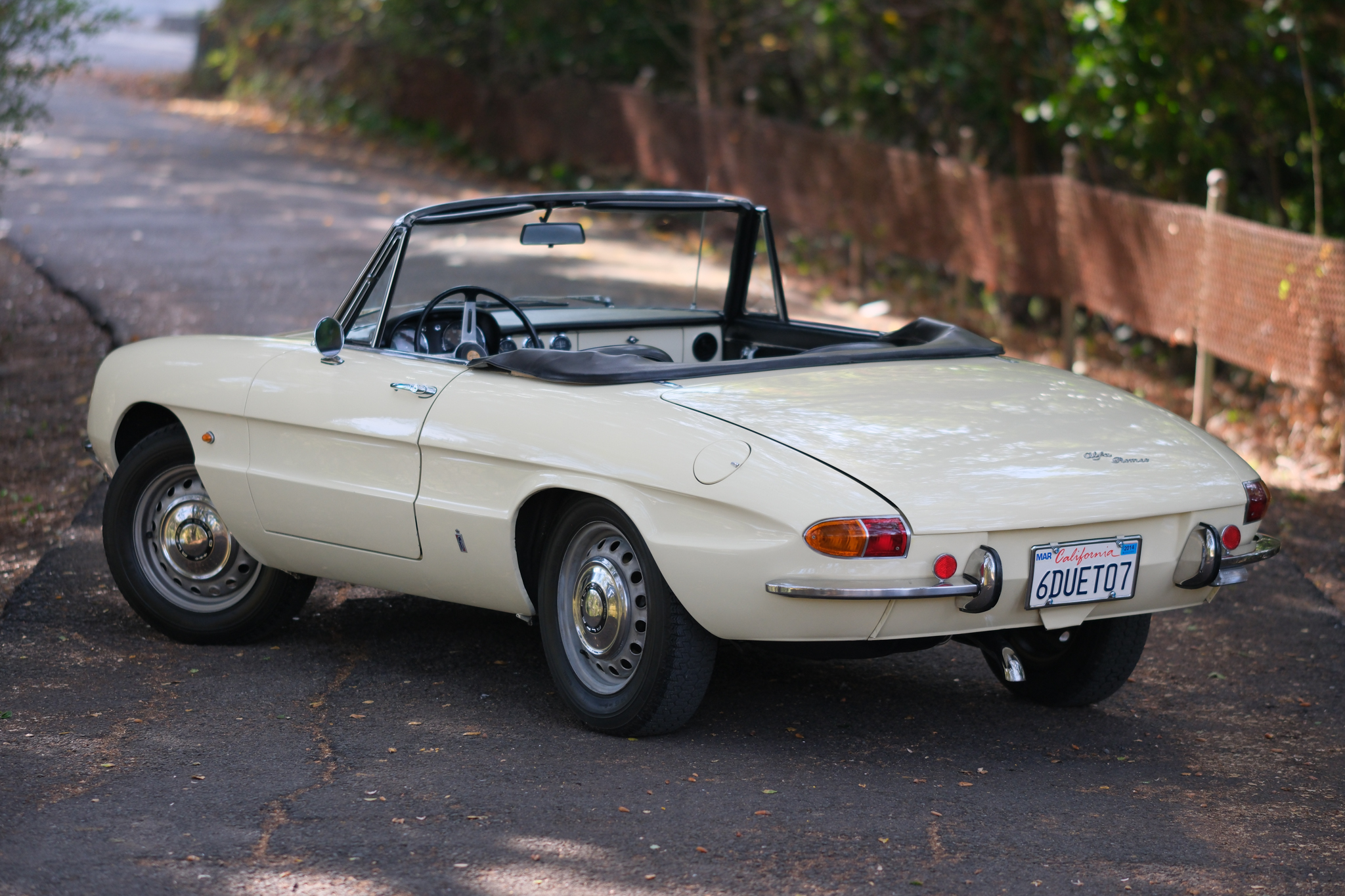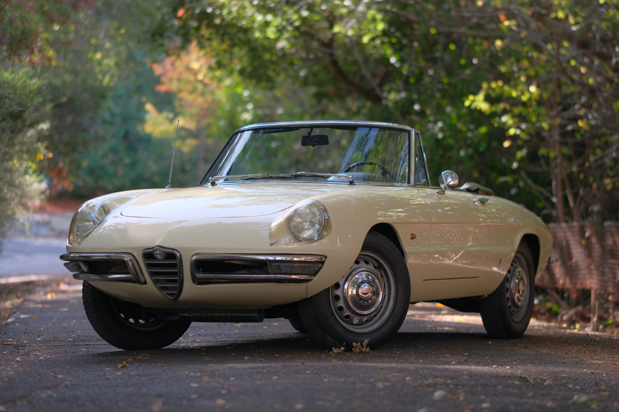 The 15″ steel wheels wear polished Alfa Romeo–branded hub caps and are mounted with older 165-series Michelin XZX tires. Braking is handled by power-assisted discs at each corner, and the brake hoses were replaced in preparation for the sale.