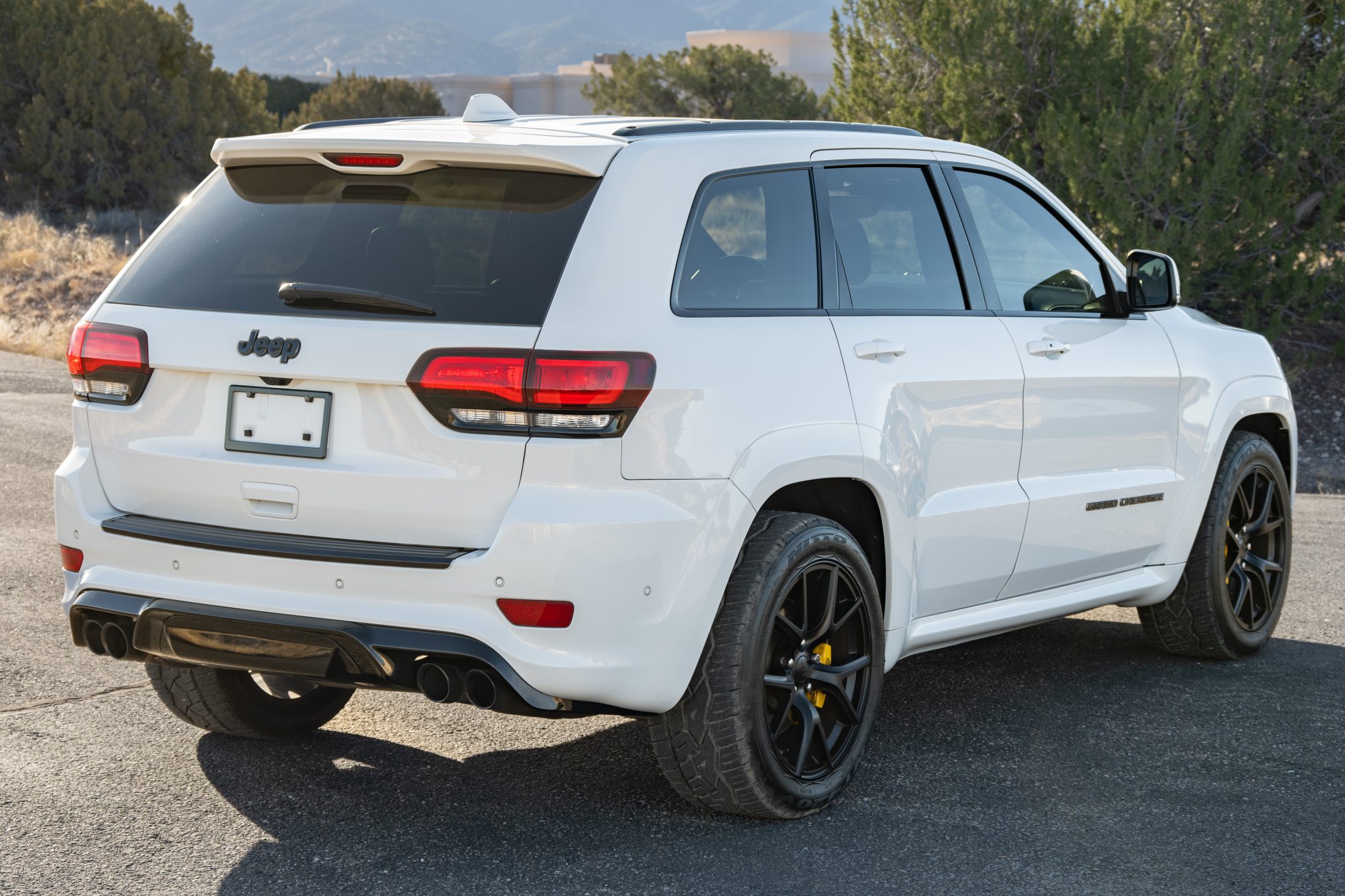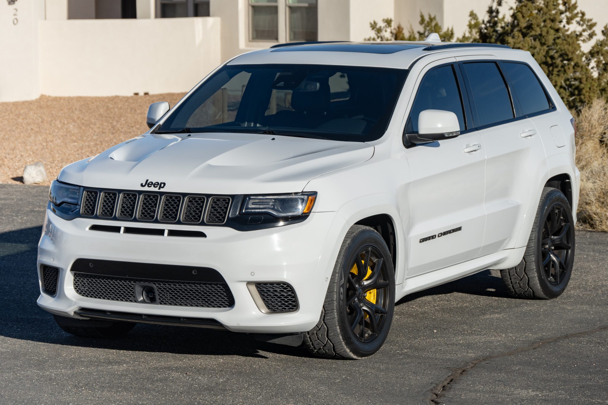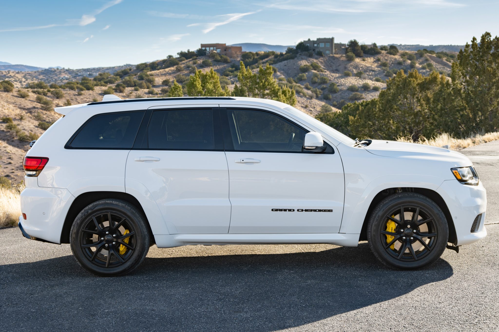Black satin-finished 20″ aluminum wheels are mounted with 295/45 Nitto NT420V tires that were installed in May 2024. The Trackhawk rides on a Bilstein competition suspension with adaptive damping and is equipped with a Selec-Trac system with launch control and five drive modes. Stopping power is provided by yellow-finished six-piston front and four-piston rear Brembo calipers.
