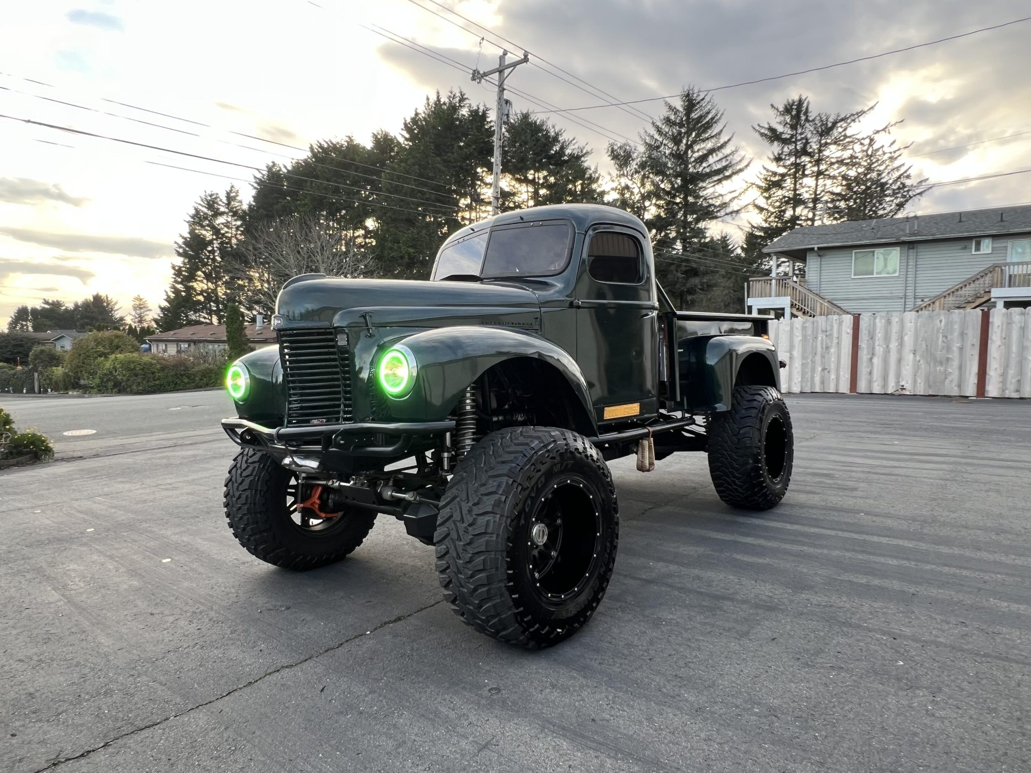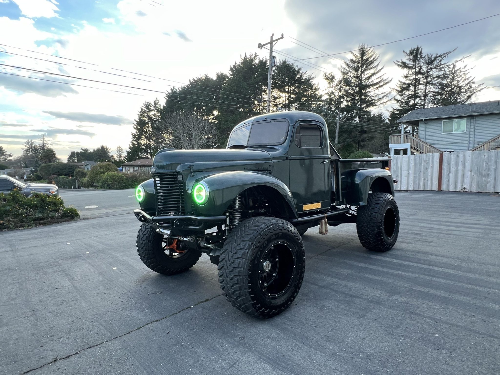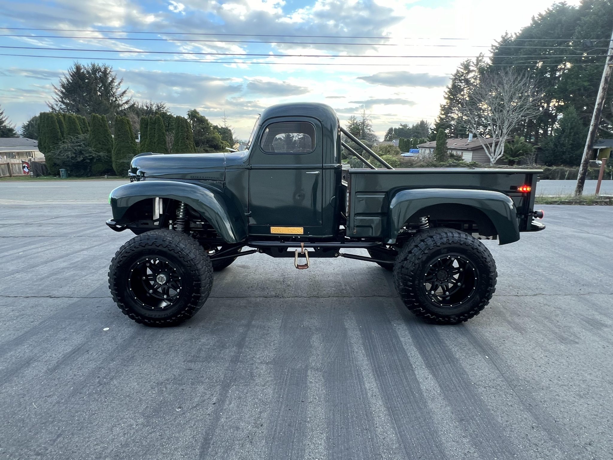 The 20×14″ Fuel Off-Road beadlock wheels are finished in black and are mounted with Toyo M/T Open Country tires. The custom tubular steel frame is finished in black and rides on a 115″ wheelbase. The front and rear suspension features four-link setups with Fox Racing adjustable coilovers and hydraulic bump stops at all four corners. The truck is equipped with hydraulically-assisted steering, and stopping power is provided by Wilwood four-wheel disc brakes.