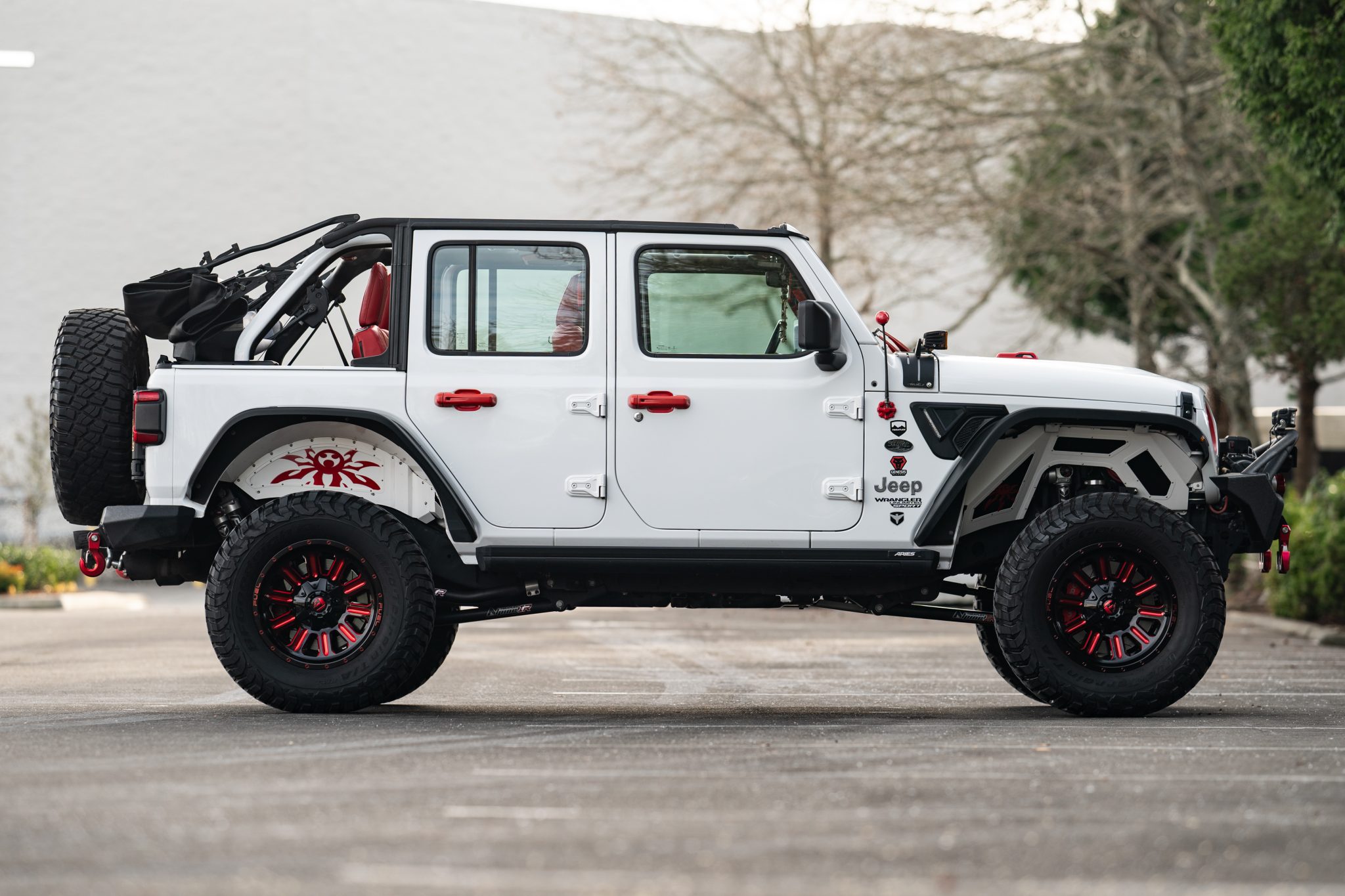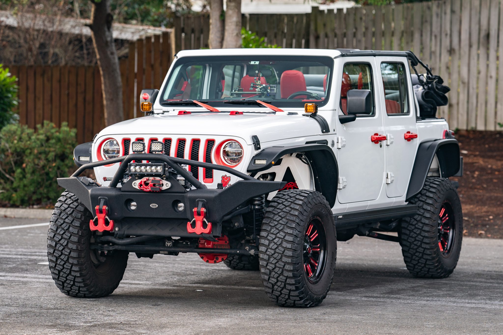 Black and red 18″ Fuel Offroad Hardline wheels are mounted with 35×12.5″ BFGoodrich Mud-Terrain T/A KM3 tires. Stopping power is provided by four-wheel disc brakes.