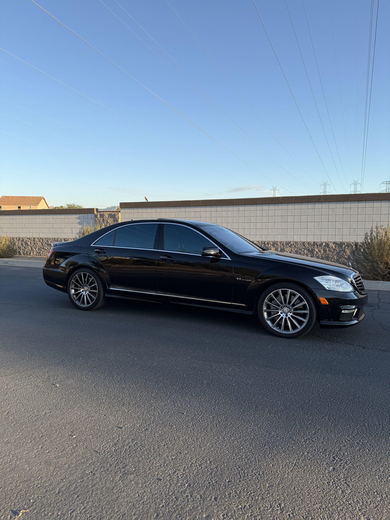 The 20″ multi-spoke wheels were sourced from a later model and are mounted with Michelin tires. The car is equipped with an AMG-tuned Active Body Control (ABC) electronically adjustable suspension. Braking is handled by AMG-branded calipers over four-wheel cross-drilled and vented disc brakes. A brake fluid flush was performed in September 2024, and replacement front tires were reportedly mounted in November 2024. Multiple wheels have curb damage.