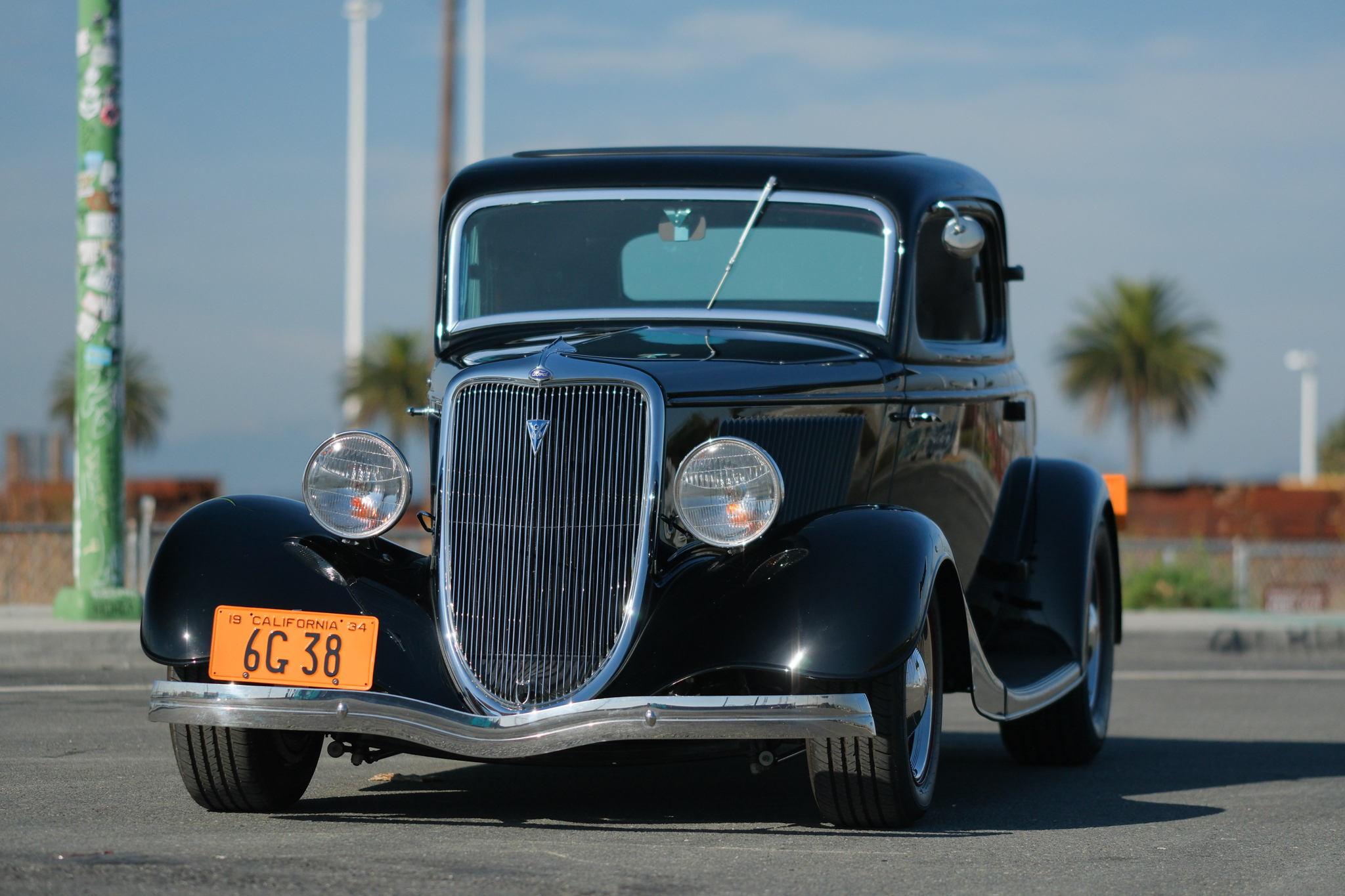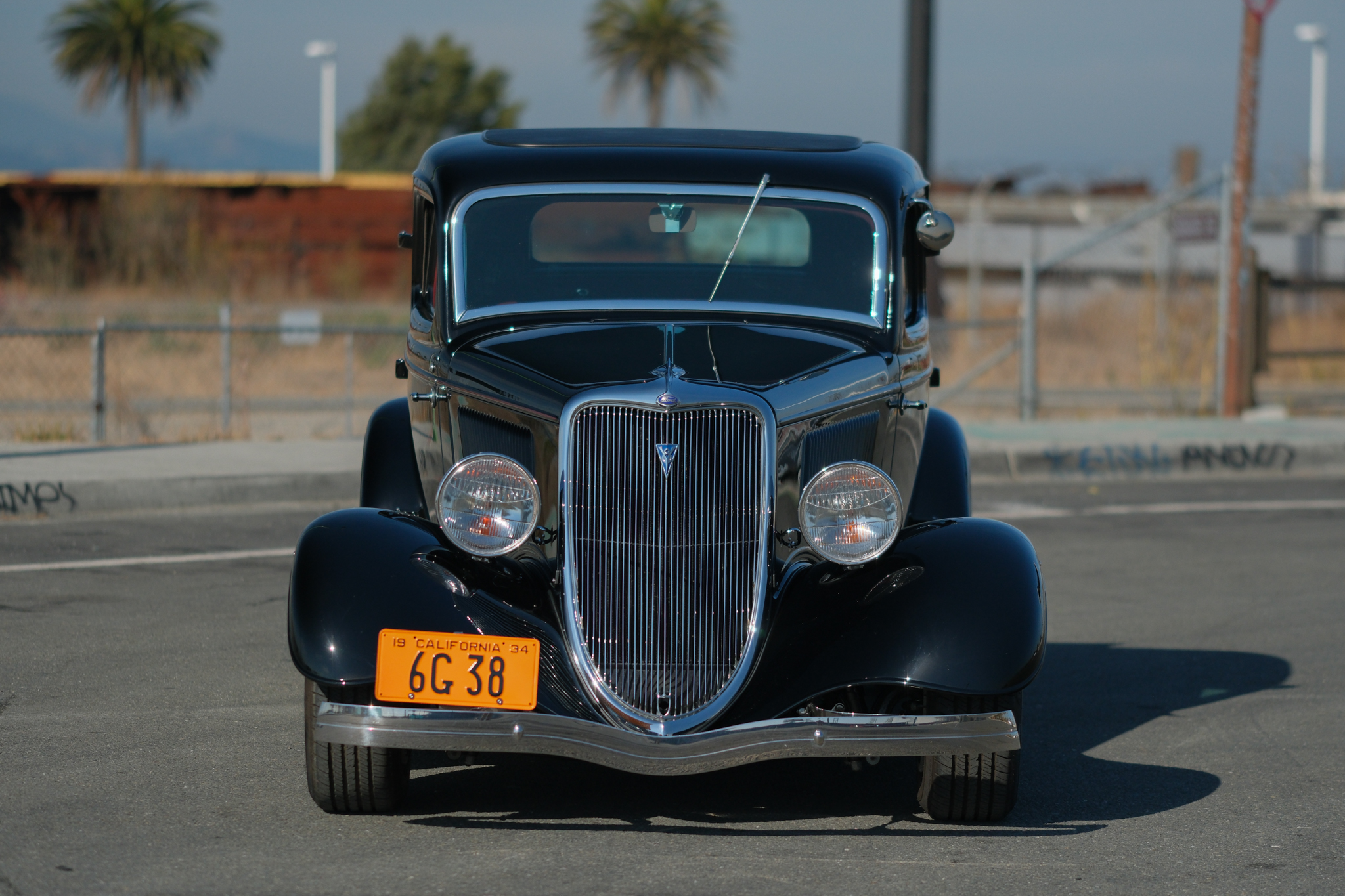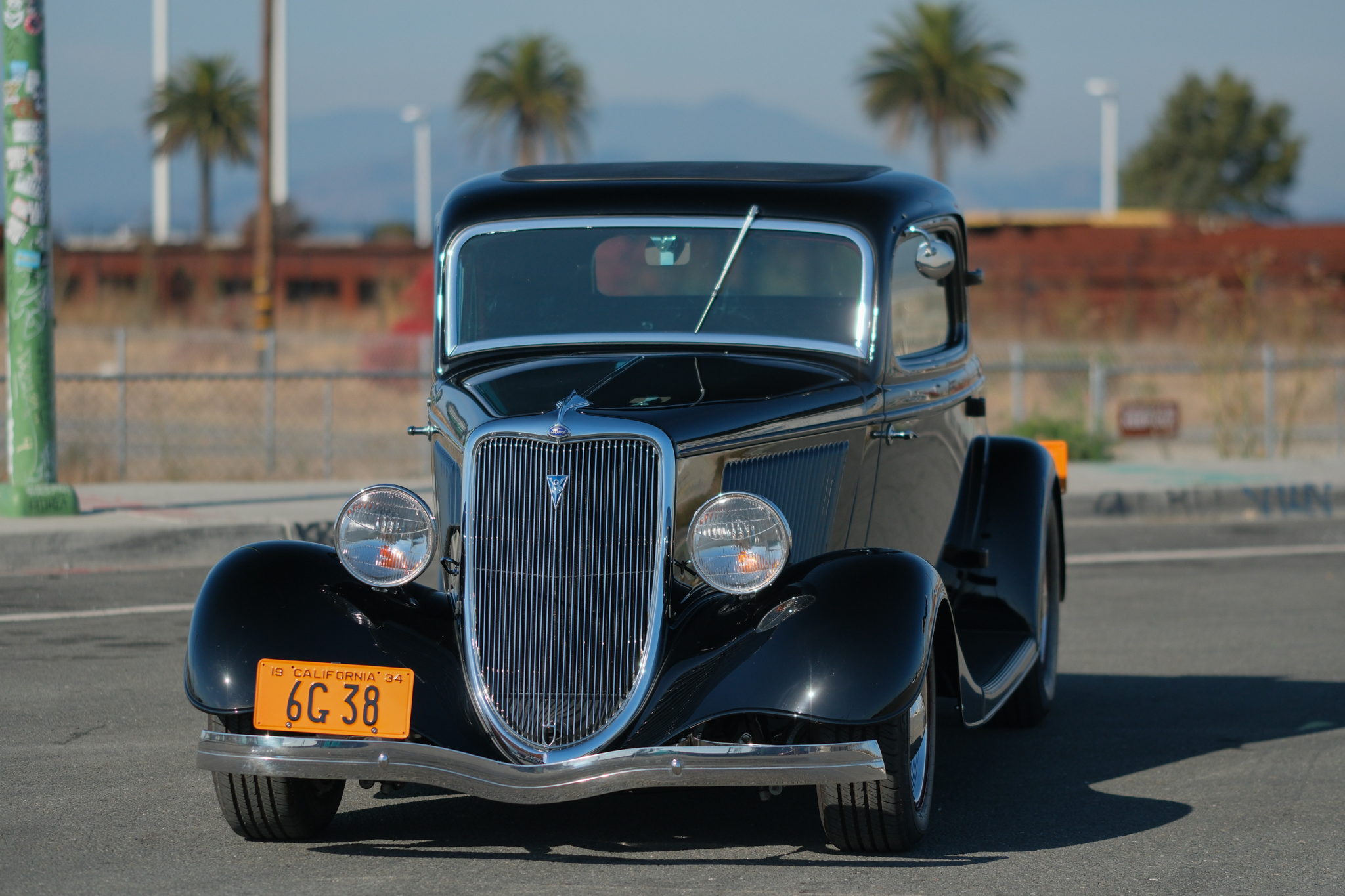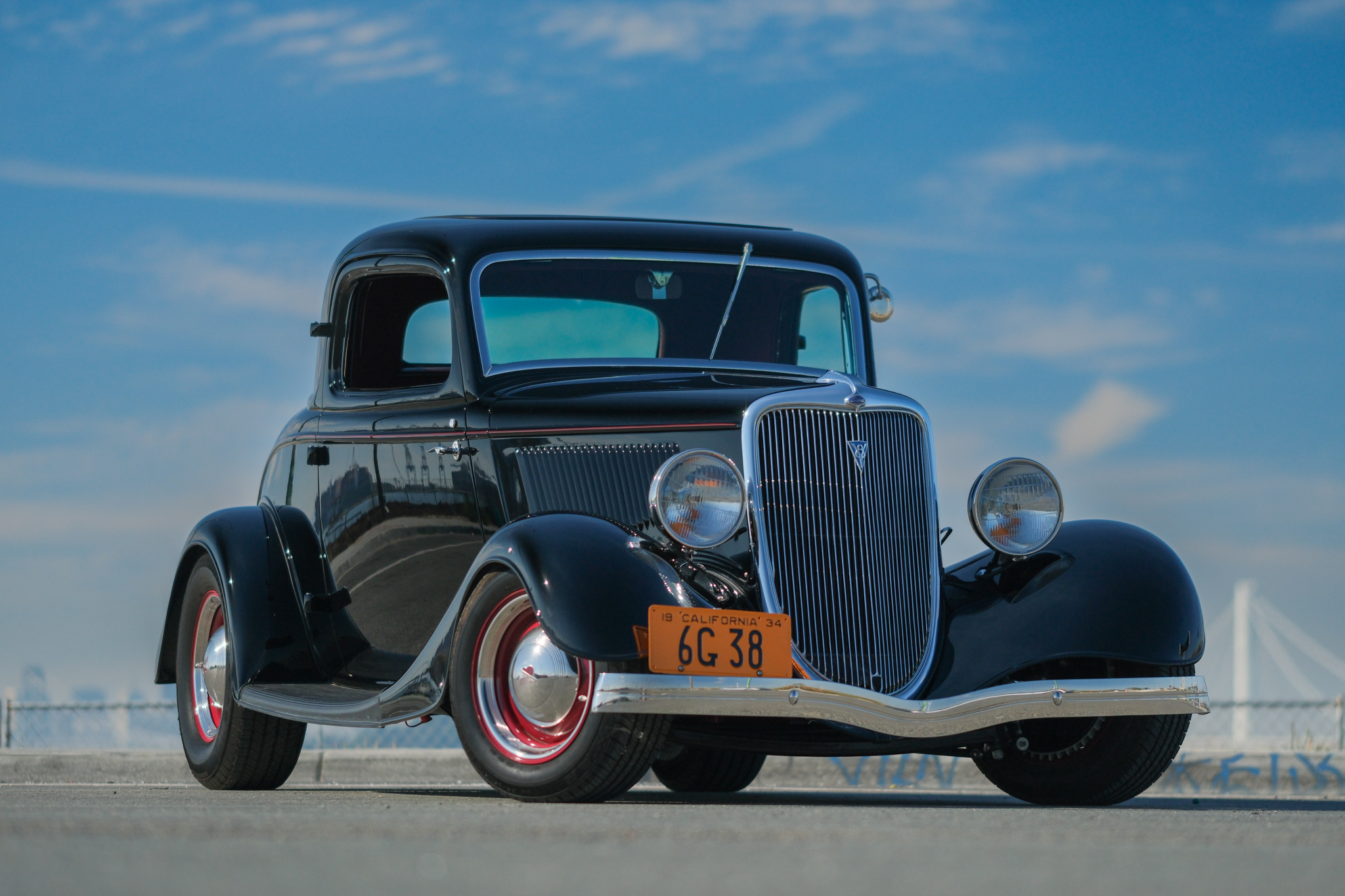 Red-finished 15” front and 16” rear steel wheels have polished hubcaps and trim rings and are mounted with 195/65 and 245/70 Goodyear Eagle LS tires, respectively. The car rides on transverse leaf springs, and the dropped front axle was powder-coated along with the radius rods. A Vega steering box was installed, and braking is handled by finned aluminum drums at all four corners assisted by a booster mounted below the floor.