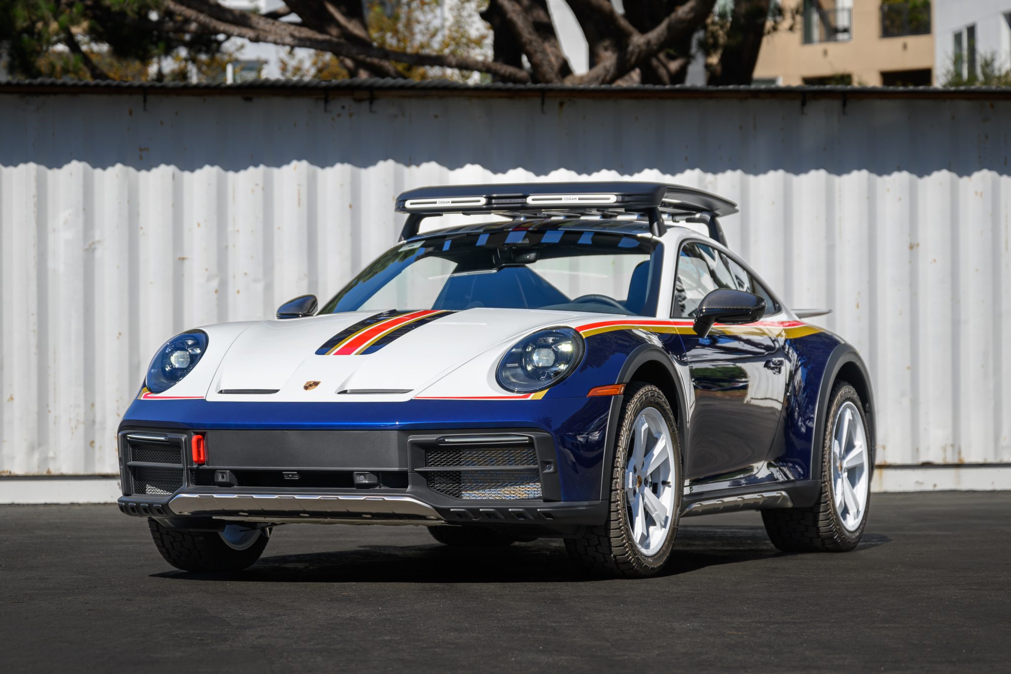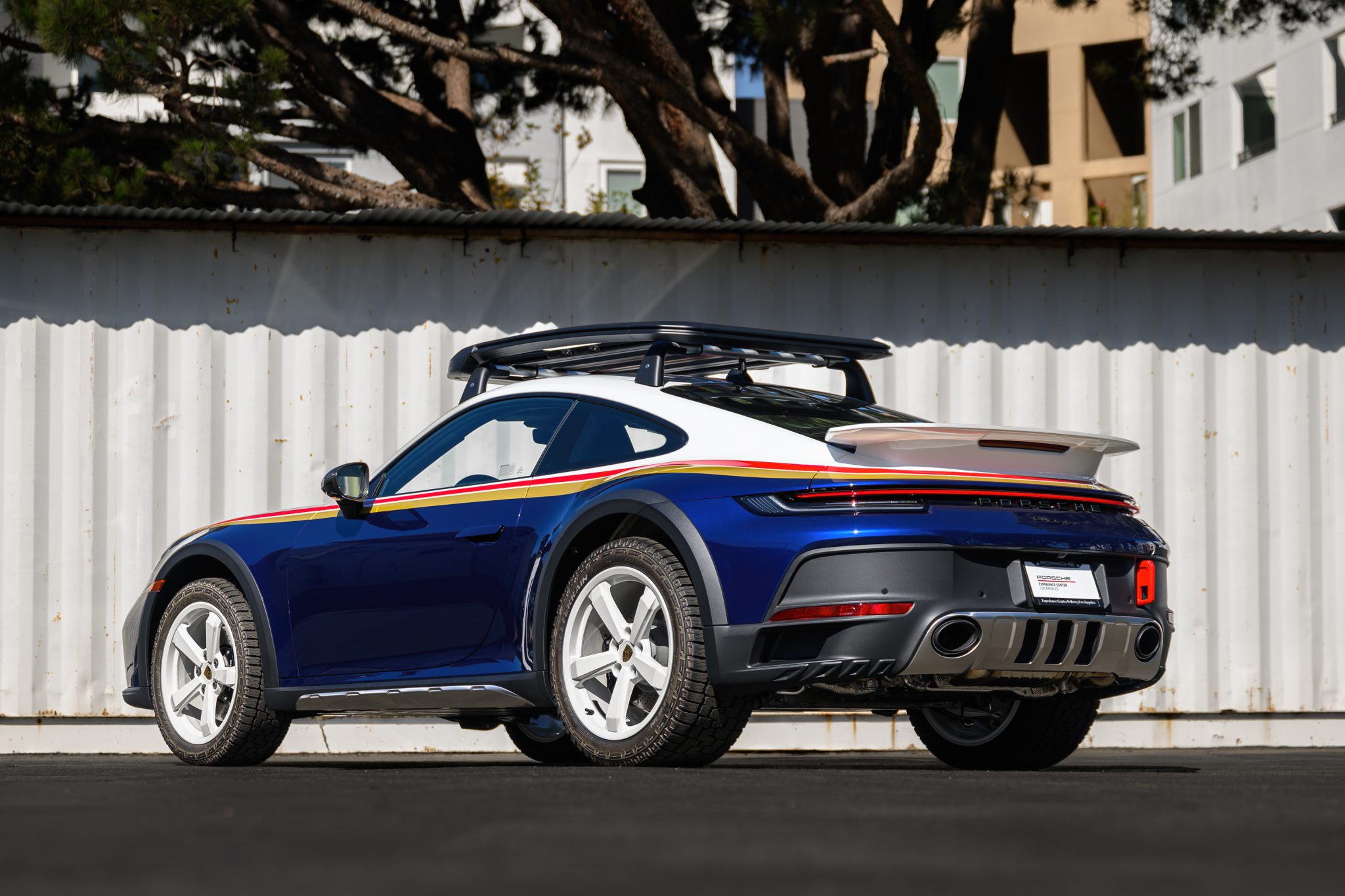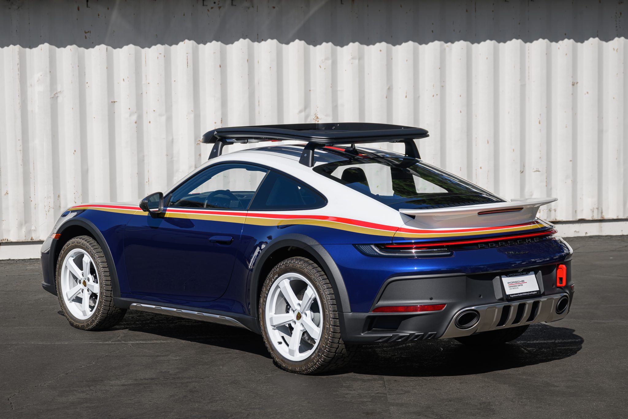 This example is finished in white and Gentian Blue Metallic with Rallye Design graphics and features model-specific stainless-steel front and rear skid plates, a carbon-fiber front hood with stainless-steel vents, a carbon-fiber fixed rear spoiler, 911 Dakar puddle lamps, black rocker-panel cladding with inset stainless-steel guard plates, black wheel-arch extensions, lightweight glass, red front and rear tow hooks, and Exclusive Design tailpipes. Additional exterior details include LED headlights as well as fog lights, front and rear parking sensors, and a roof rack that houses Porsche-branded accessories, which are included in the sale. Paint protection film has been applied to the exterior, and the windshield has received Nano-Ceramic protection.