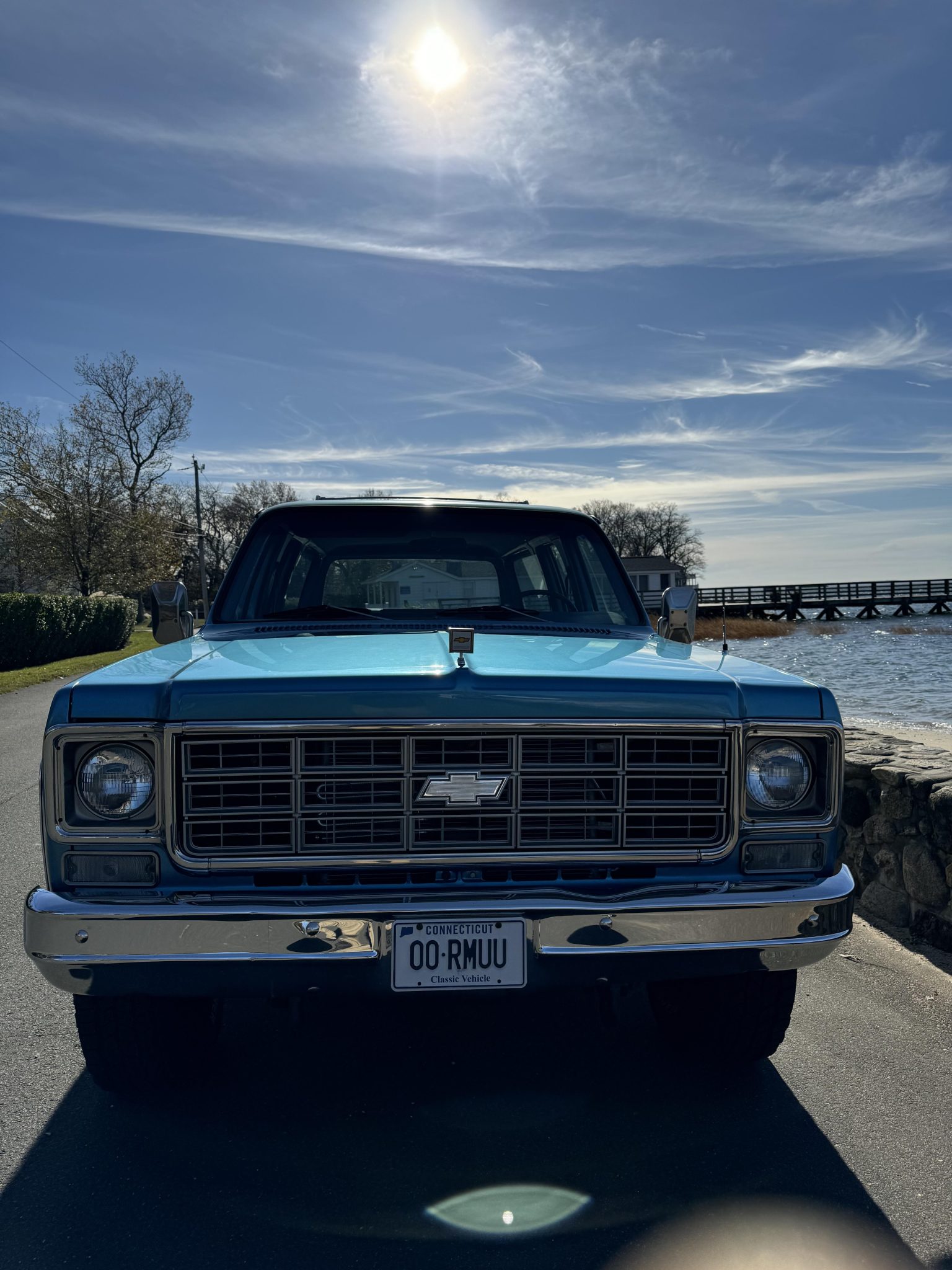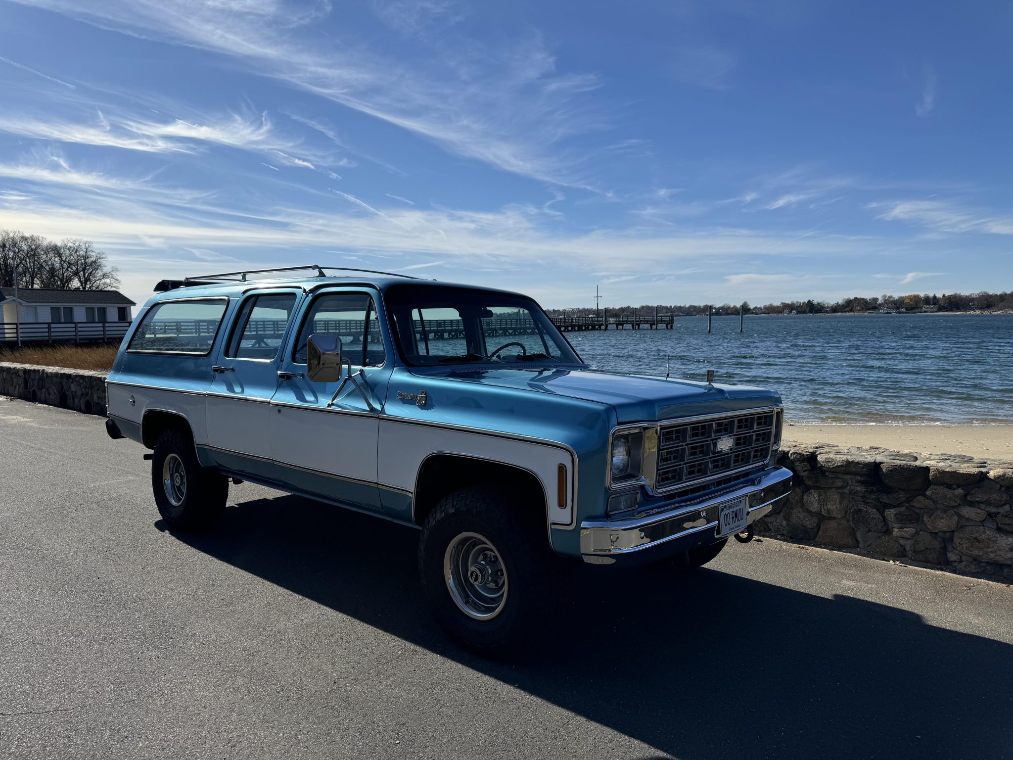 Steel 15″ wheels wear trim rings and are wrapped in 33×12.5″ Cooper Discoverer AT3 XLT tires installed under current ownership. Factory equipment includes power steering and power disc brakes up front with drums out back. A covered spare tire is mounted in the cargo area. A lift kit was removed and replacement shocks, ball joints, leaf springs, wheel studs, tie rods and sleeves, and leaf spring U-joints and bushings were installed during the 2023-2024 refurbishment.