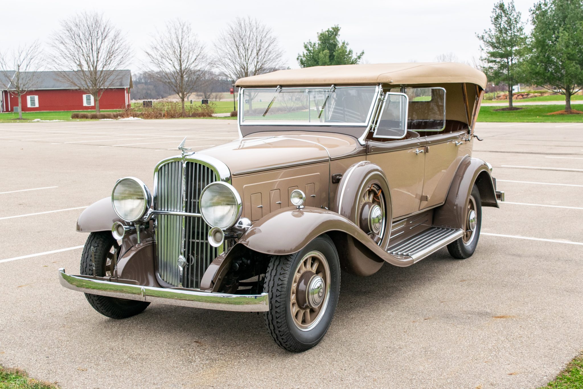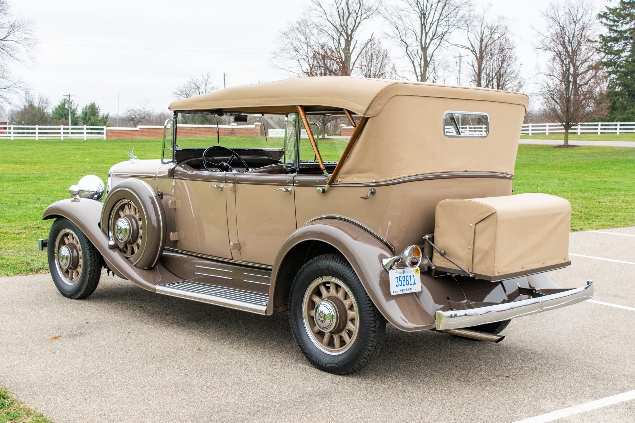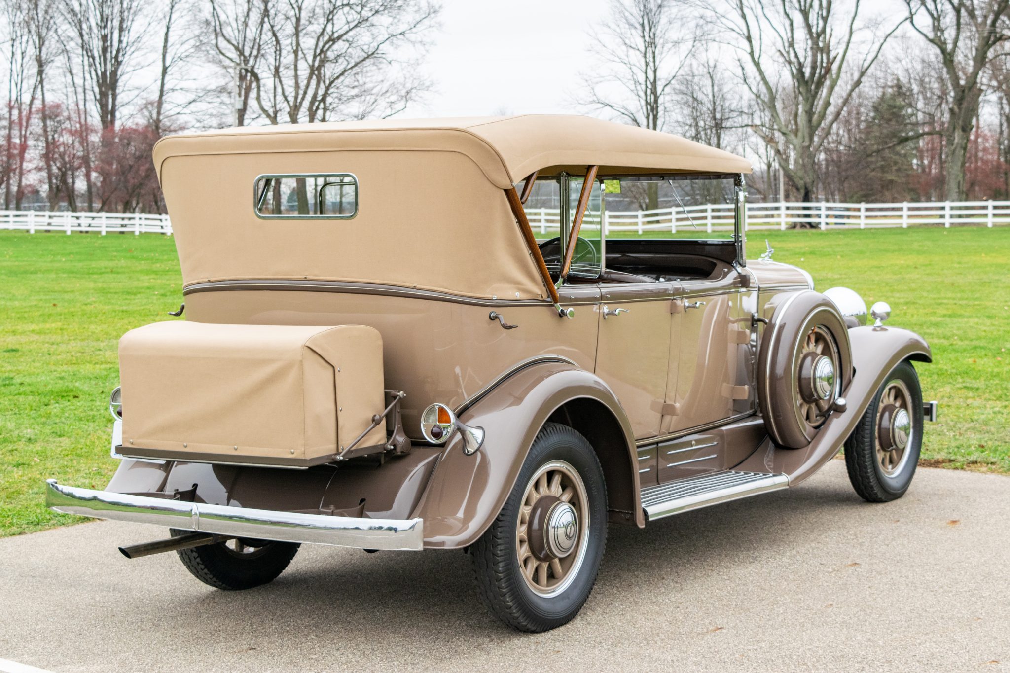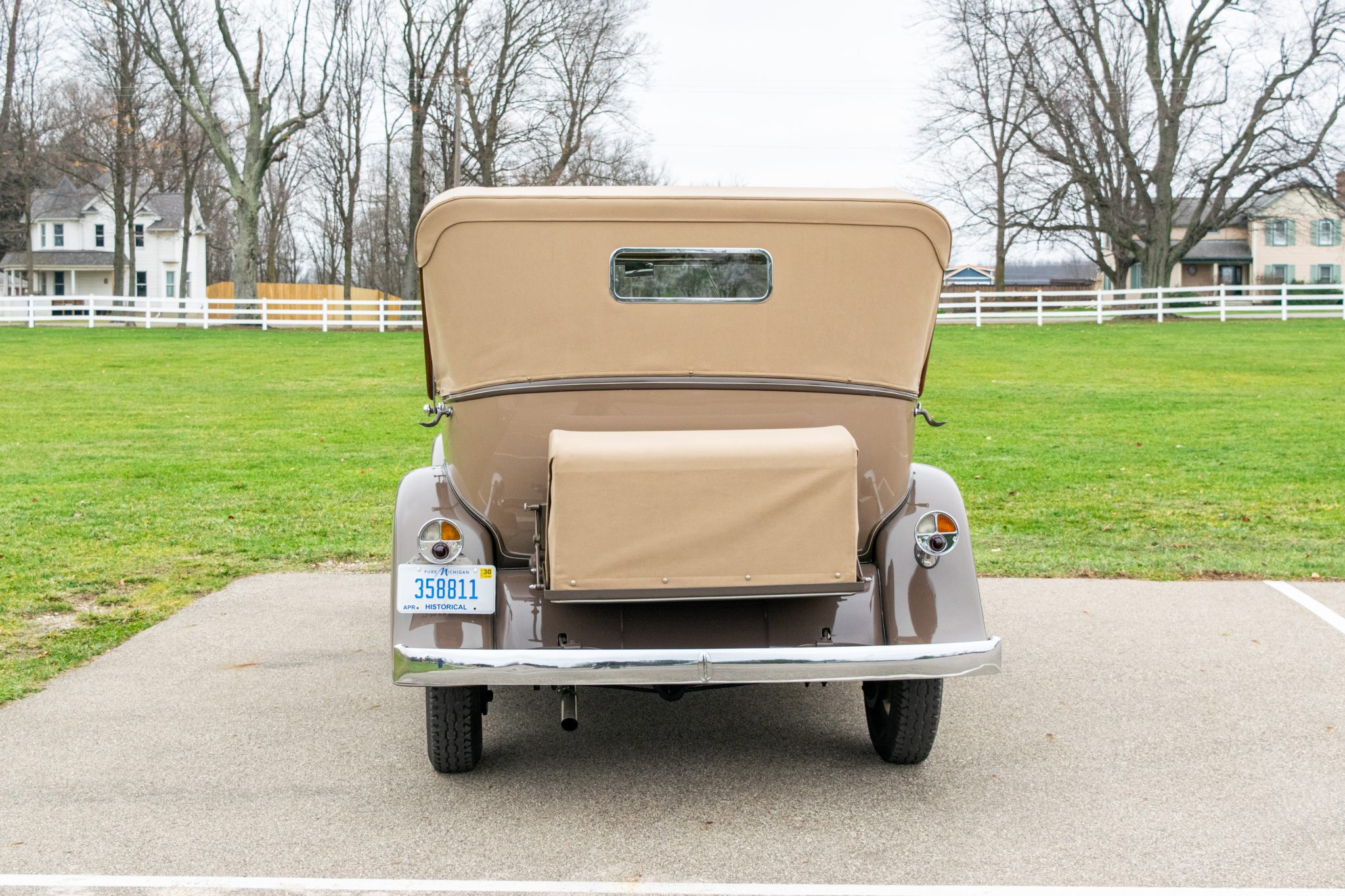 Body-color wood-spoke wheels wear polished Franklin-branded hubcaps with brown accents and beige pinstriping, and they are mounted with 6.50–19 Custom Classic bias-ply tires. Matching spares are stowed under brown metal covers in the front fenders. The Airman rode on a 132″ wheelbase and featured tubular axles as well as front and rear fully elliptical leaf springs. The four-wheel hydraulic drum brakes were serviced in preparation for the sale with the installation of replacement wheel cylinders and brake hoses as well as a rebuild of the master cylinder.