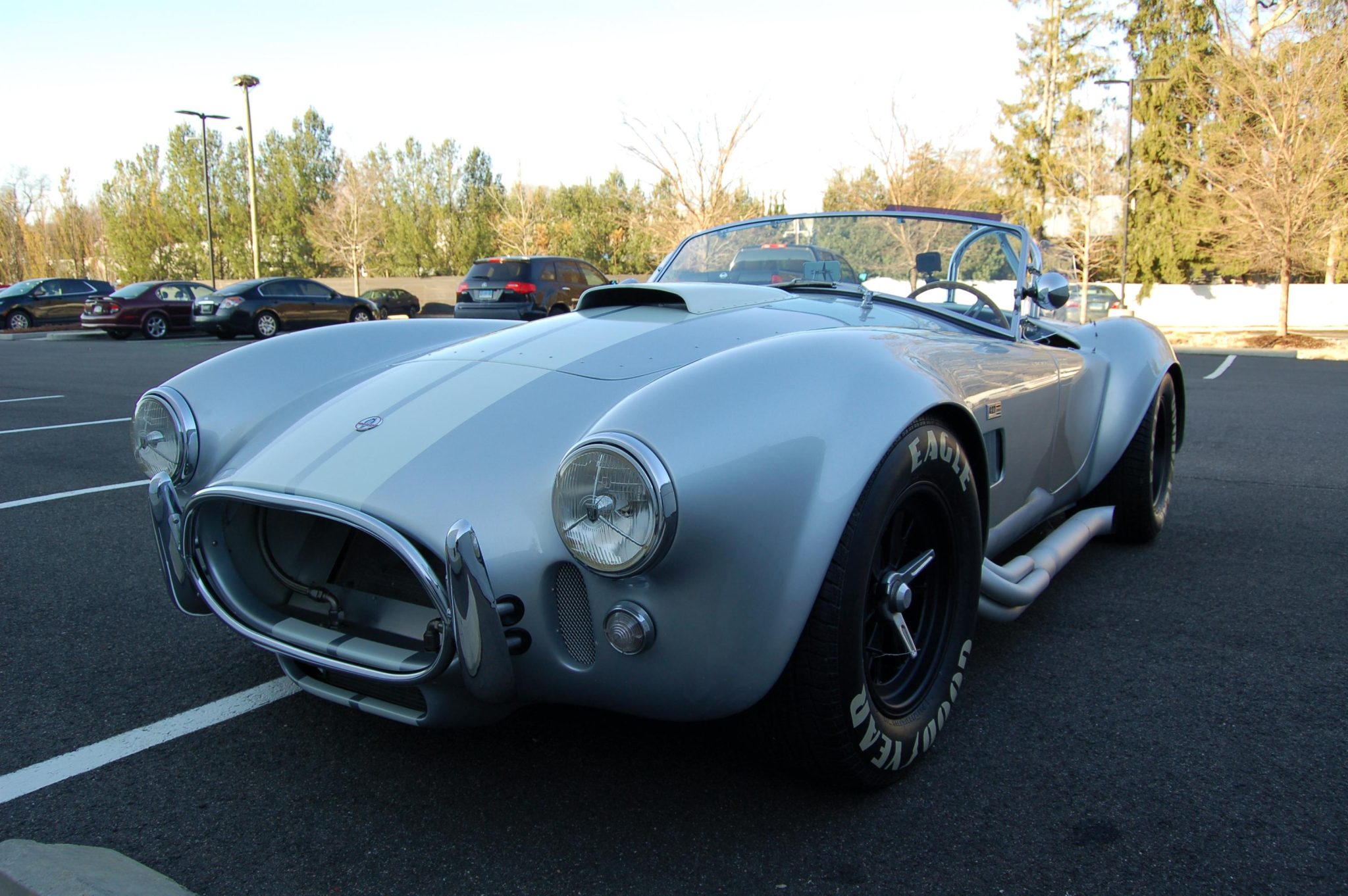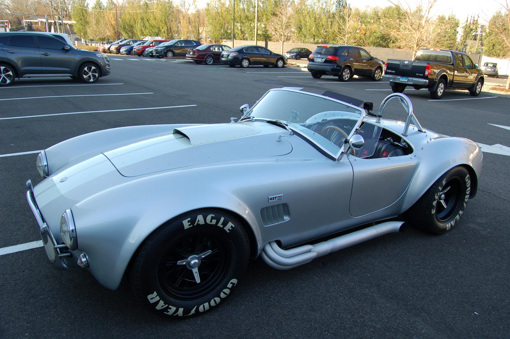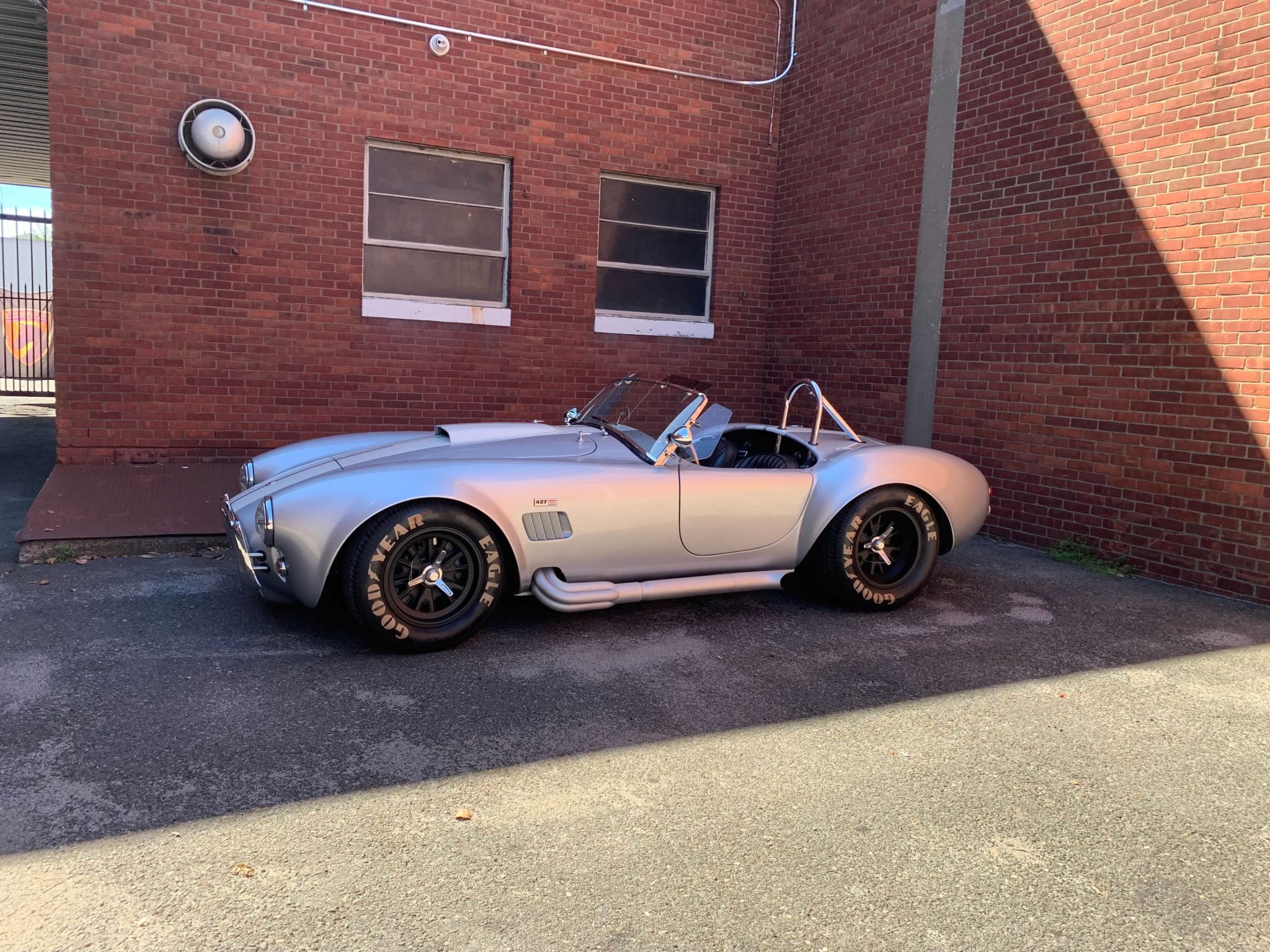 Halibrand-style 15″ wheels are secured with safety-wired three-eared knockoffs and are mounted with a mixed set of tires wearing Goodyear billboard-style lettering. The car is equipped with rack-and-pinion steering and adjustable coilovers as well as four-wheel independent suspension, Wilwood front calipers, and outboard rear disc brakes.