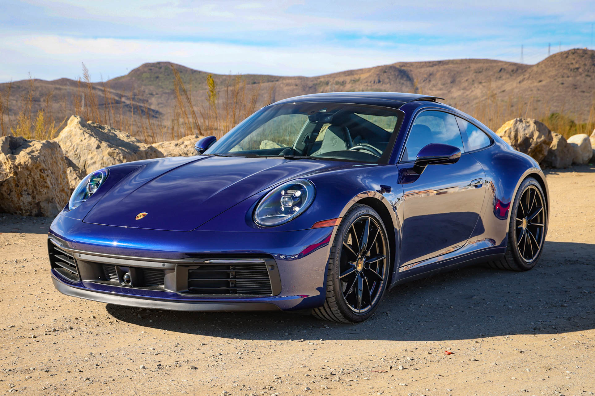 The 20″ and 21″ Carrera S wheels are mounted with Goodyear Eagle F1 tires. The car is equipped with Power Steering Plus, rear-axle steering, and Porsche Active Suspension Management (PASM). Braking is handled by black-finished Porsche-script calipers over cross-drilled and ventilated rotors.