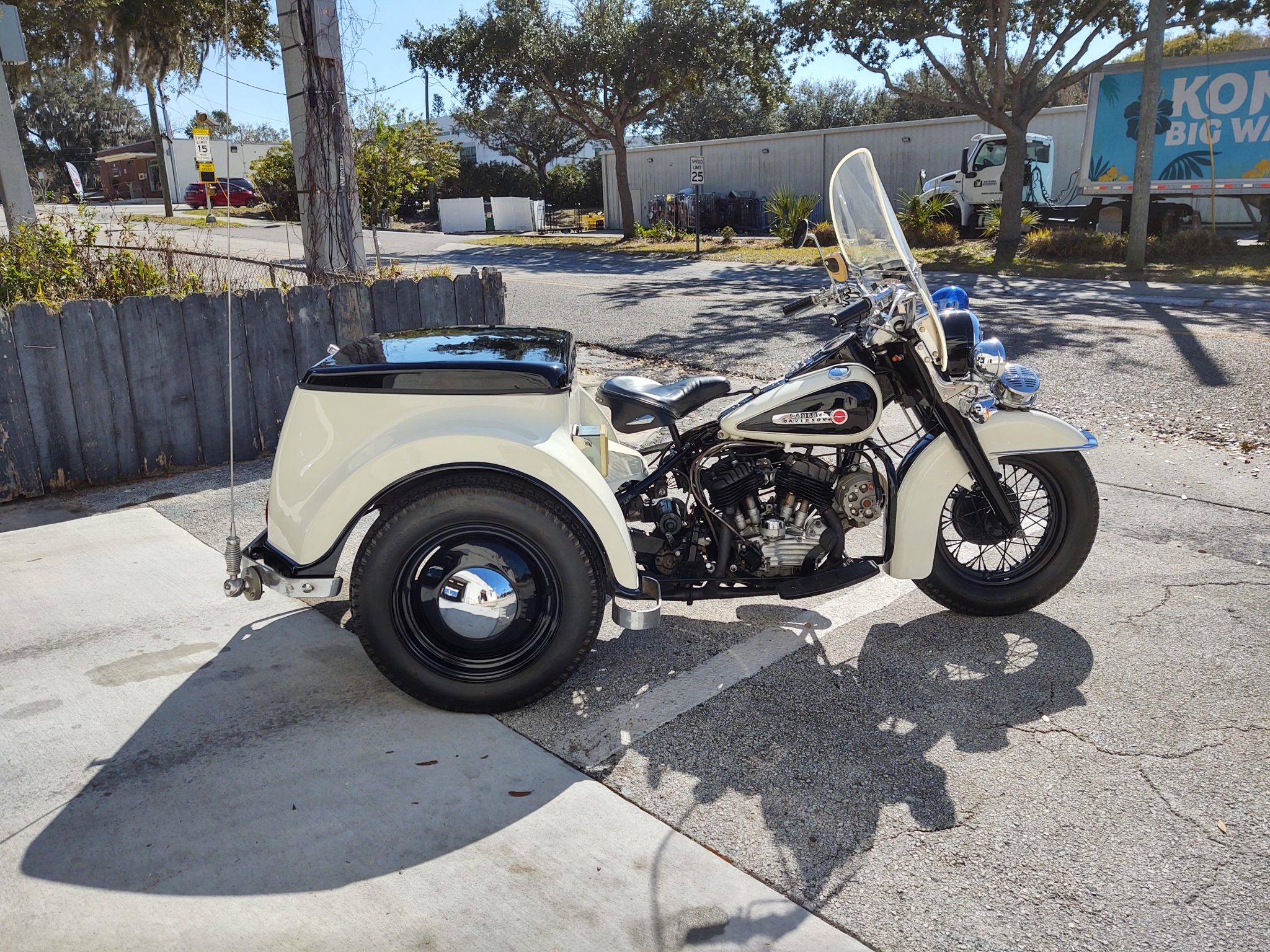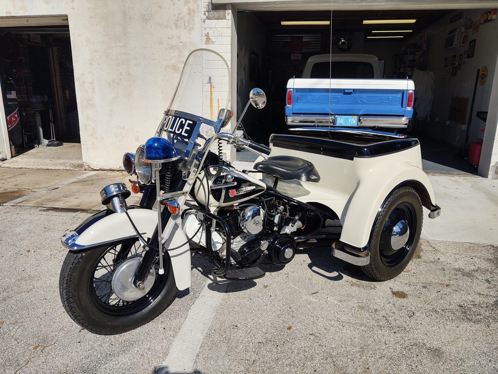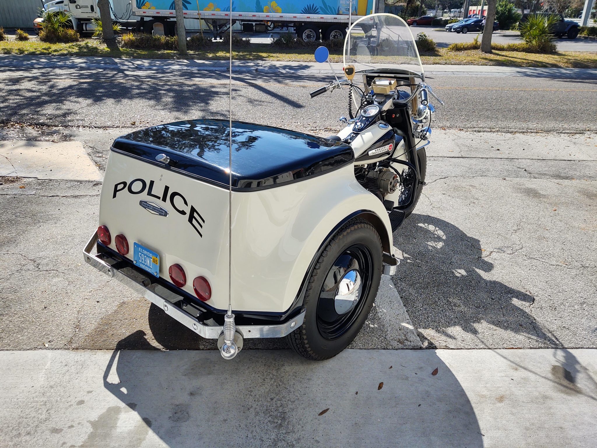 A 16″ wire-spoke wheel is fitted up front, and the rear axle carries 16″ steel wheels wearing chrome smoothie hubcaps. All three are finished in black and mounted with Avon Safety Mileage MKII tires. Suspension consists of a Hydra Glide fork up front while the box rides on a combination of leaf and coil springs and hydraulic dampers. Braking is provided by a drum at each wheel.