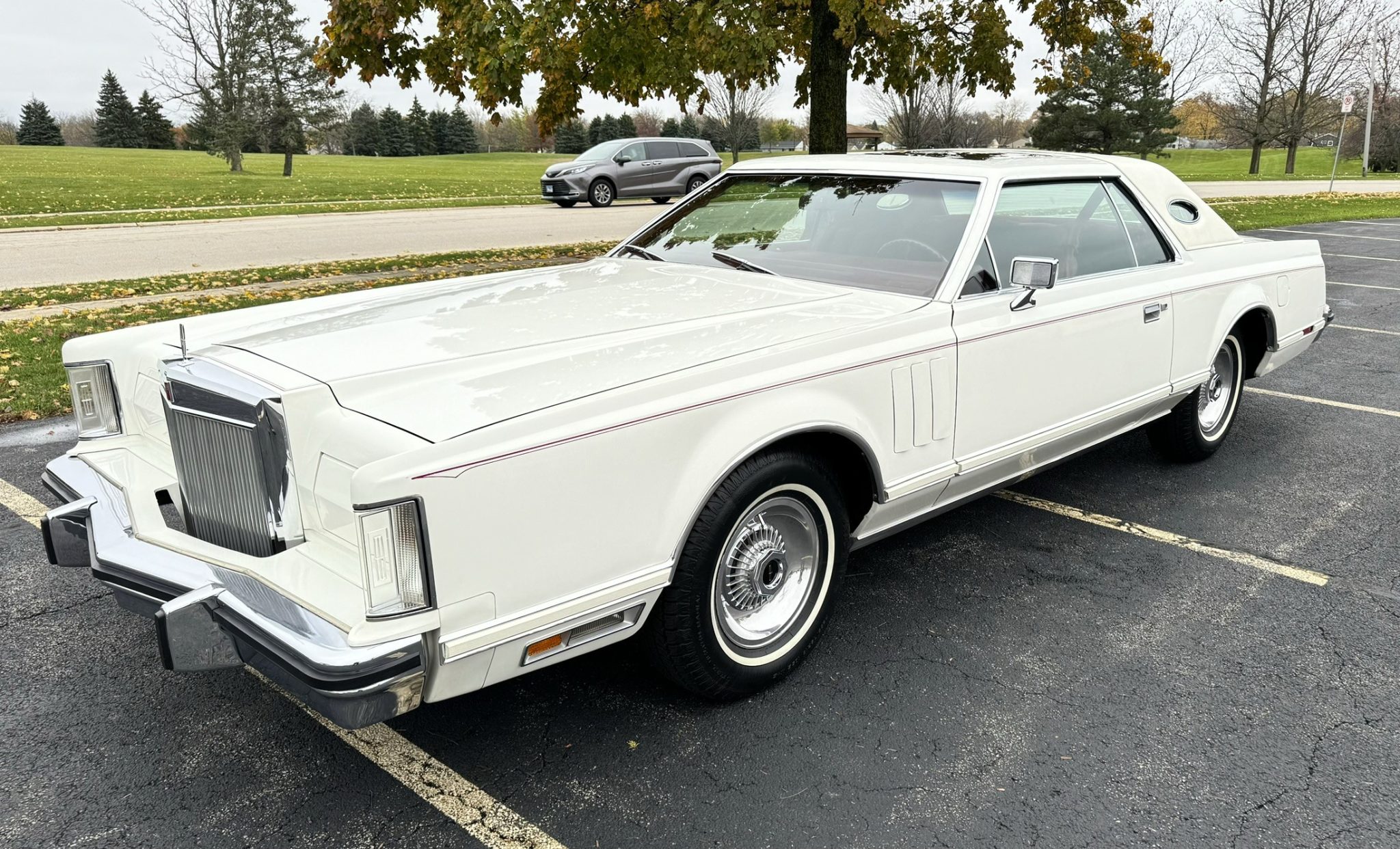 The 15″ forged aluminum wheels are mounted with 235/75 thin-whitewall tires. The seller reports replacing the steering rag joint, Pitman arm seal, rear shock absorbers, and fluids for the car’s power steering and four-wheel disc brakes.